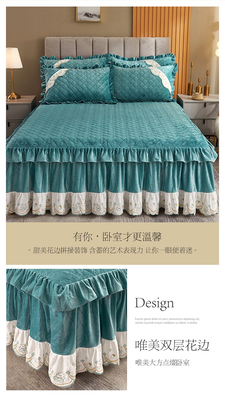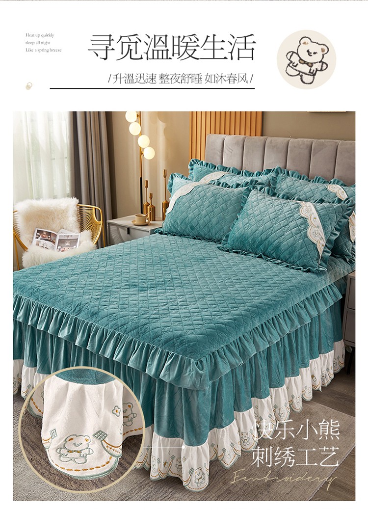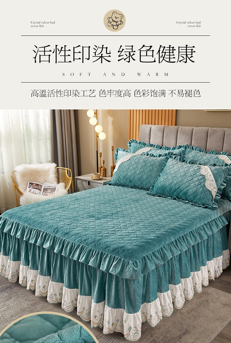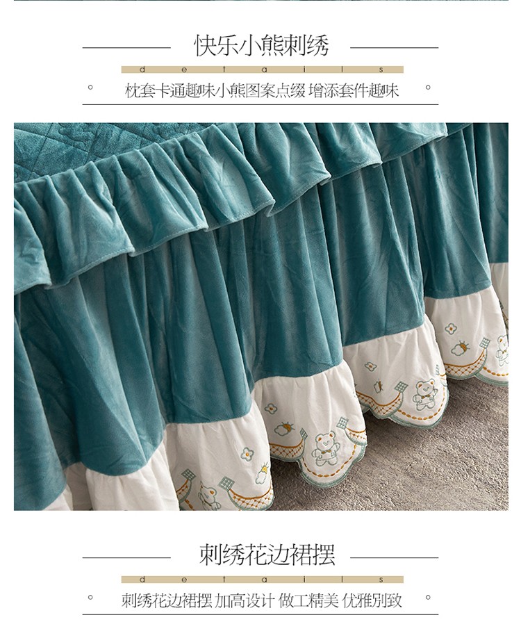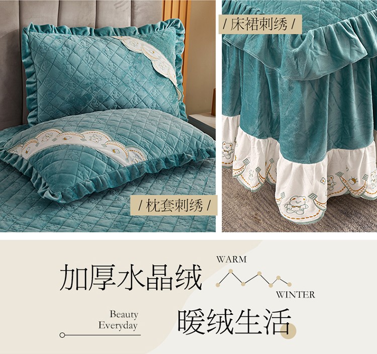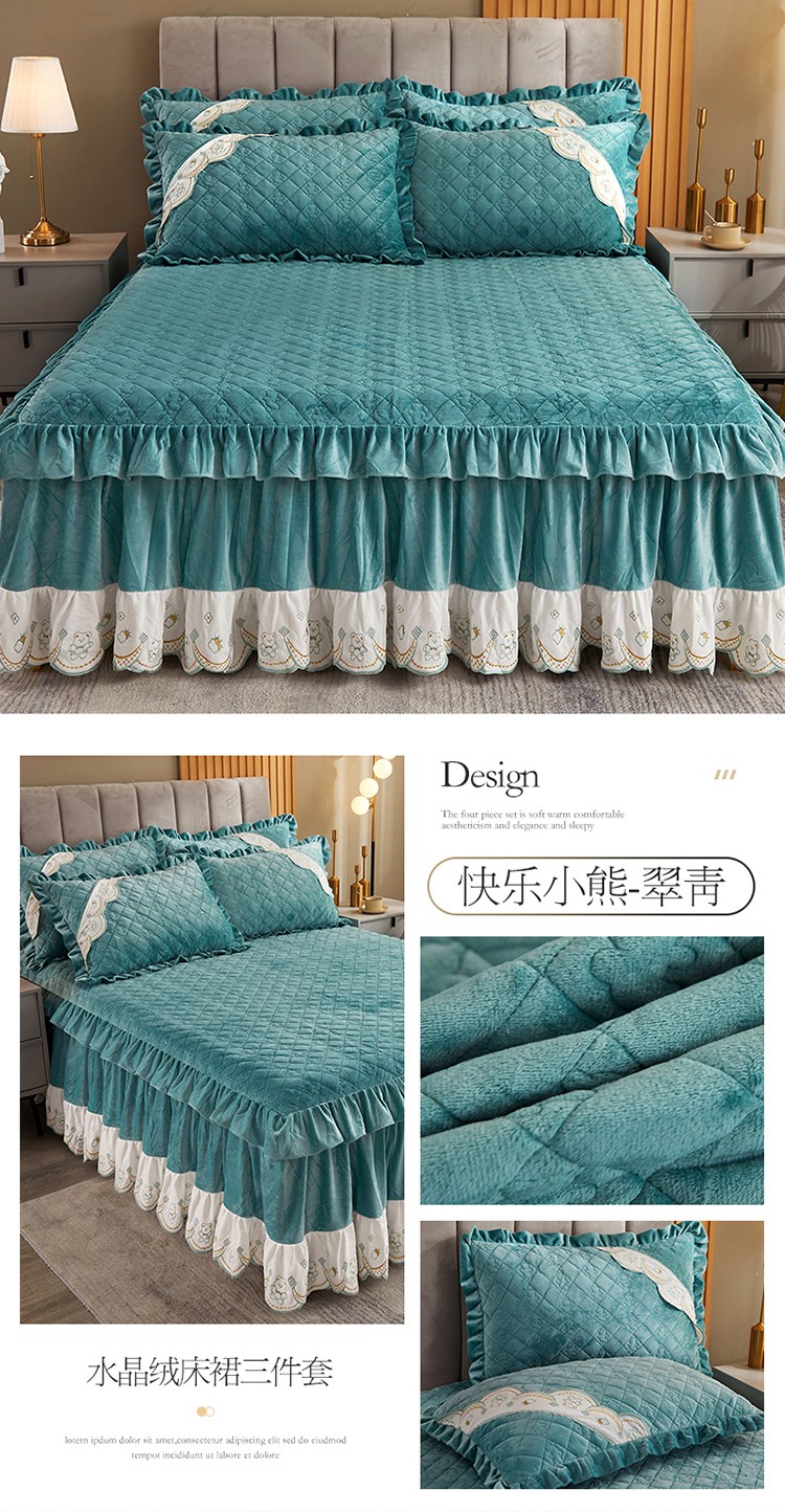 商品名称:宜凡家纺 2021新款水晶绒夹棉绗缝床裙三件套快乐小熊-翠青