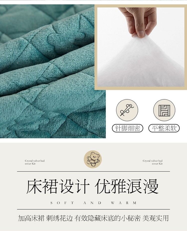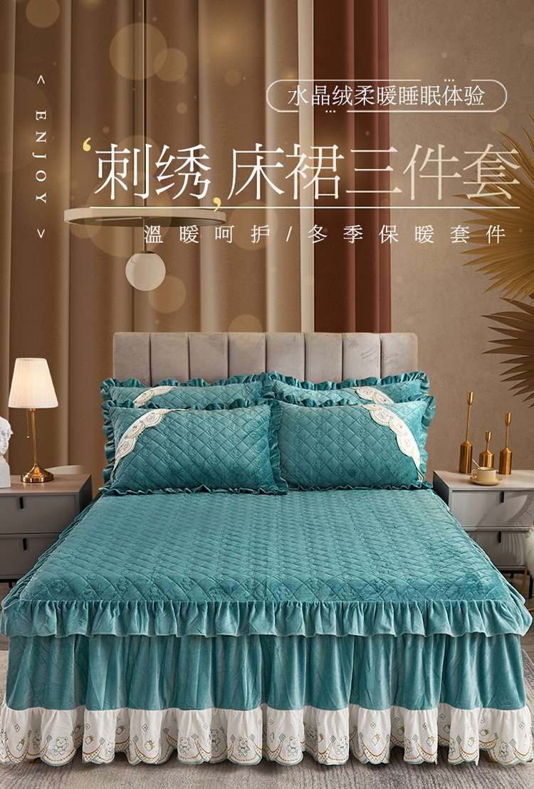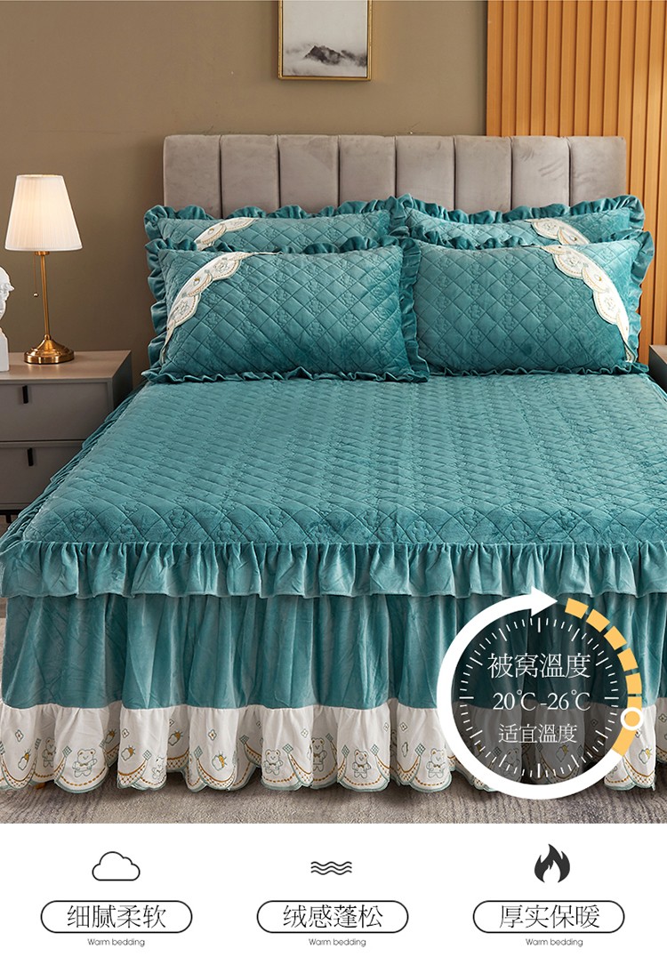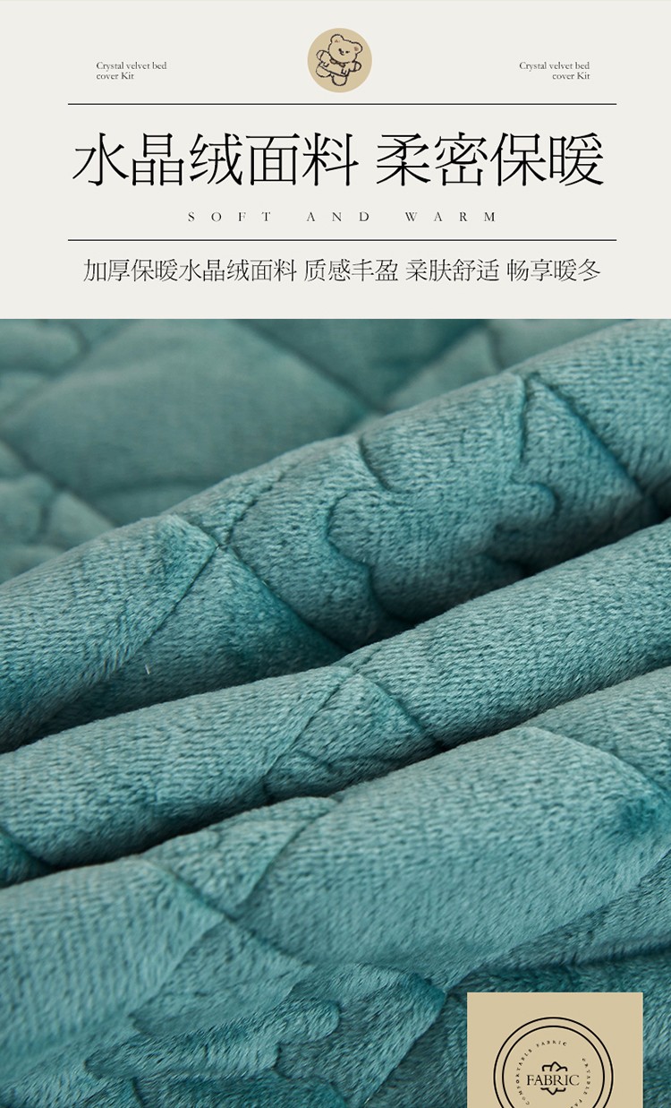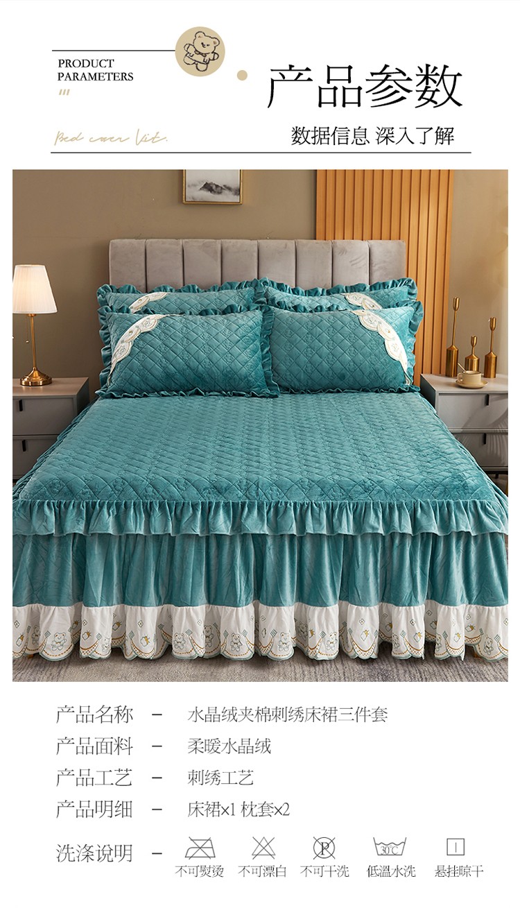 商品名称:宜凡家纺 2021新款水晶绒夹棉绗缝床裙三件套快乐小熊-翠青