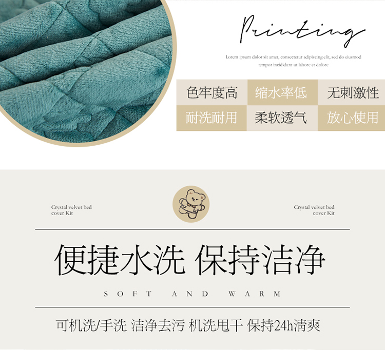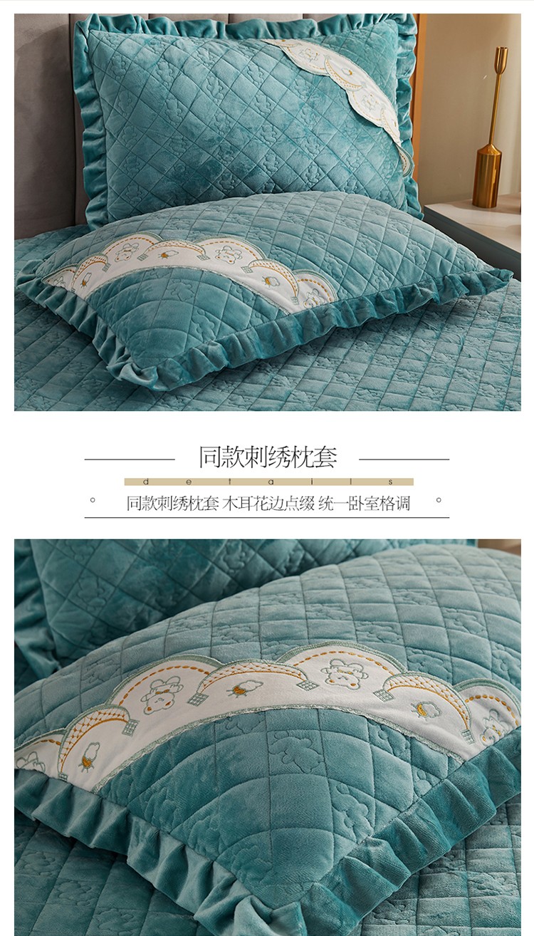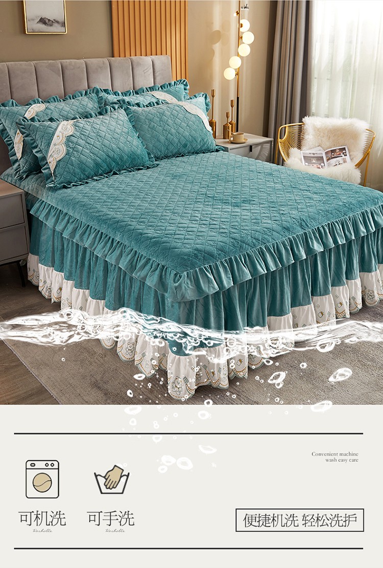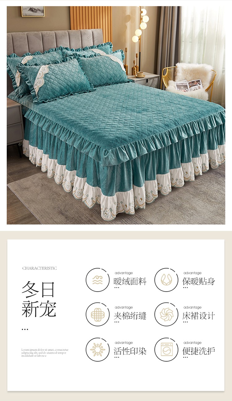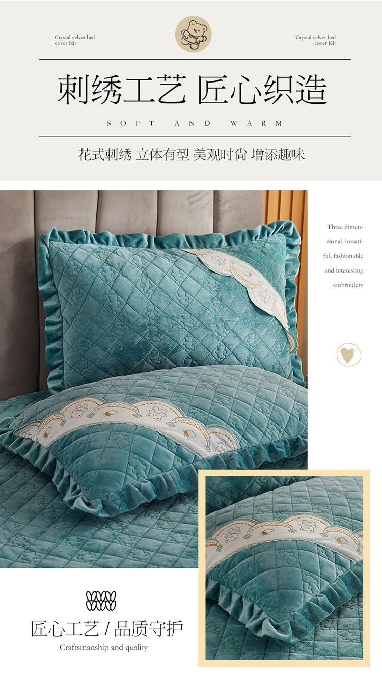 商品名称:宜凡家纺 2021新款水晶绒夹棉绗缝床裙三件套快乐小熊-翠青