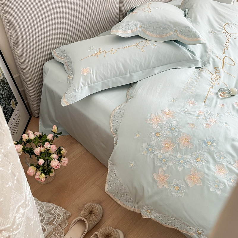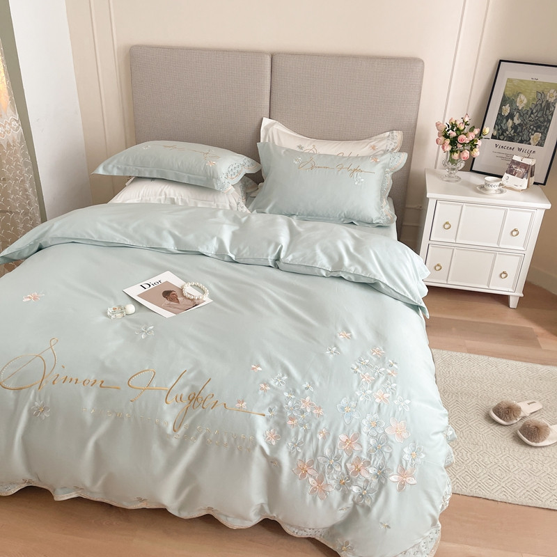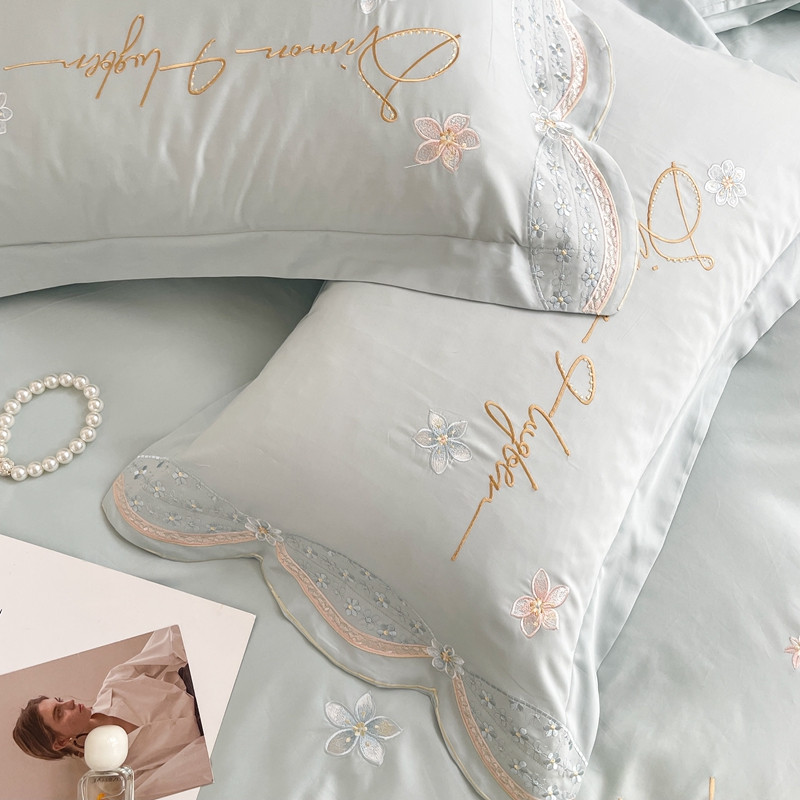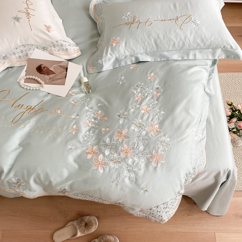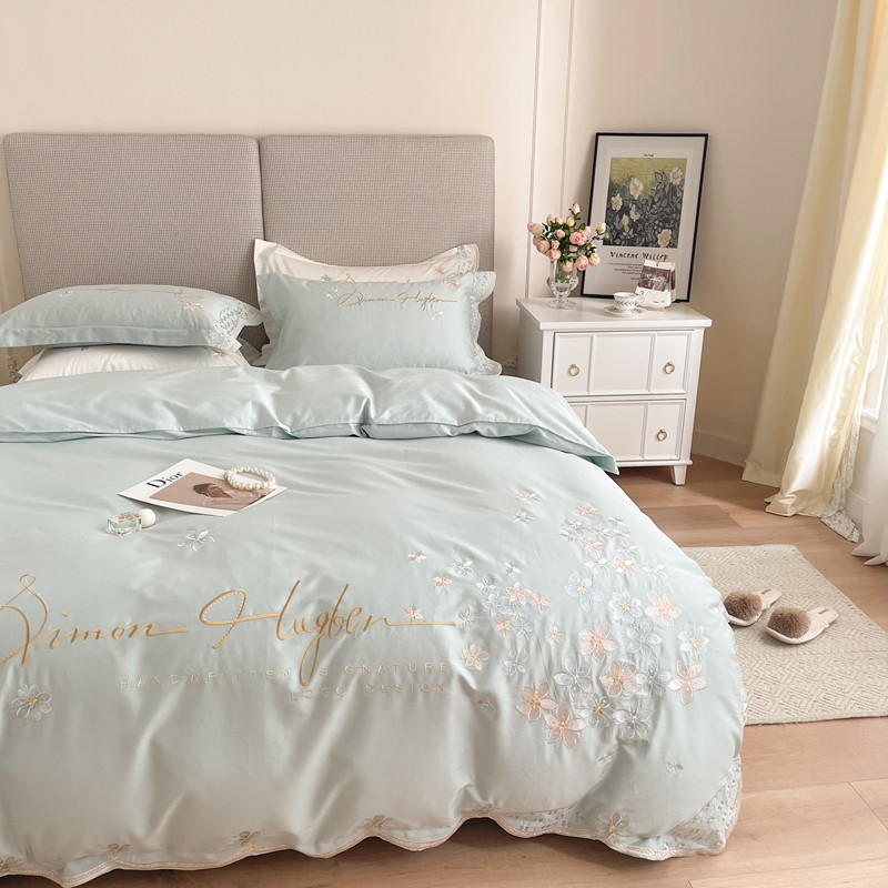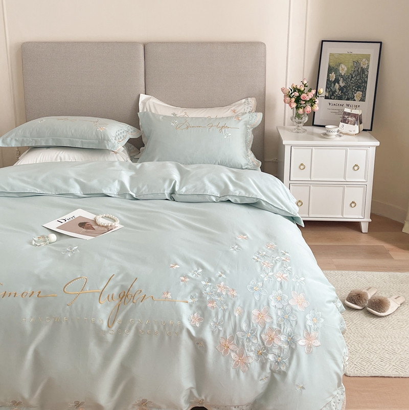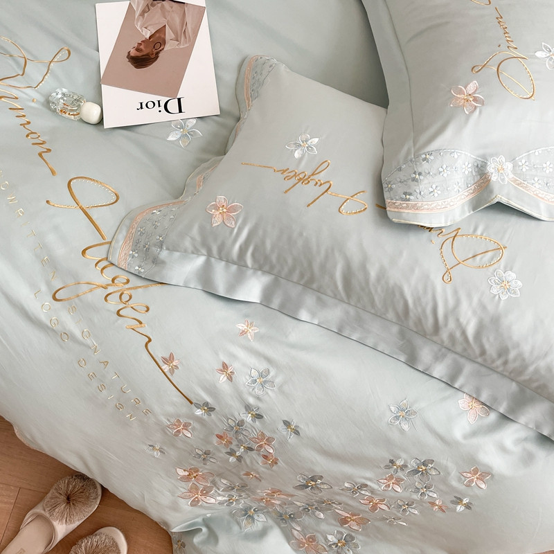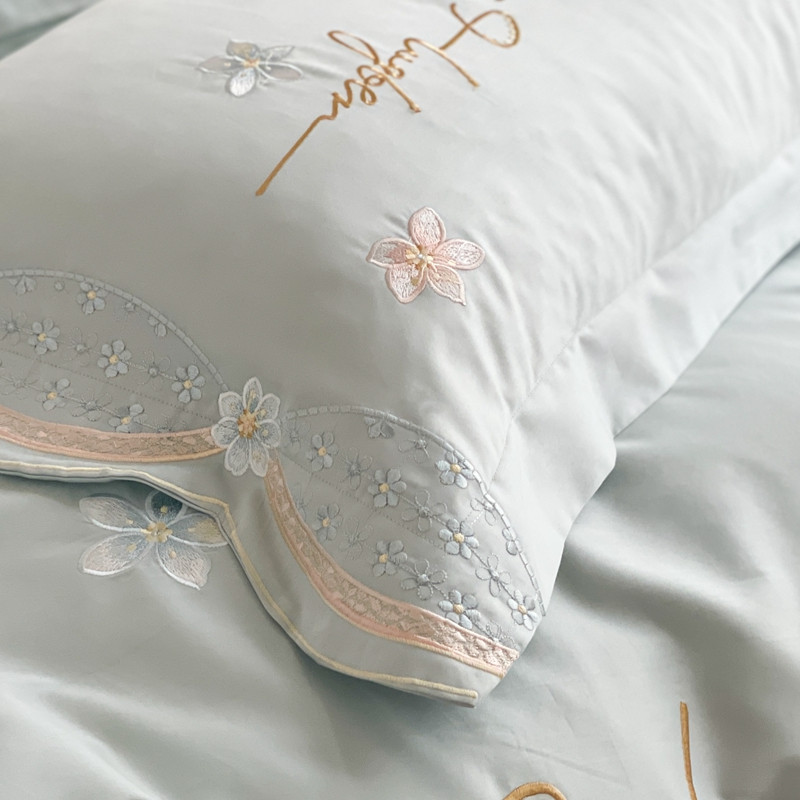 柚子2021新款高端100支澳棉贡缎刺绣四件套月夜迷迭星冰绿