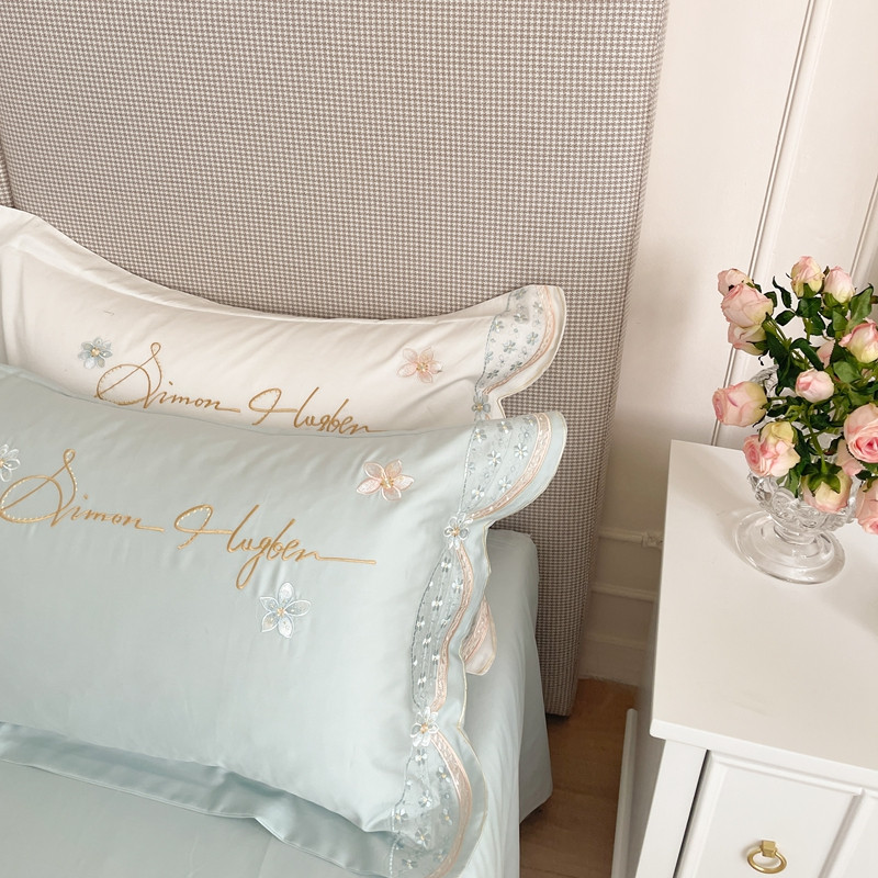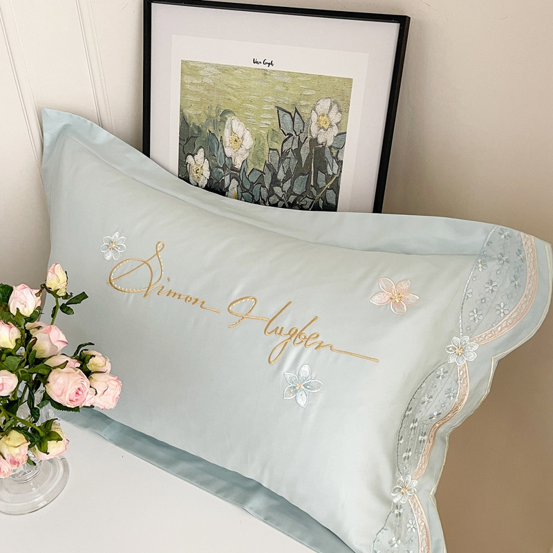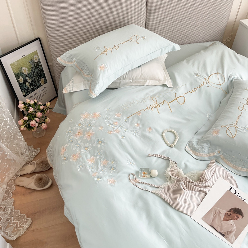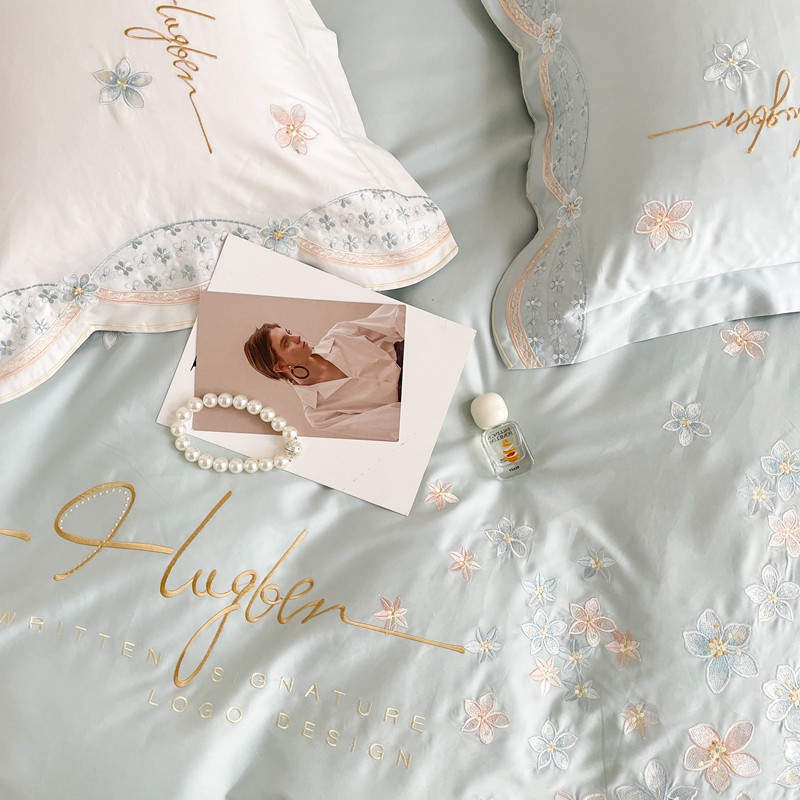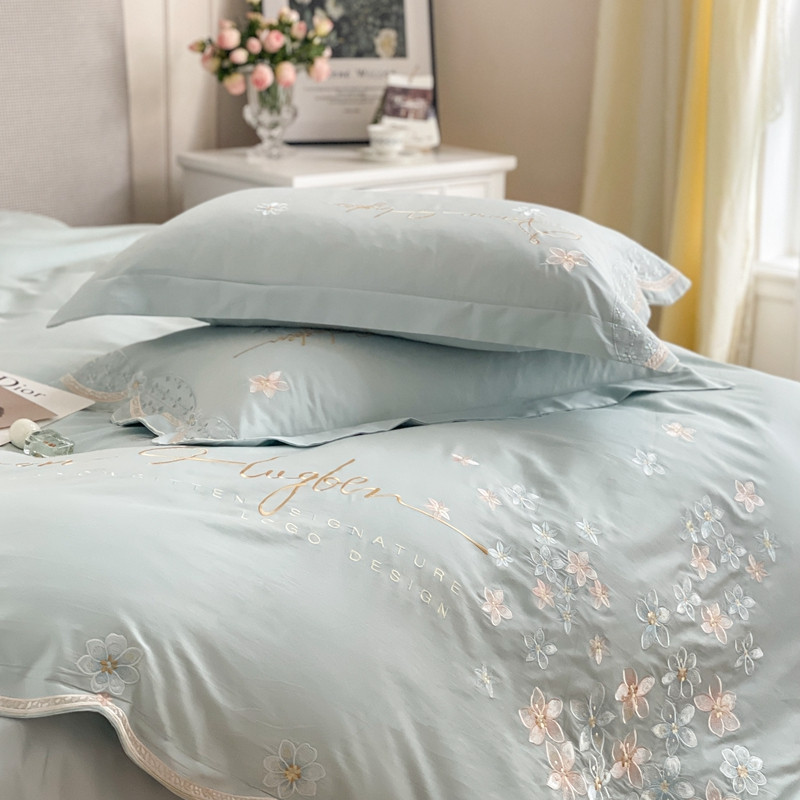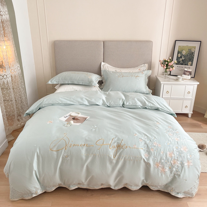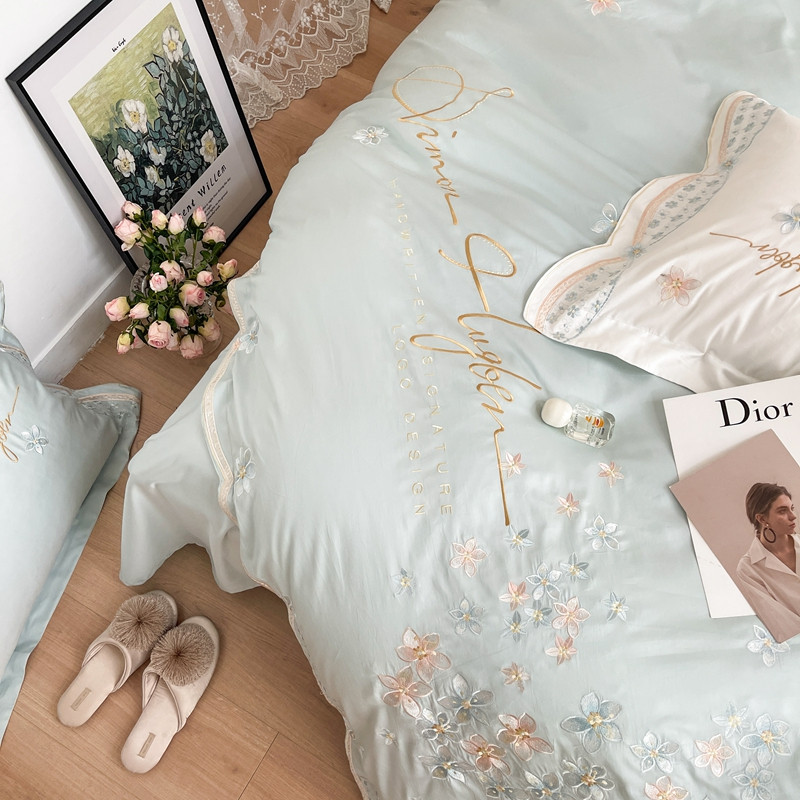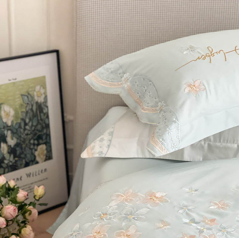 柚子2021新款高端100支澳棉贡缎刺绣四件套月夜迷迭星冰绿