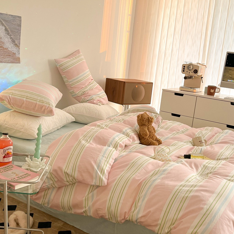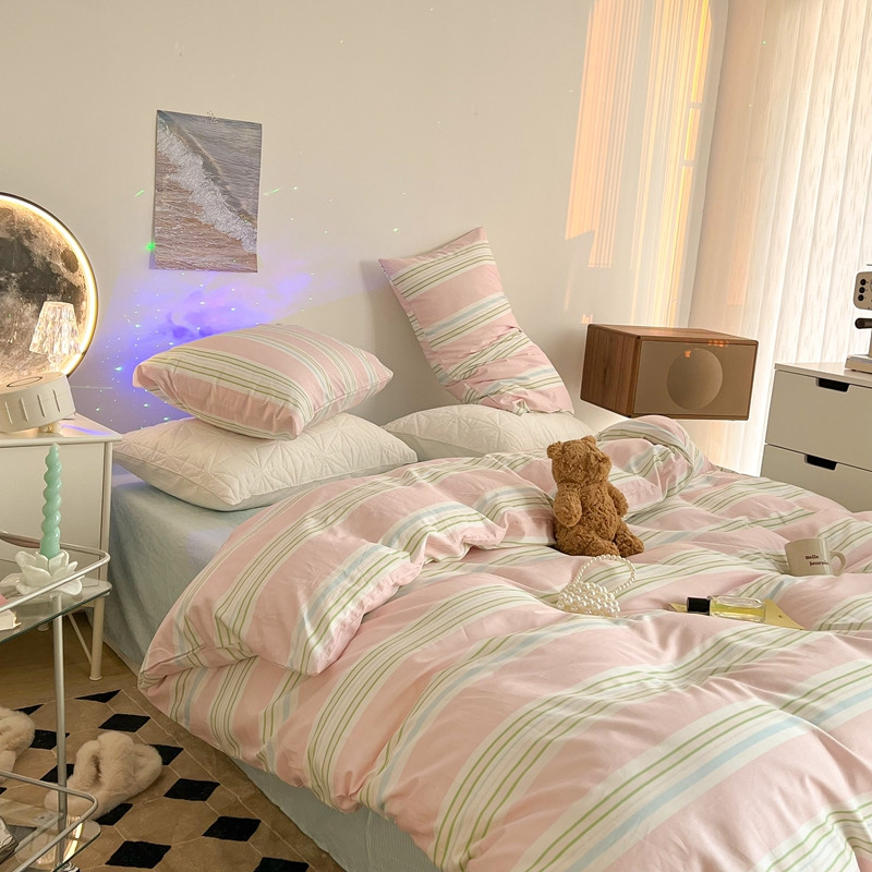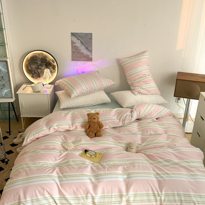 昔可家纺 2022新款13372全棉普通款玛卡龙条纹四件套 马卡龙粉条纹