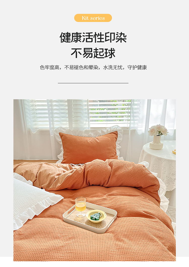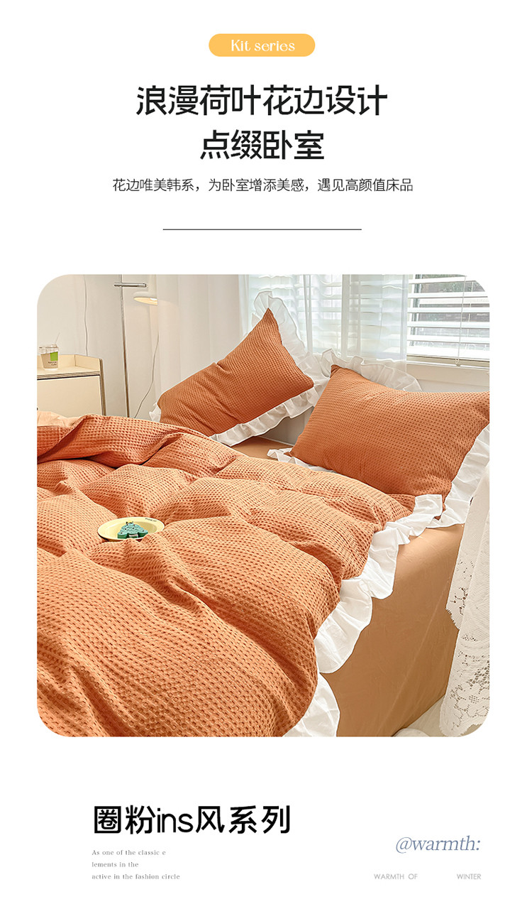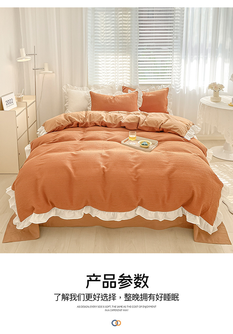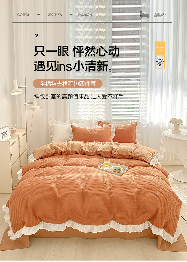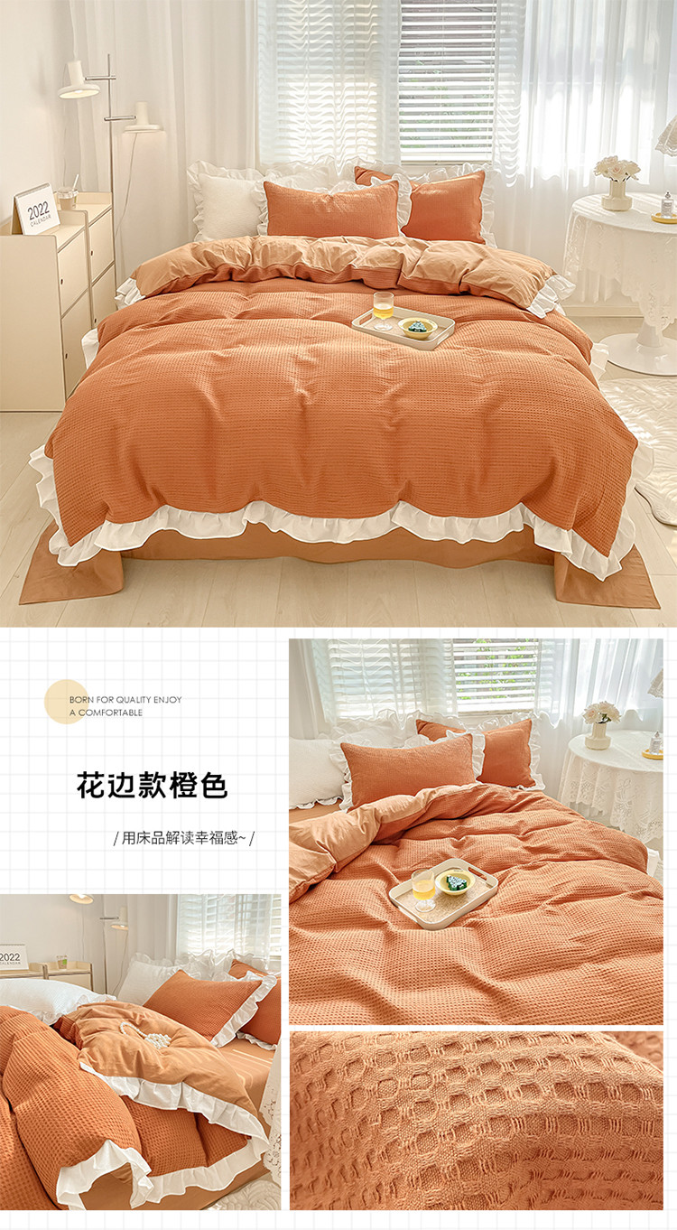 商品名称:雅居纺家纺 2022新款华夫格花边款四件套 橙色