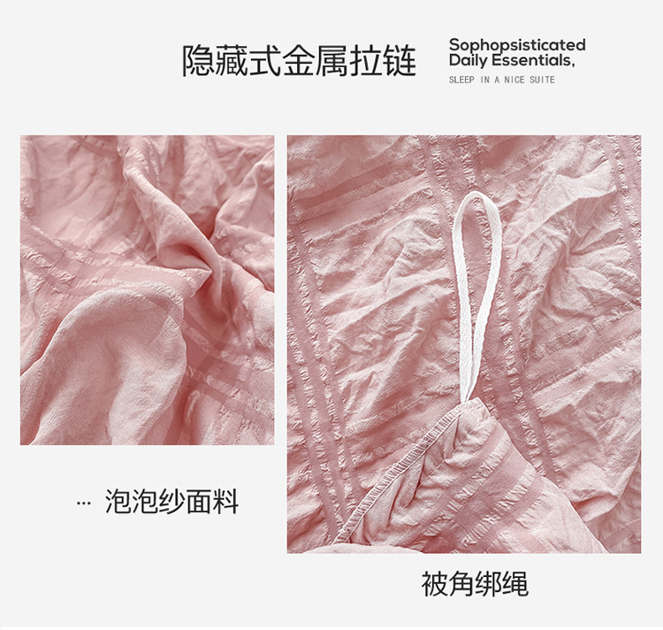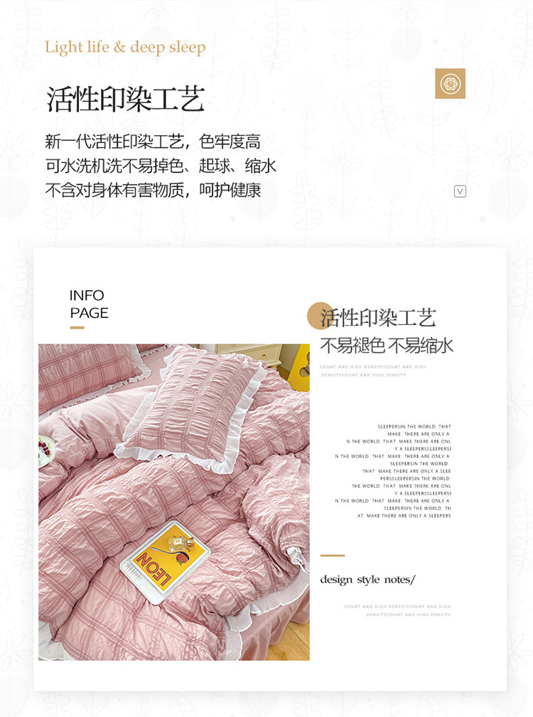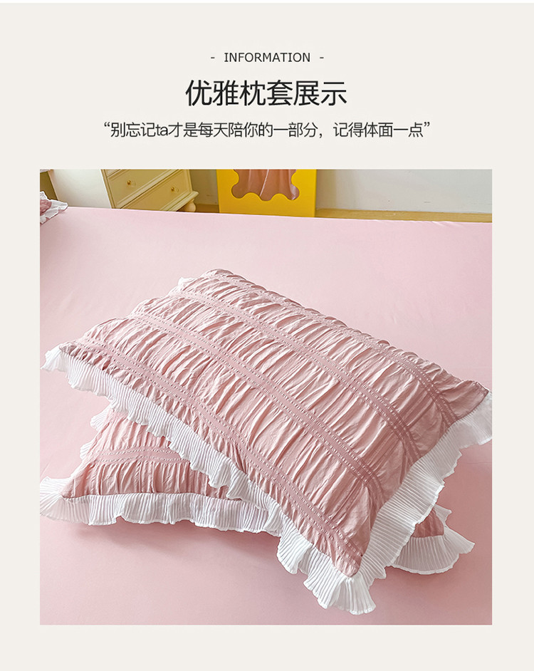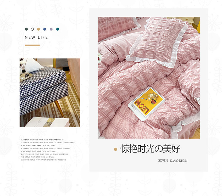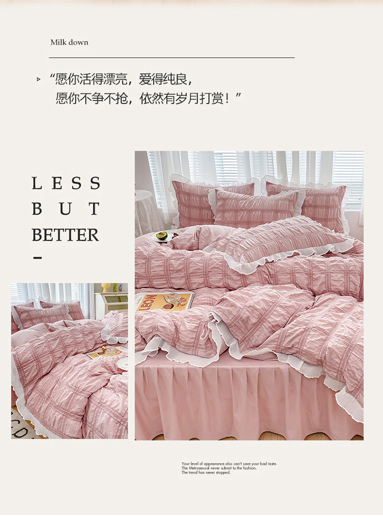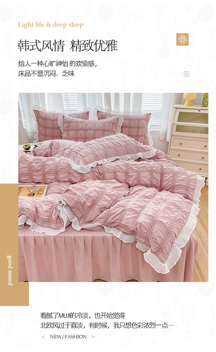 金米诺 新款韩版花边水洗棉泡泡纱四件套公主条四件套 褶皱-浅粉,褶皱-浅粉