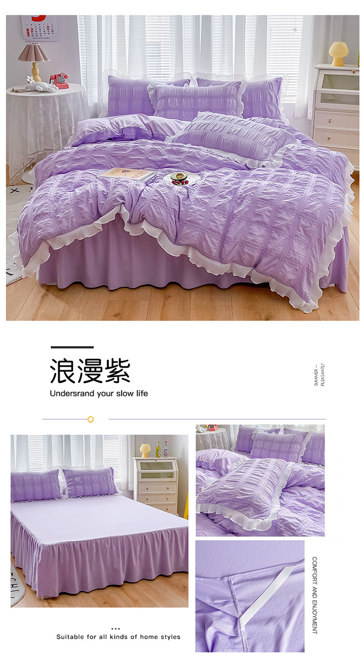 金米诺 新款韩版花边水洗棉泡泡纱四件套公主条四件套 褶皱-浅紫,褶皱-浅紫