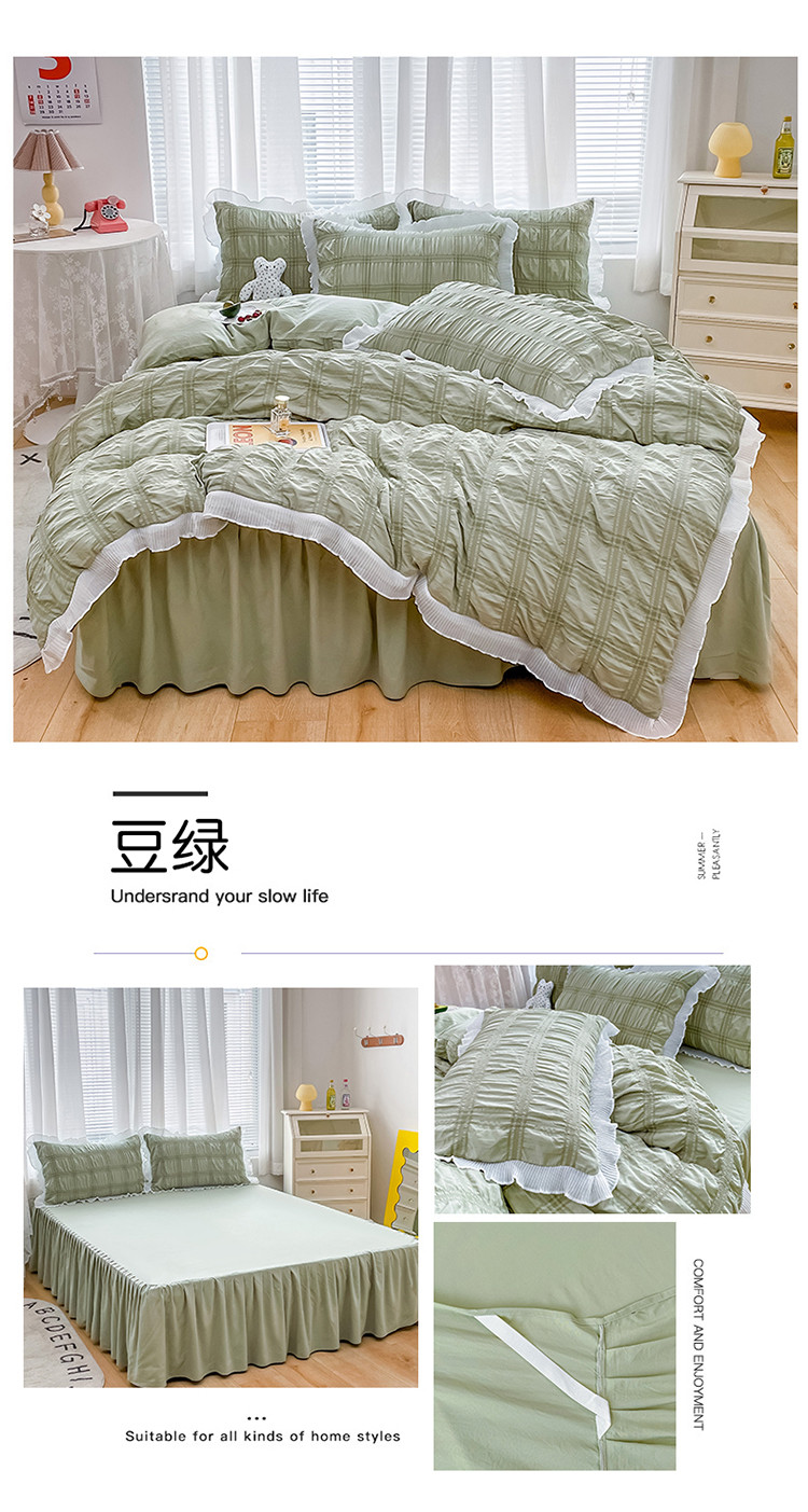 金米诺 新款韩版花边水洗棉泡泡纱四件套公主条四件套 褶皱-浅绿,褶皱-浅绿