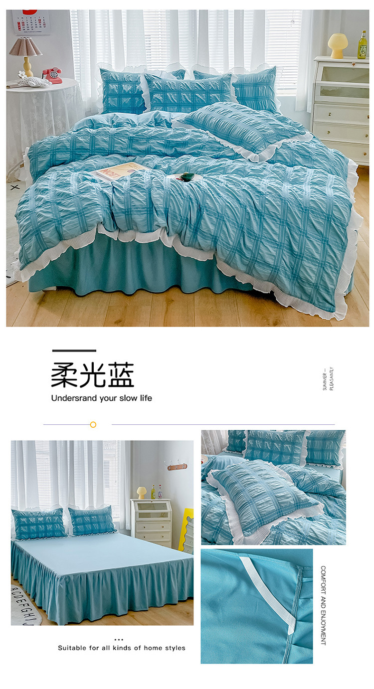 金米诺 新款韩版花边水洗棉泡泡纱四件套公主条四件套 褶皱-浅蓝,褶皱-浅蓝