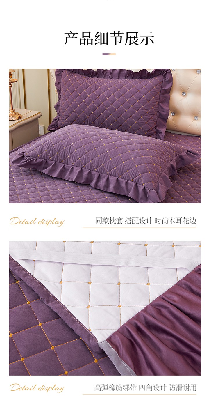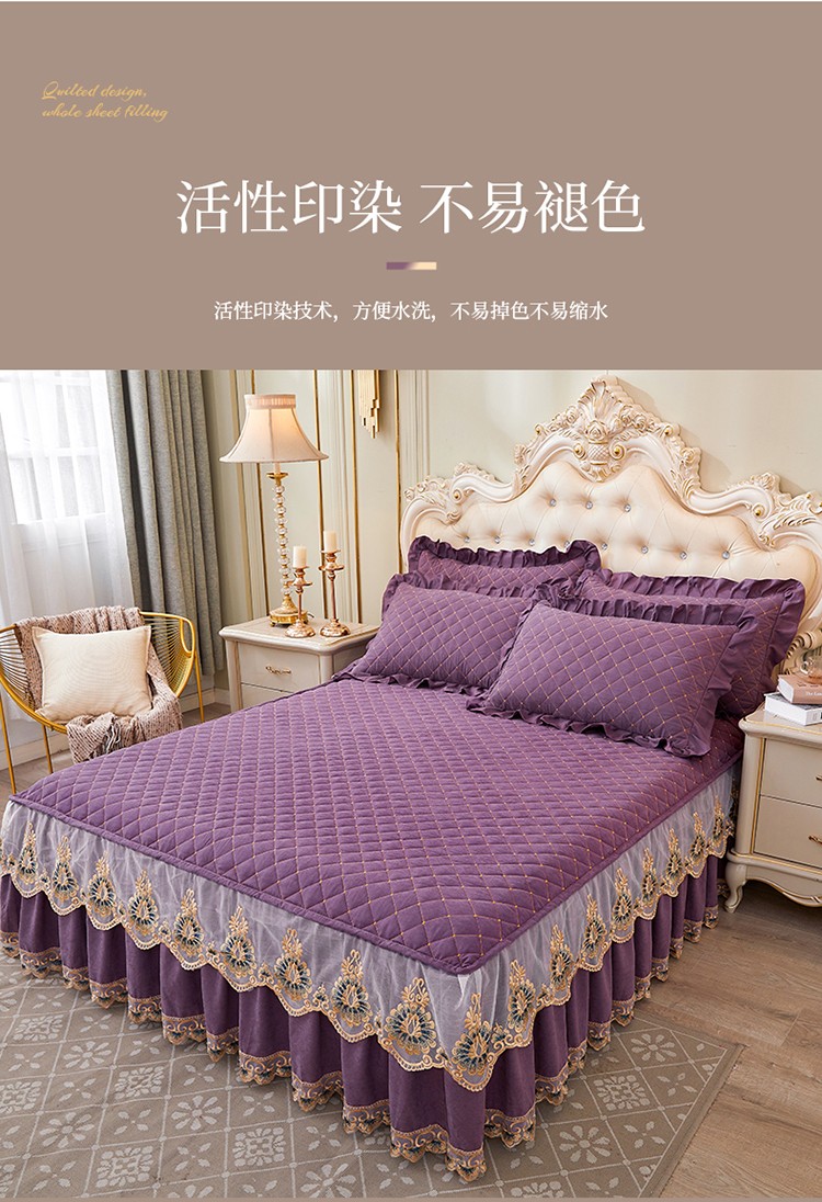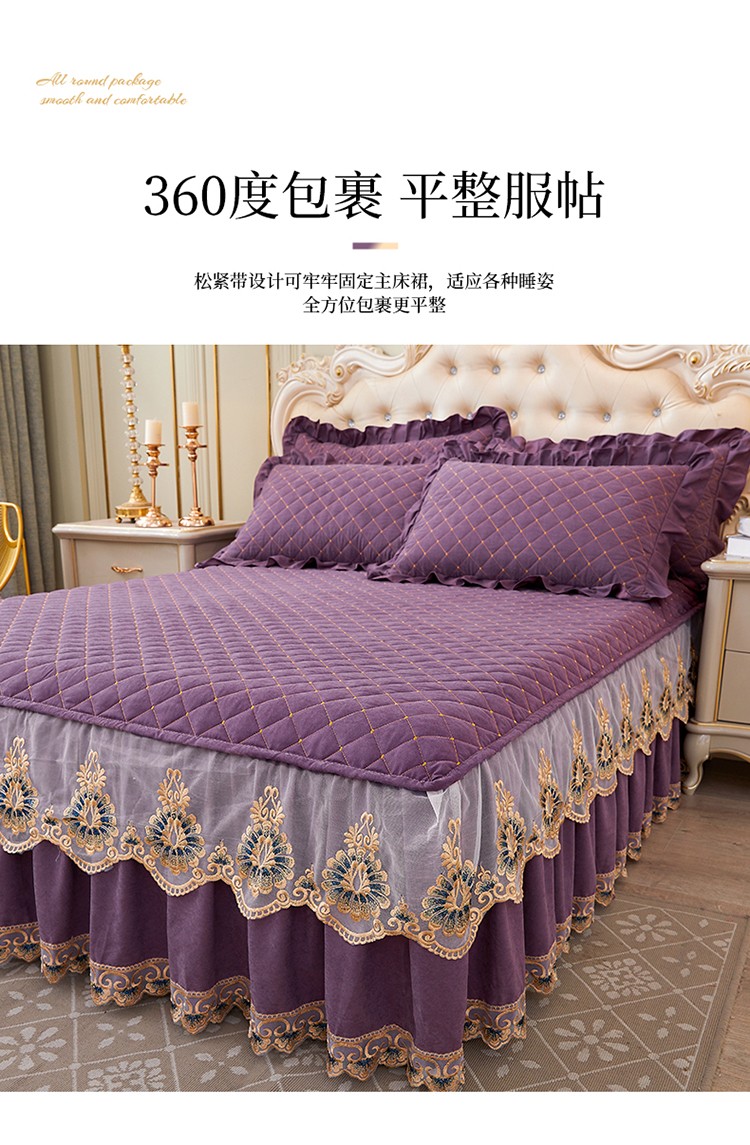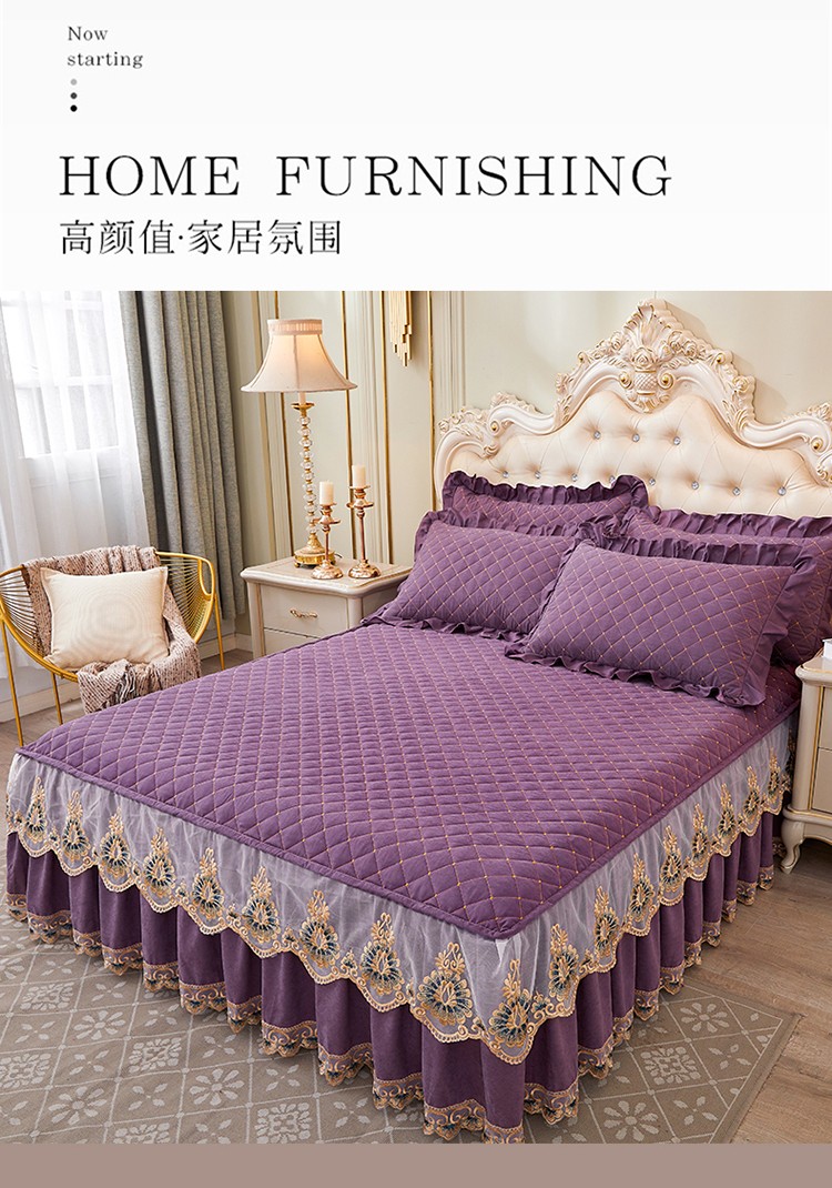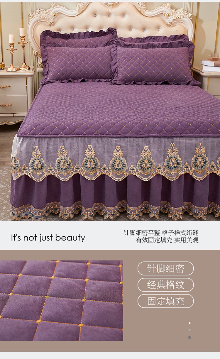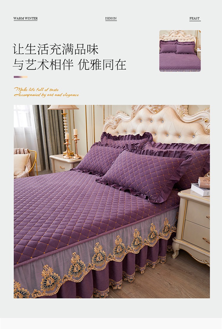 (总)屹成家纺2025新款水晶绒夹棉绗缝蕾丝床裙三件套(塞纳河畔)床裙单件起售价不低于105元,大红,豆沙,翡翠绿,粉玉,橄榄绿,蔚蓝,银灰