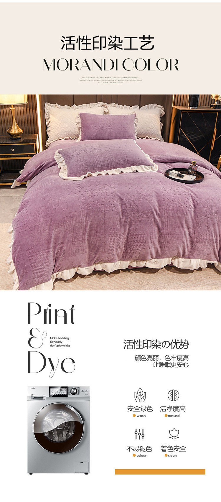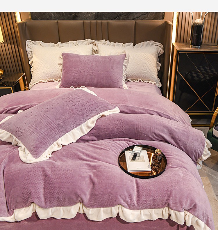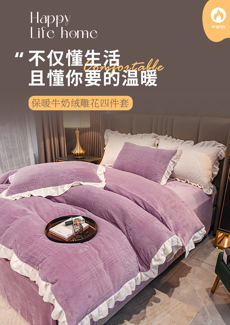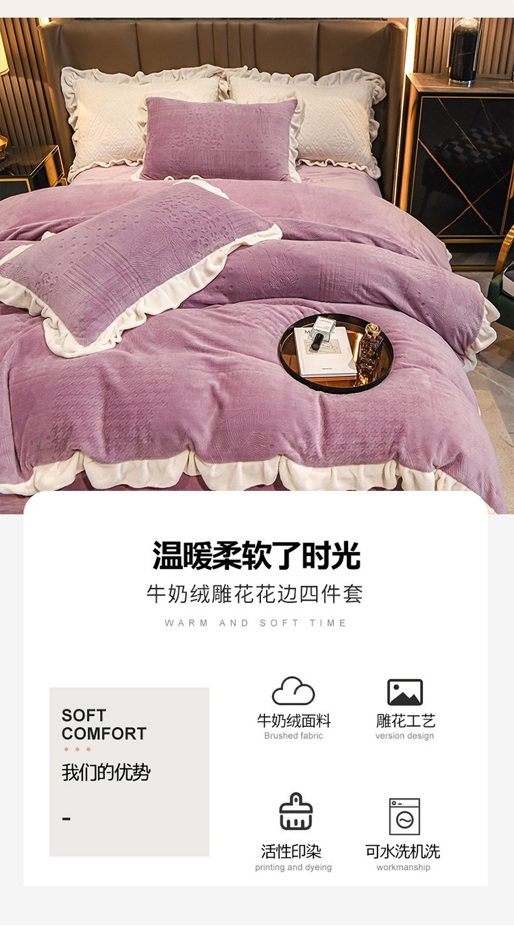 商品名称:珺柔 2022新款220高克重牛奶绒雕花时尚花边款四件套 悦薇(紫)