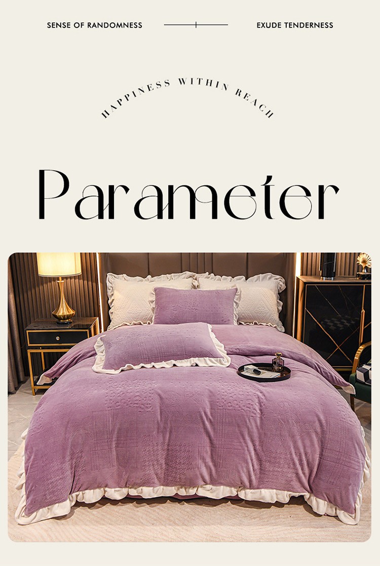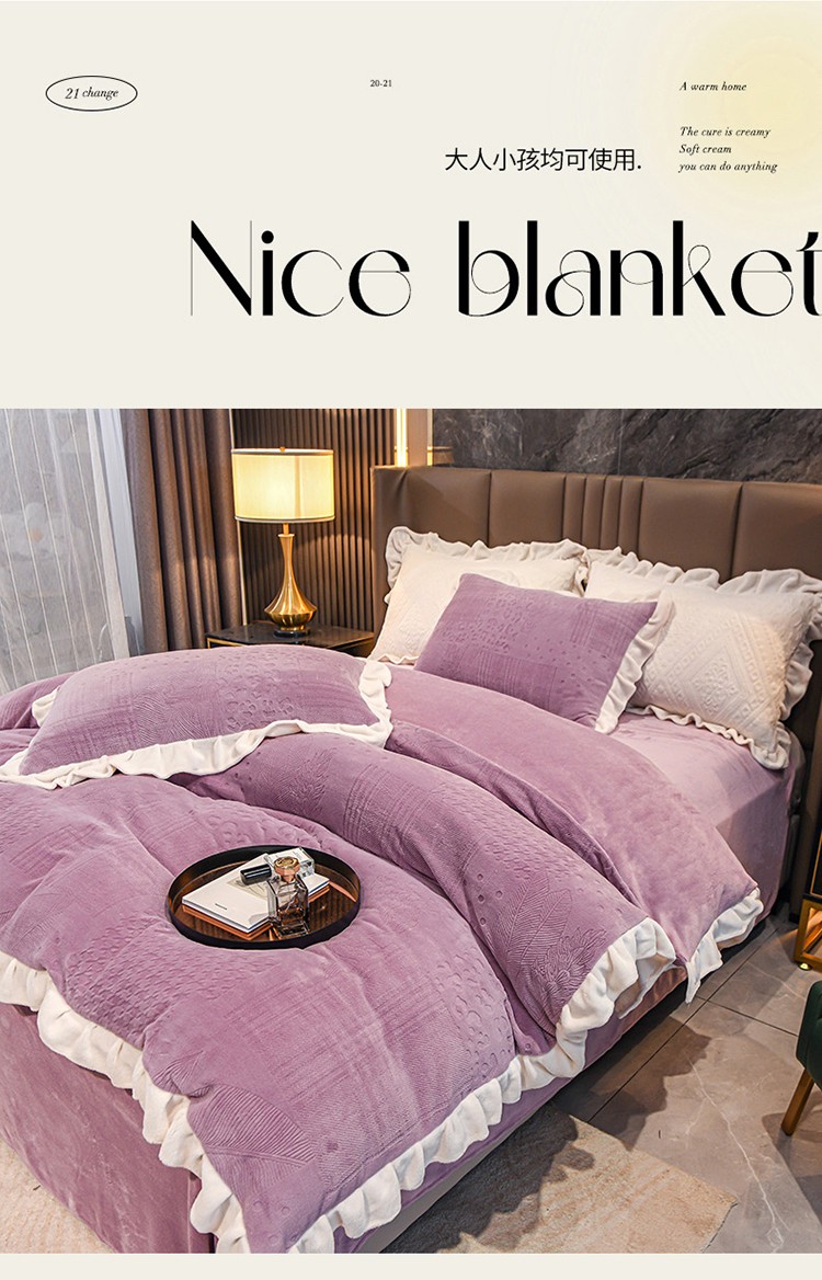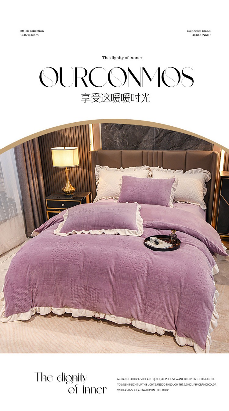商品名称:珺柔 2022新款220高克重牛奶绒雕花时尚花边款四件套 悦薇(紫)