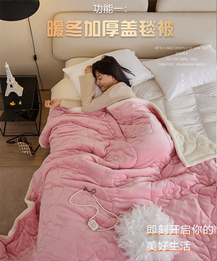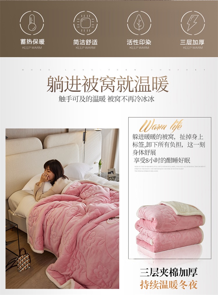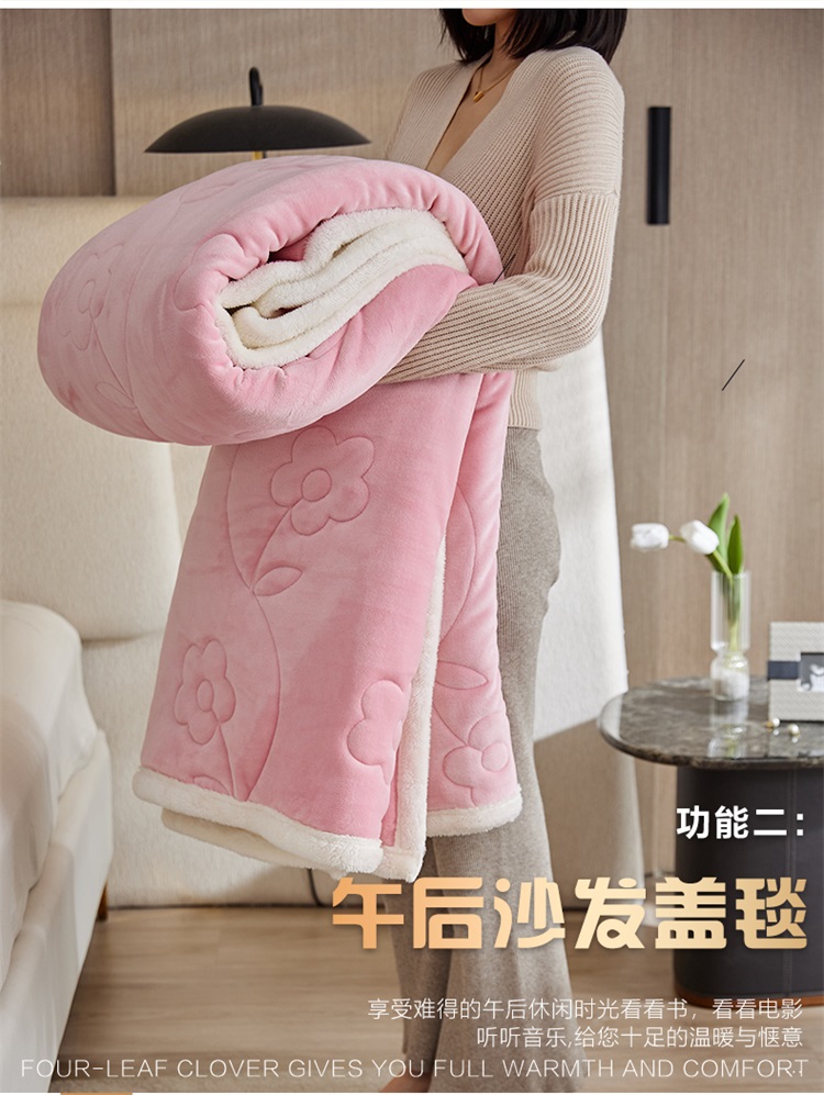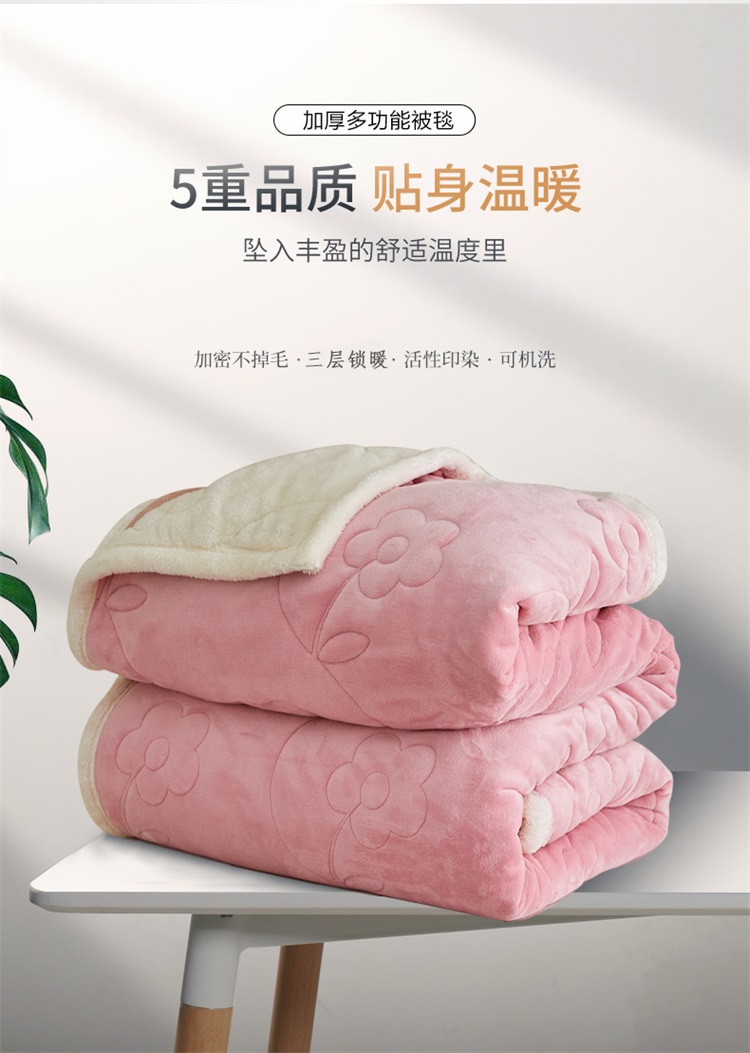 商品名称:铭动 新款三层加厚加绒牛奶绒羊羔绒珊瑚绒保暖冬季毛毯-嫩粉