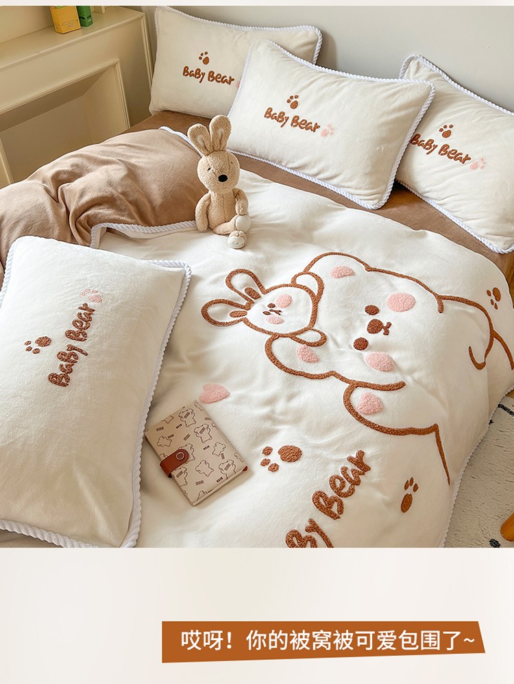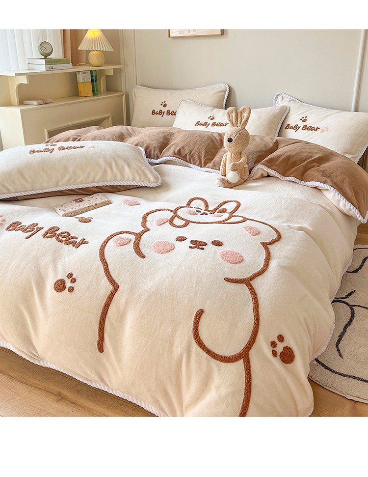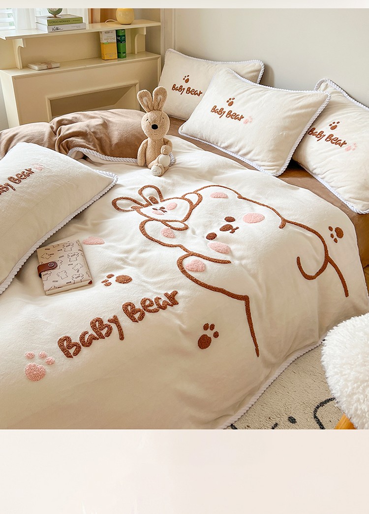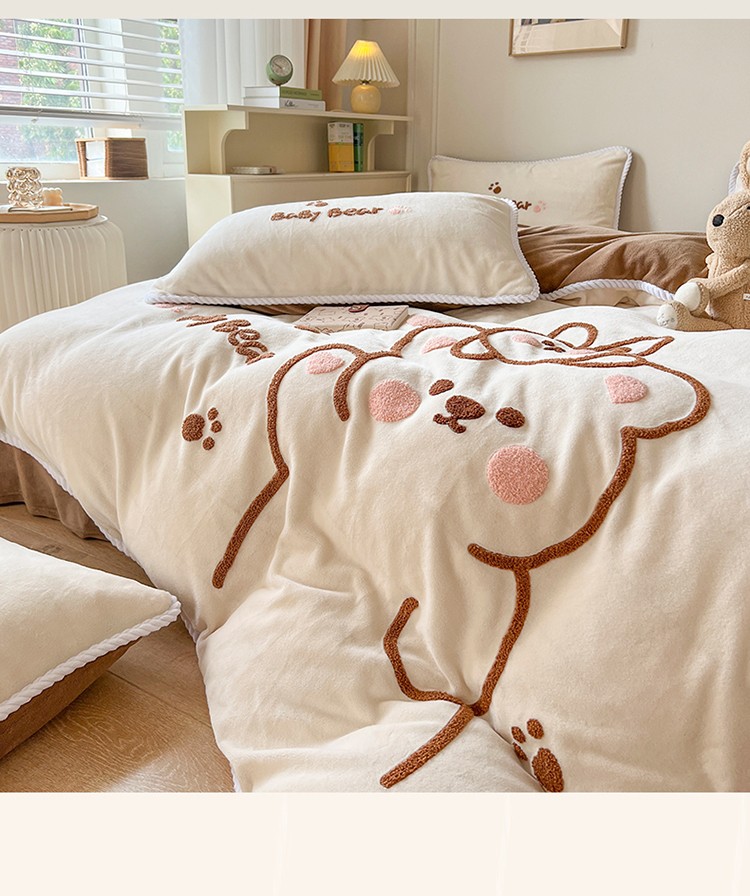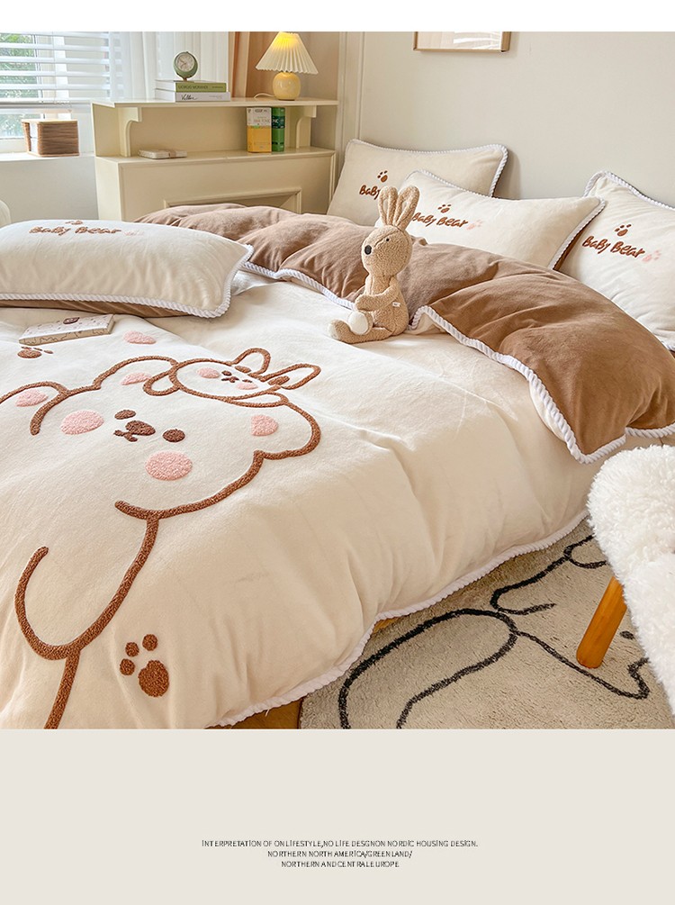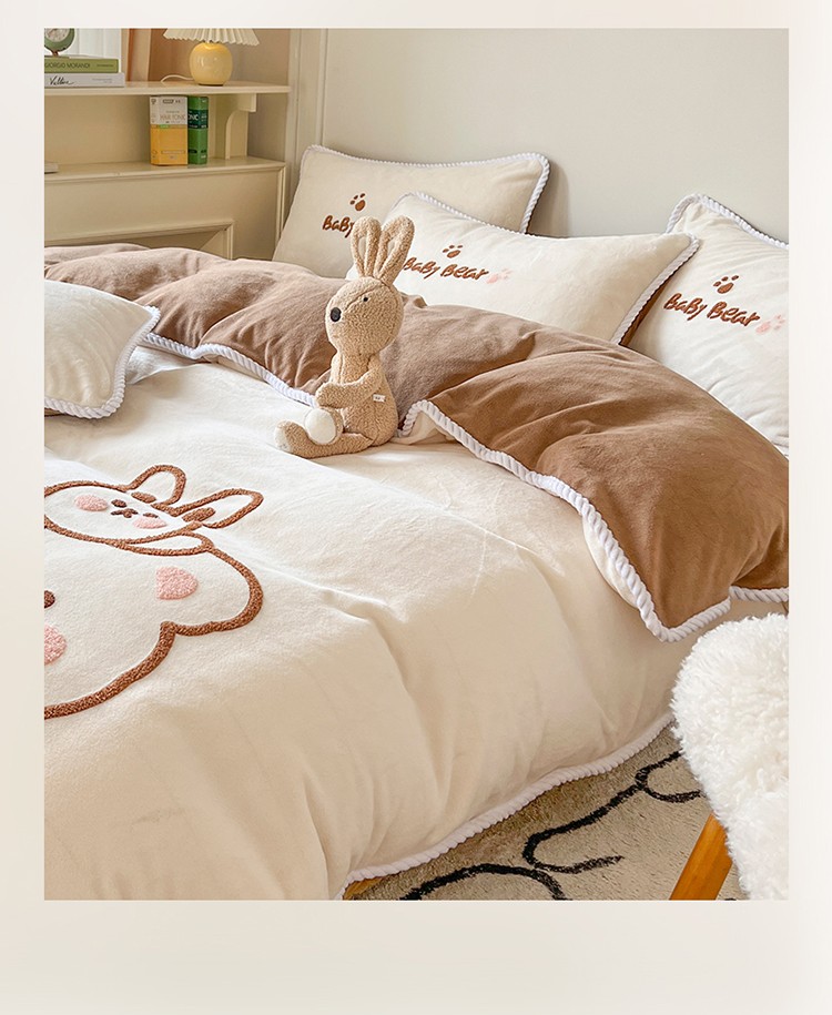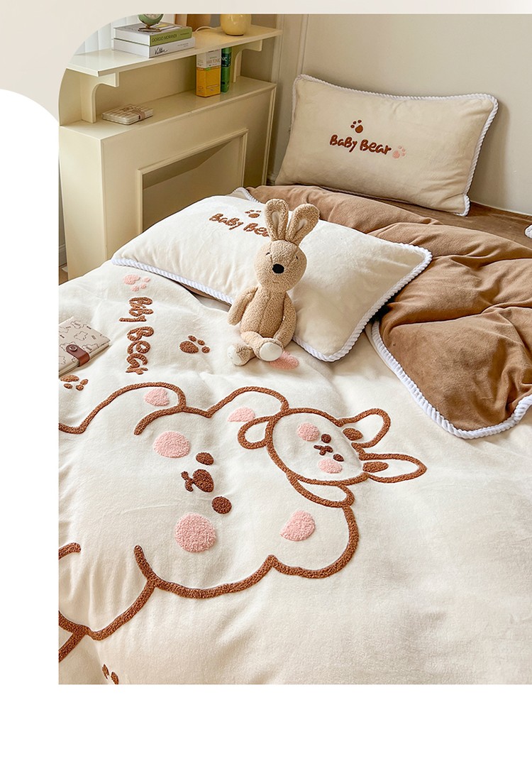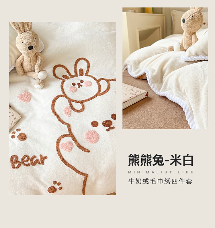 芯贝儿 新款加厚保暖雕花牛奶绒毛巾绣花宝宝法莱绒四件套 熊熊兔-米白