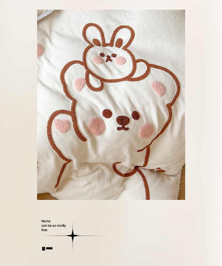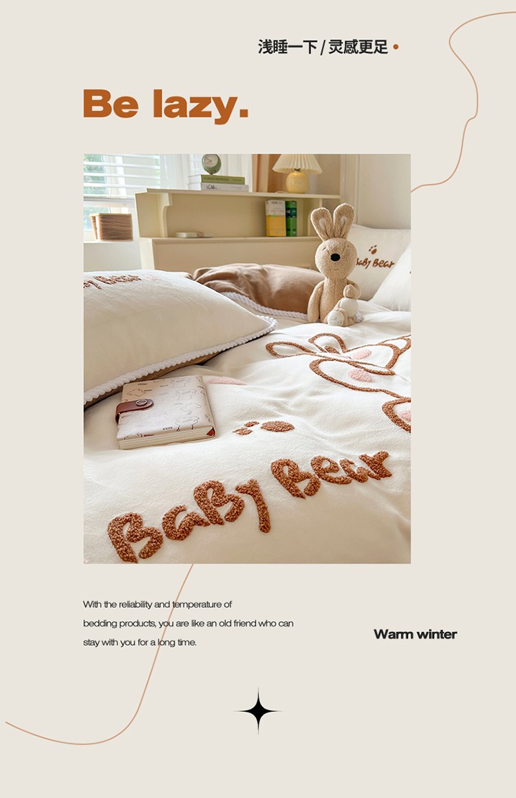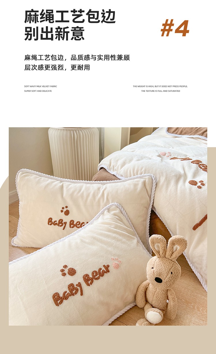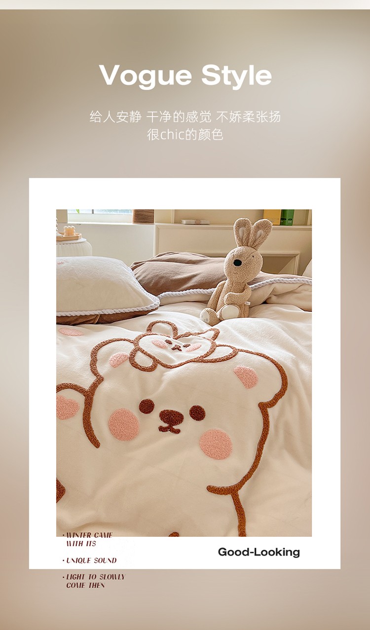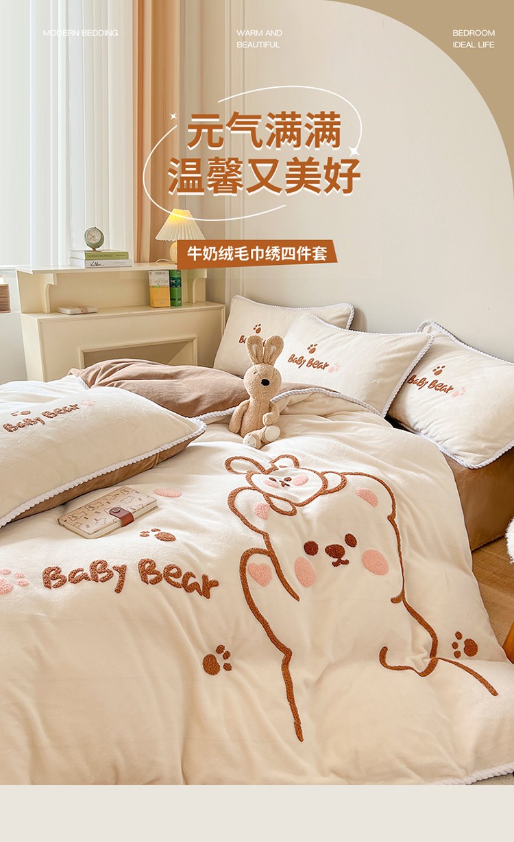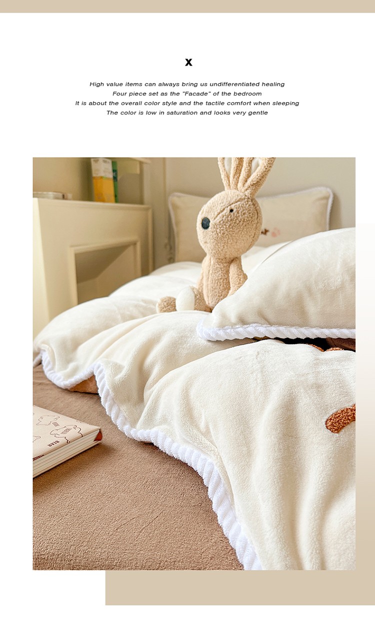 芯贝儿 新款加厚保暖雕花牛奶绒毛巾绣花宝宝法莱绒四件套 熊熊兔-米白