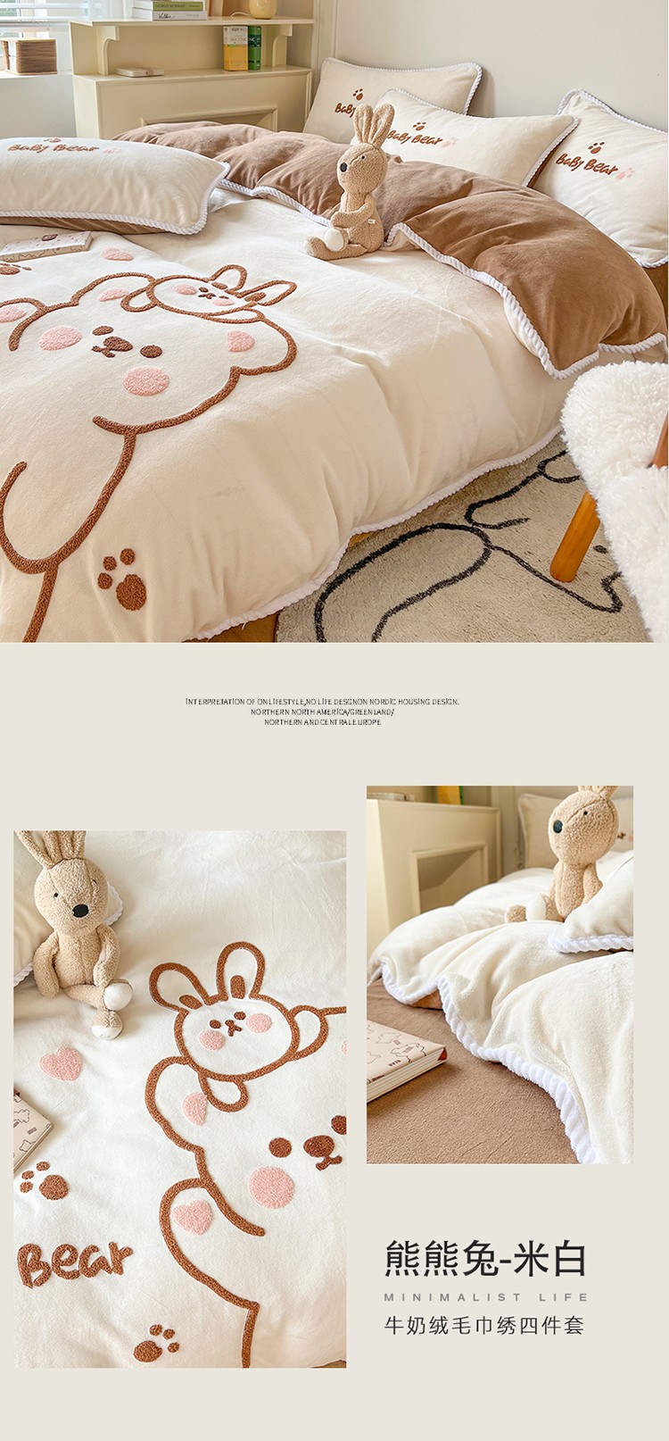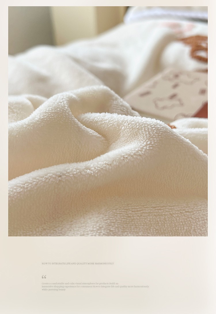 商品名称:芯贝儿 新款加厚保暖雕花牛奶绒毛巾绣花宝宝法莱绒四件套 熊熊兔-米白