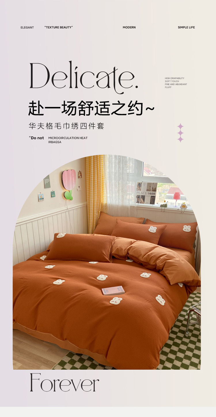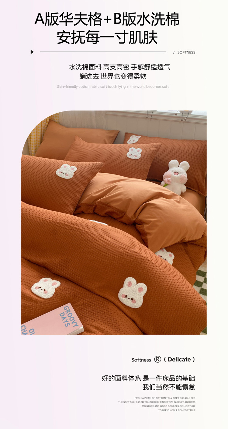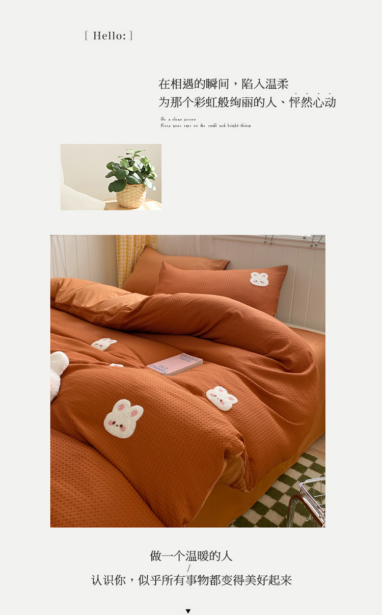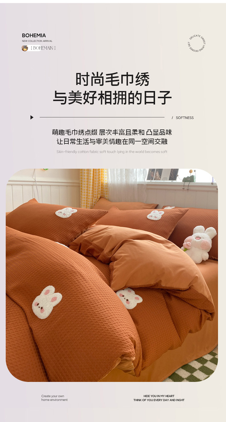商品名称:慕澄 2023新款高克重小清新华夫格毛巾绣系列四件套 小兔-咖啡