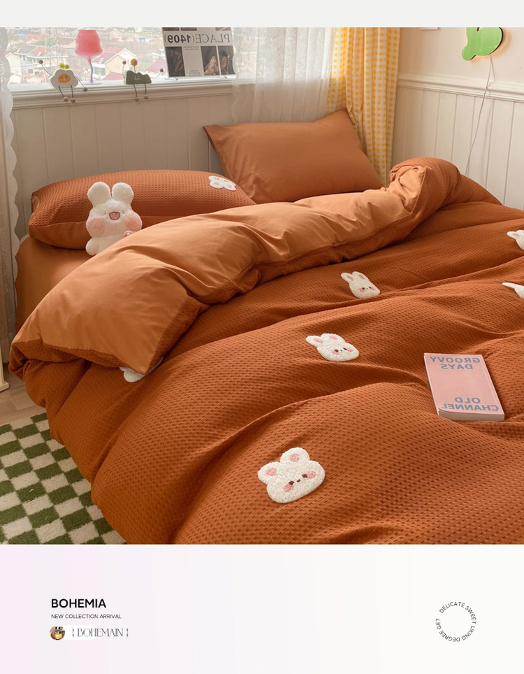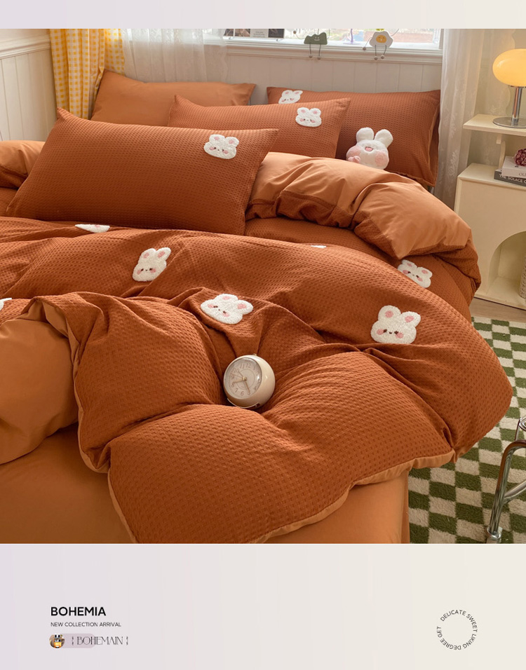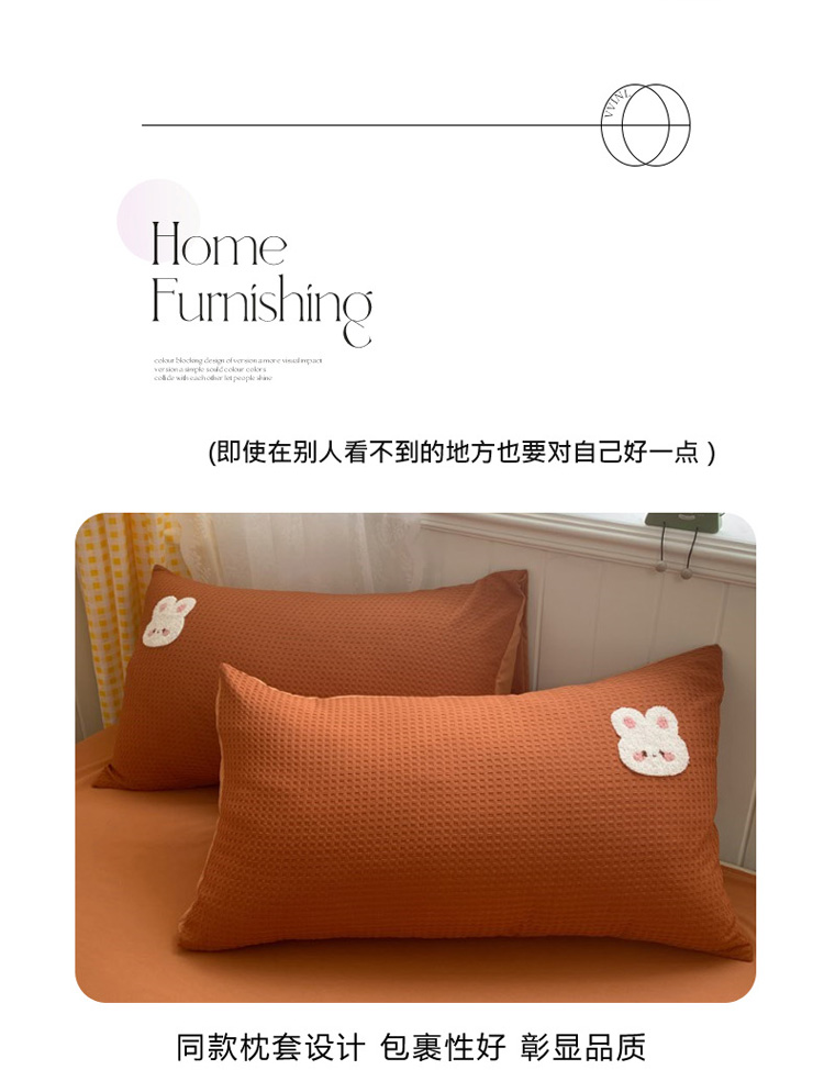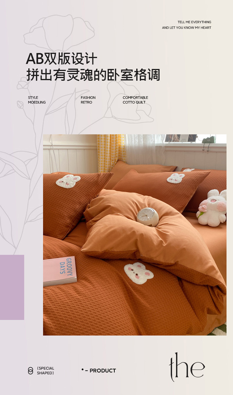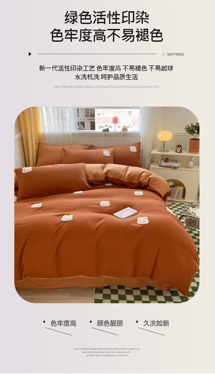 商品名称:慕澄 2023新款高克重小清新华夫格毛巾绣系列四件套 小兔-咖啡