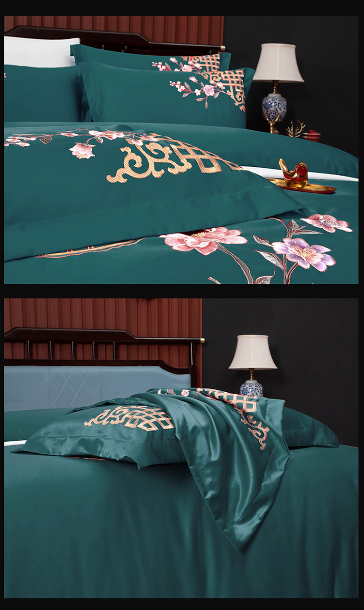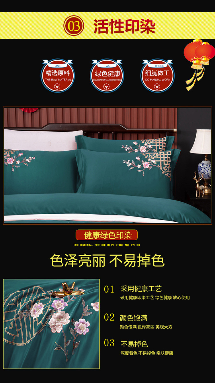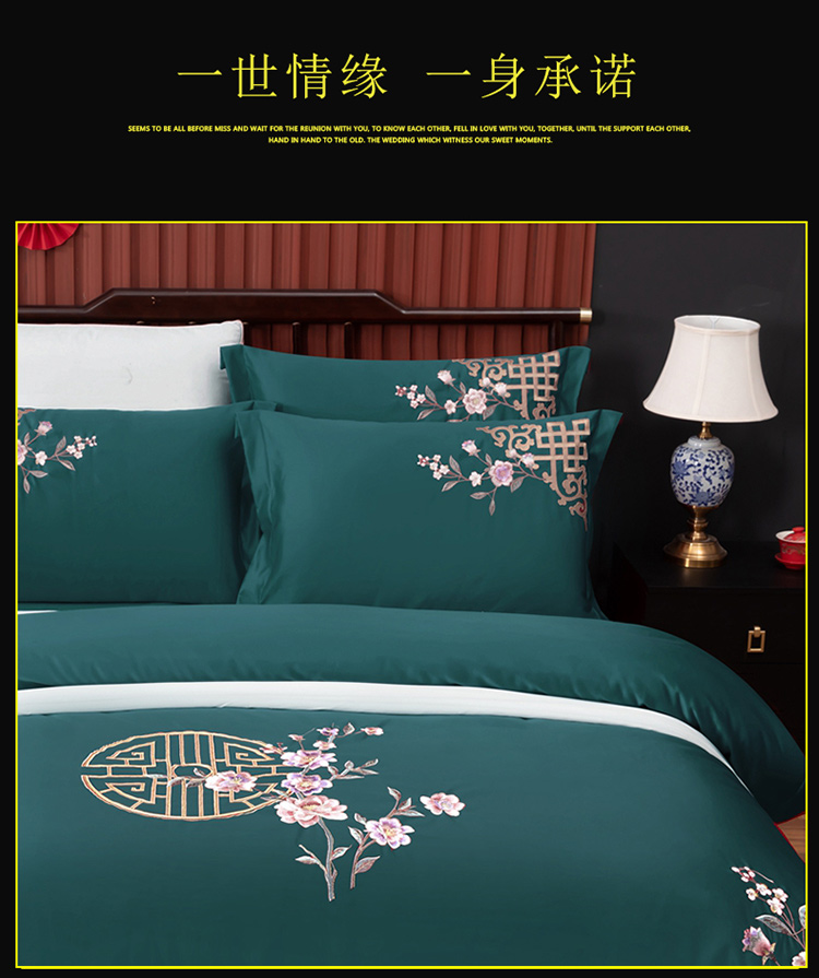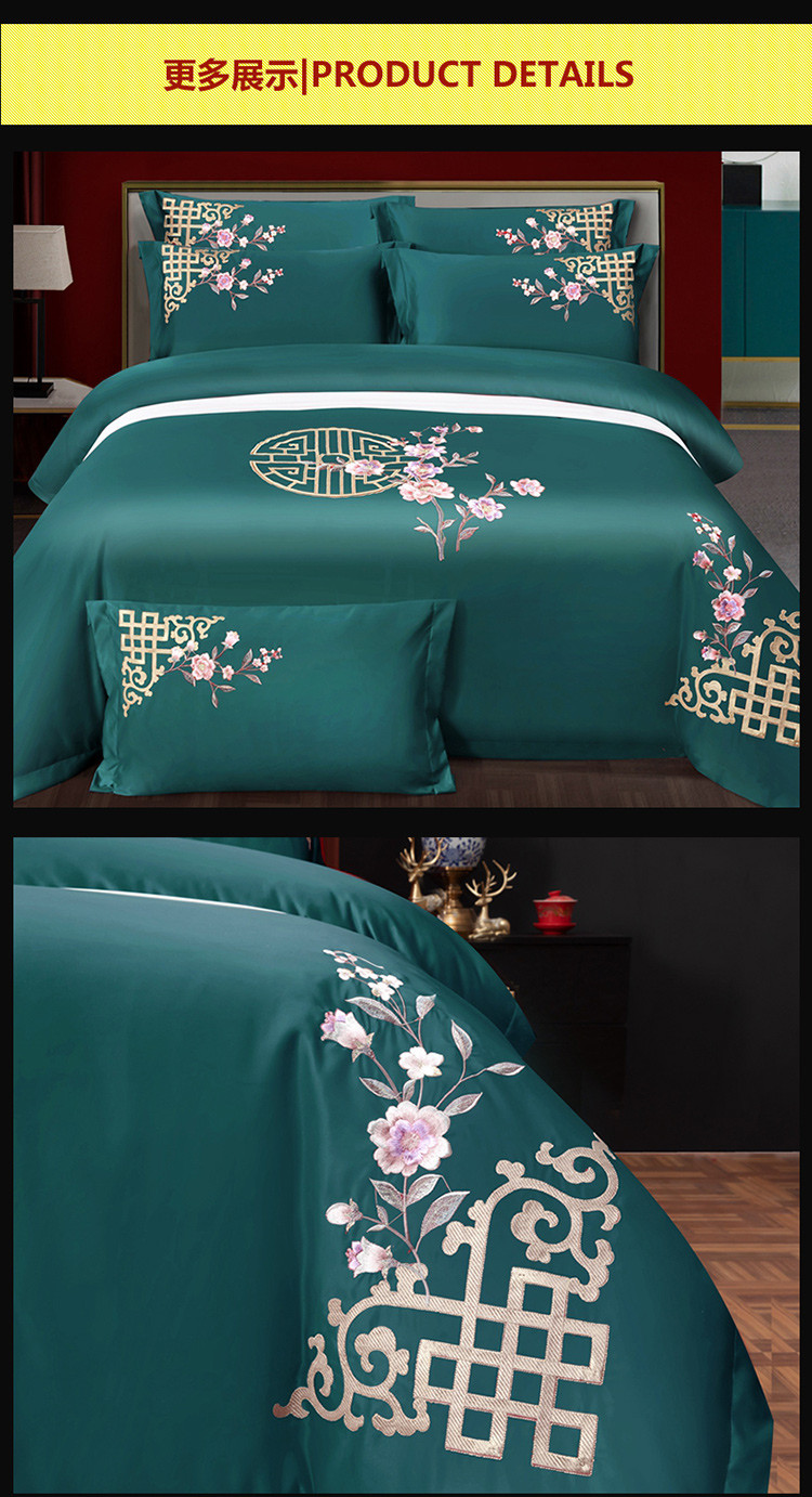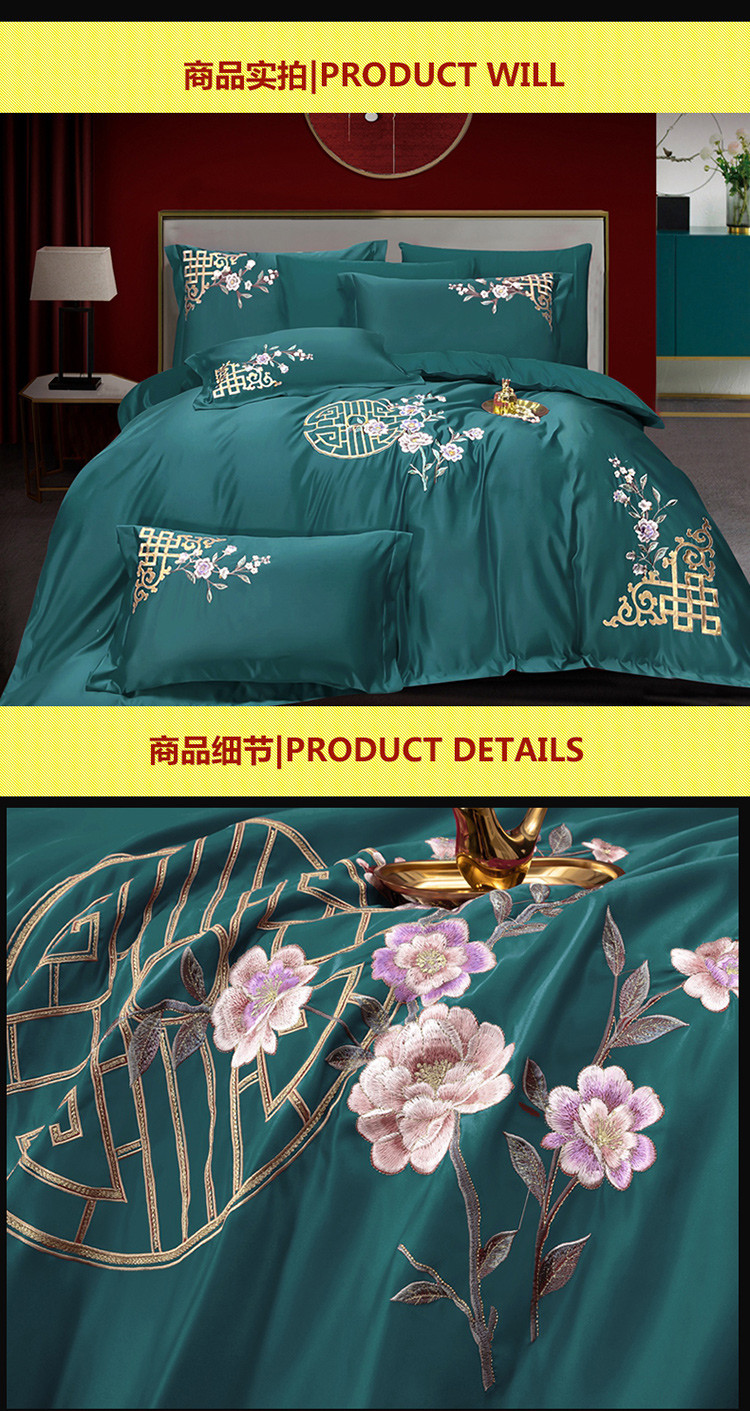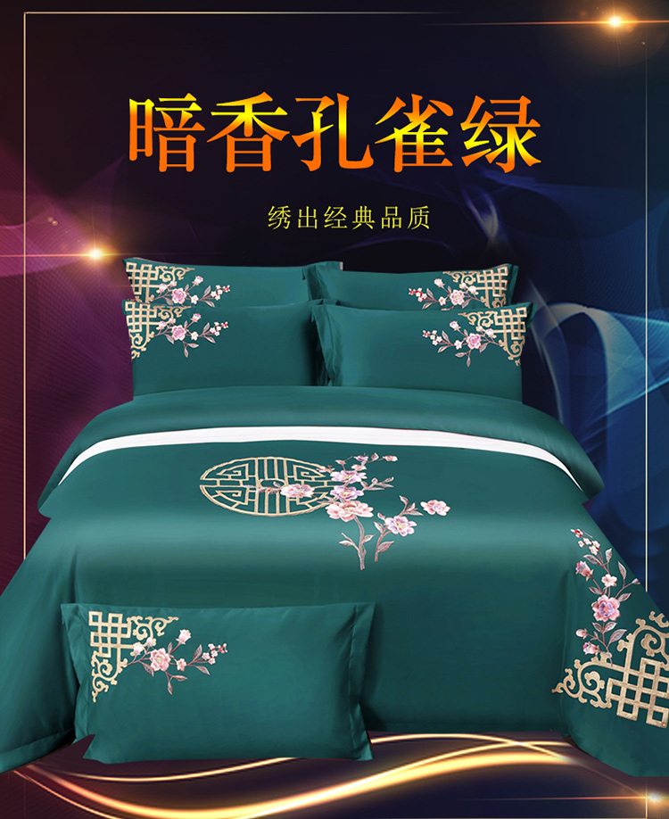 商品名称:慕她婚庆四件套大红色结婚全棉纯棉刺绣花多件套直播 暗香孔雀绿