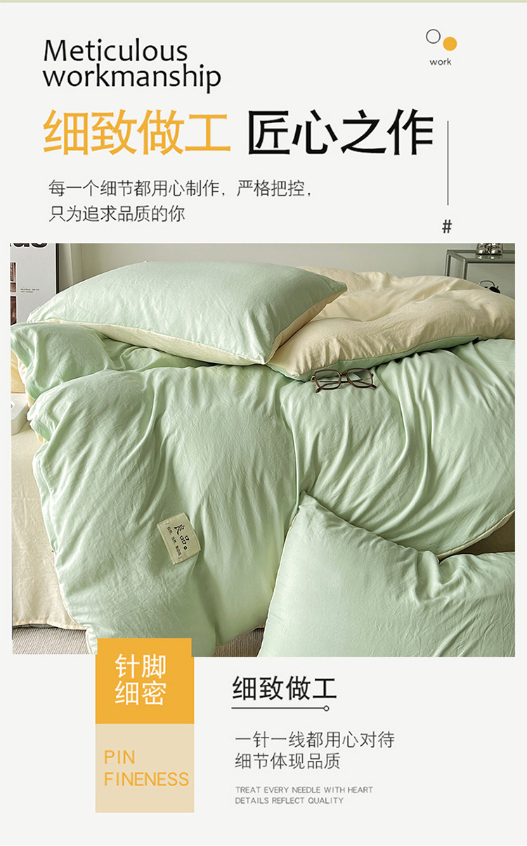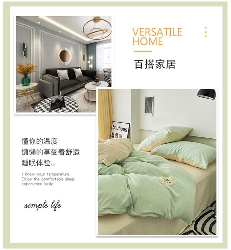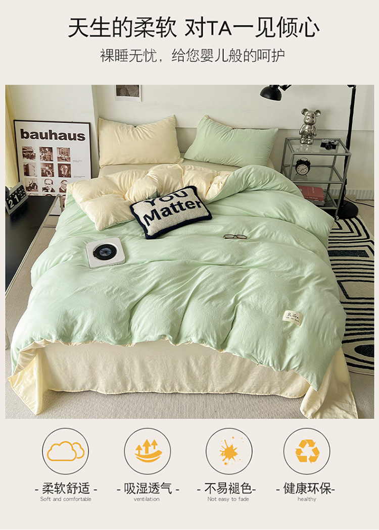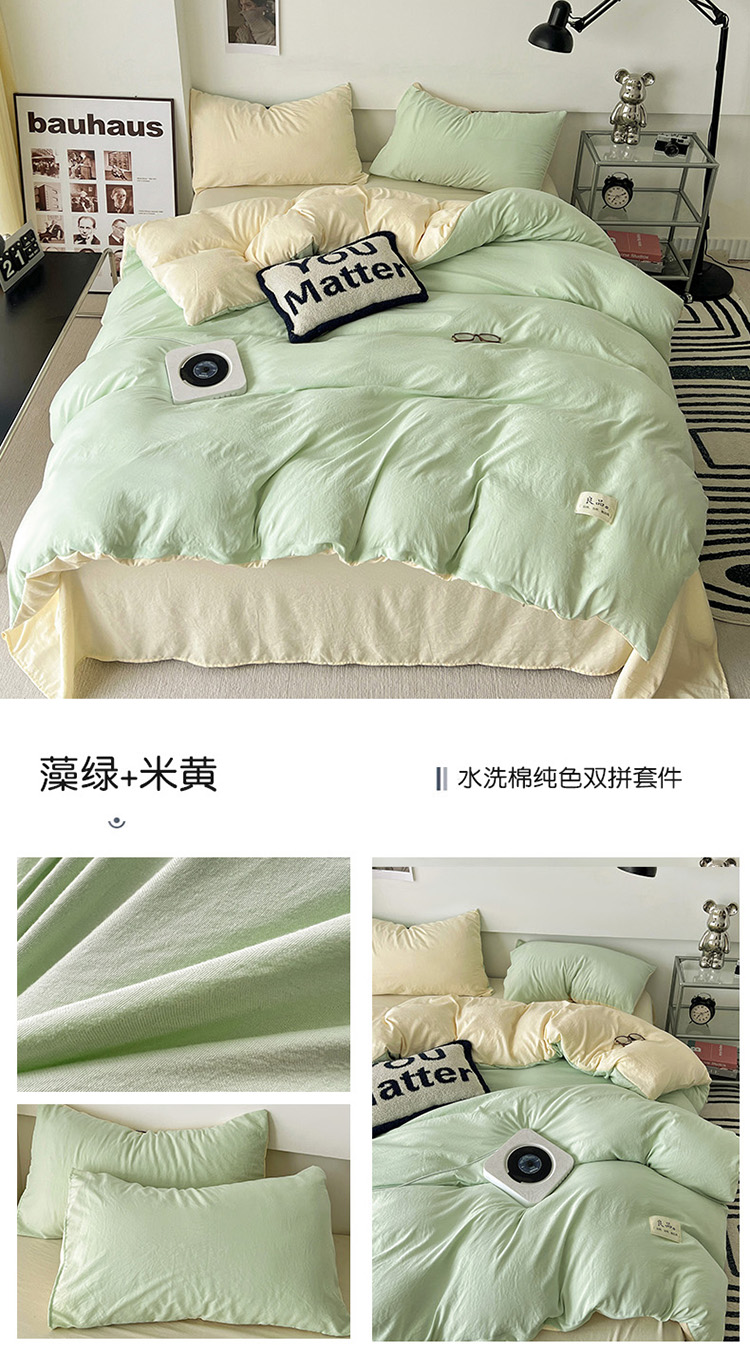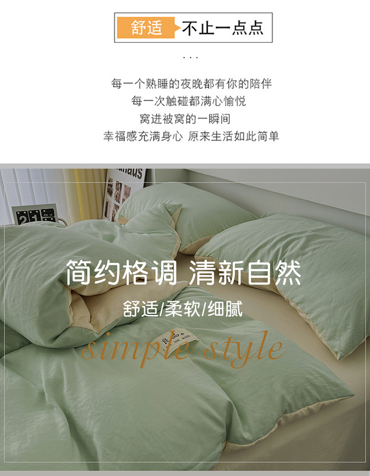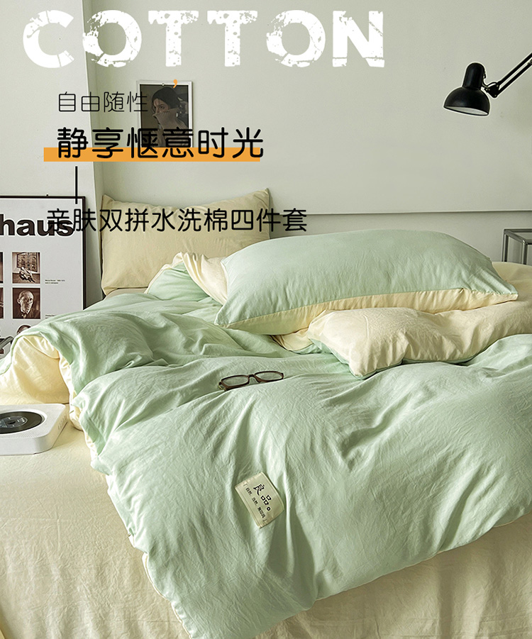 当前位置: 91家纺网 > 商品网购 > 床品套件 > 四件套 > 化纤普通四件套 > 优色良品家纺 2023新款博主风90克超柔水洗棉双拼四件套 藻绿+米黄