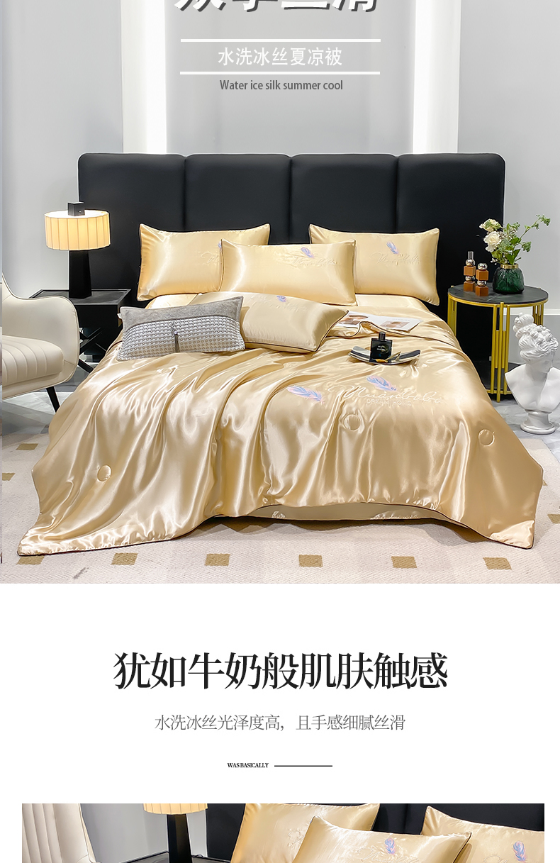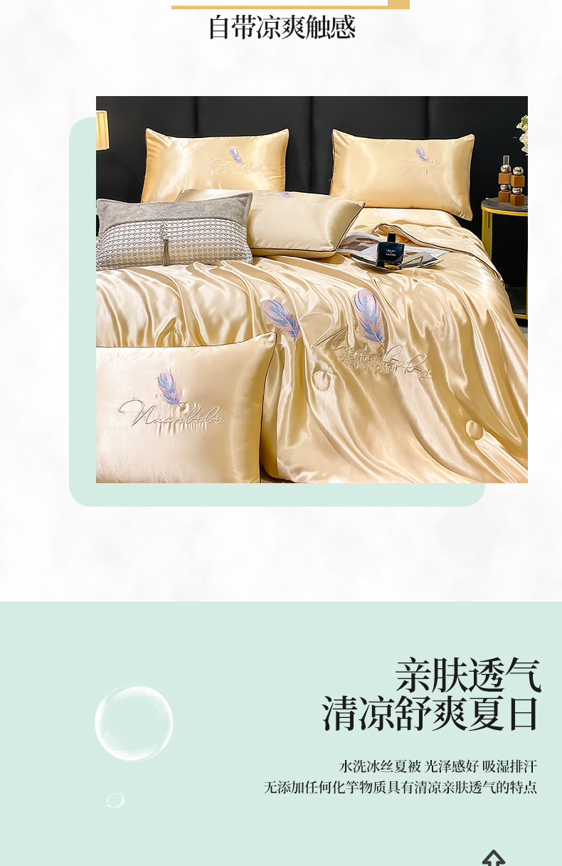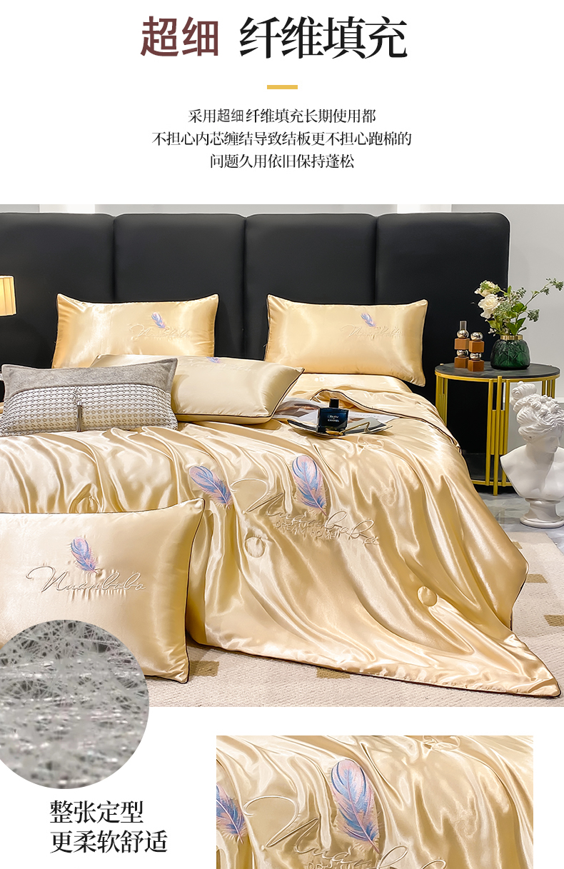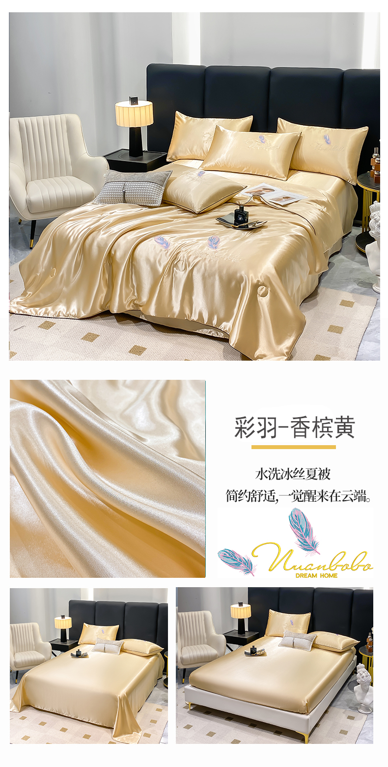 • 91家纺网 家纺一手货源 找家纺 啊雅家居 2025新款水洗真丝夏被空调被四件套 彩羽-香槟黄