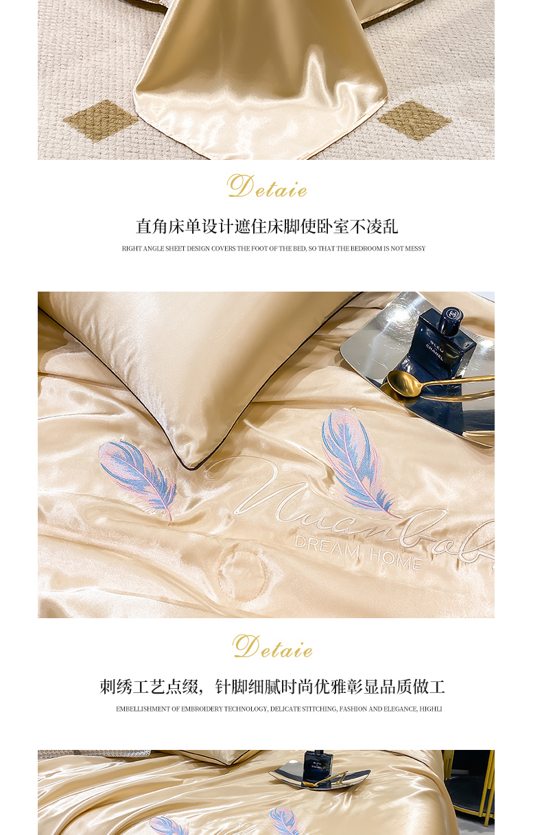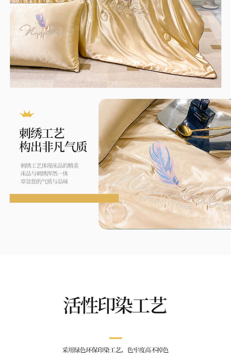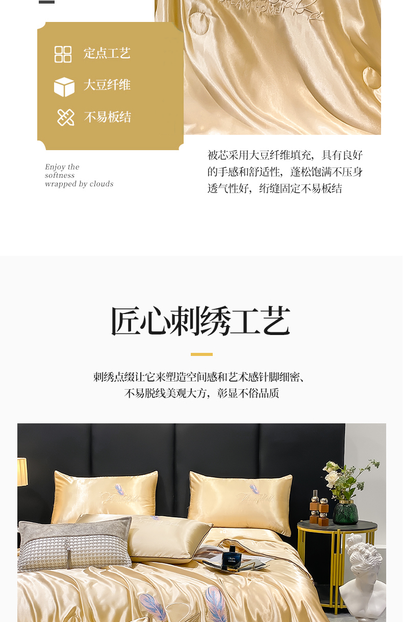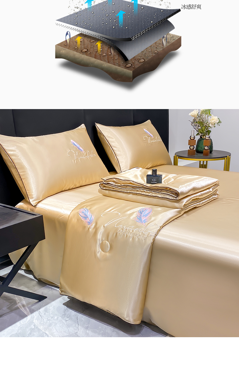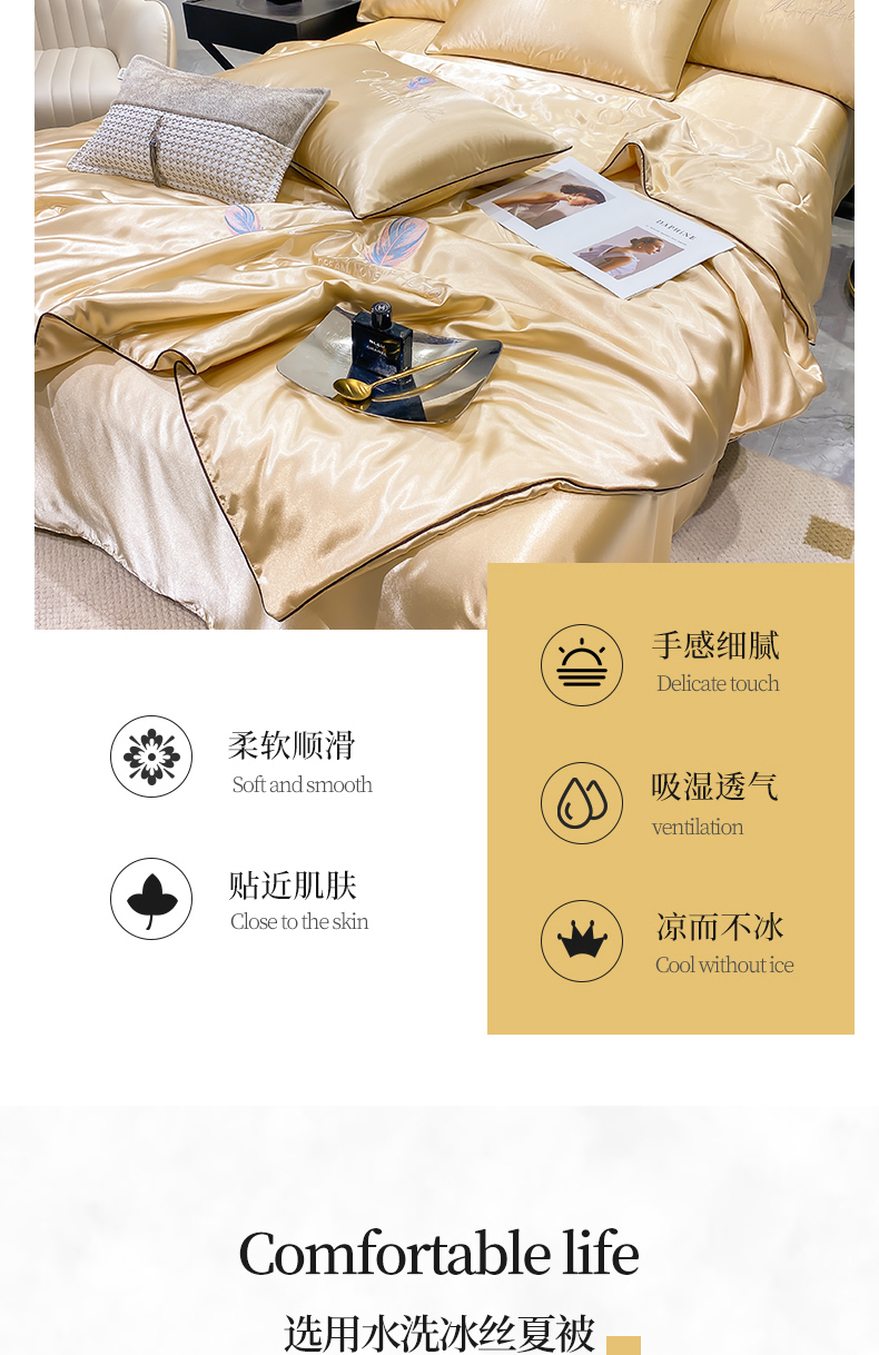 • 91家纺网 家纺一手货源 找家纺 啊雅家居 2025新款水洗真丝夏被空调被四件套 彩羽-香槟黄