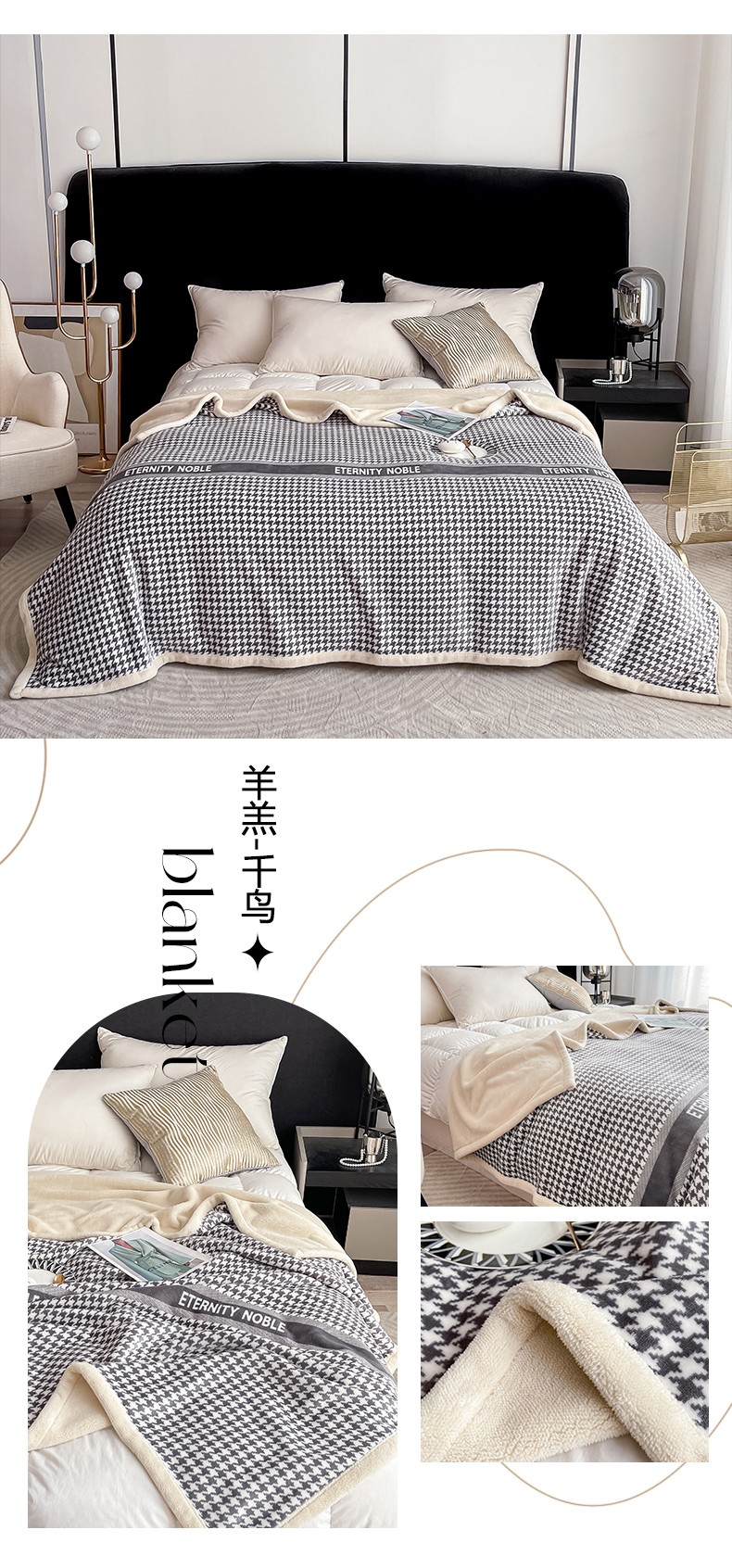 商品名称:卡奥 2024新款双层复合云貂绒北极绒休闲毛毯 羊羔-千鸟