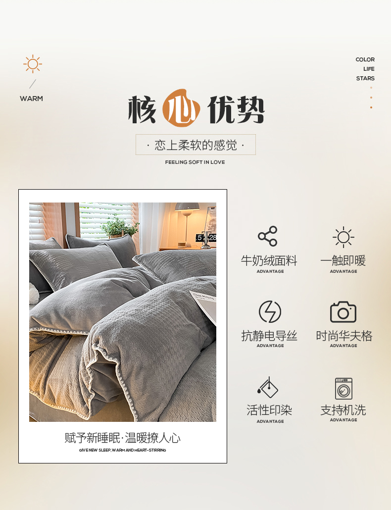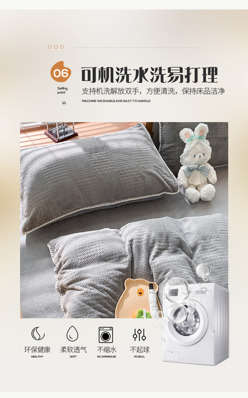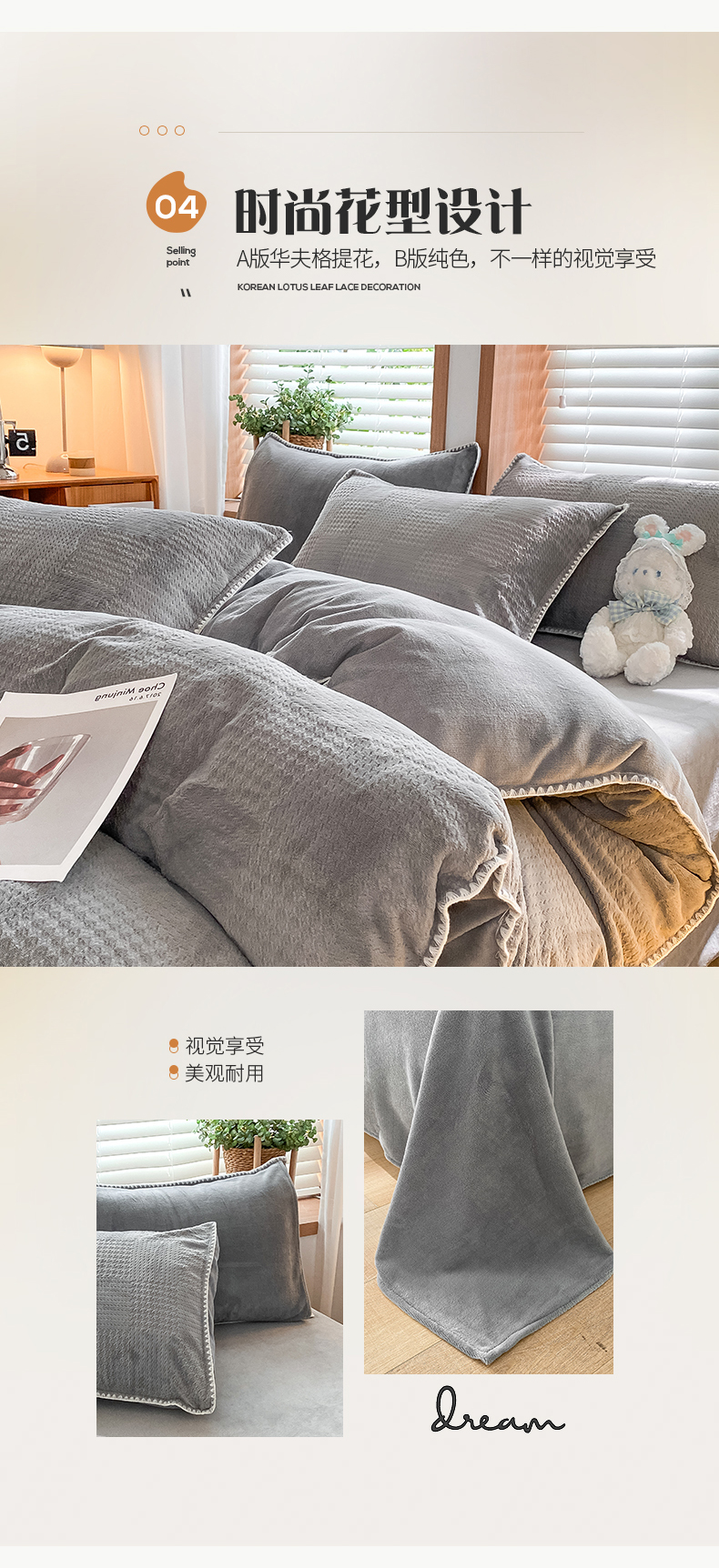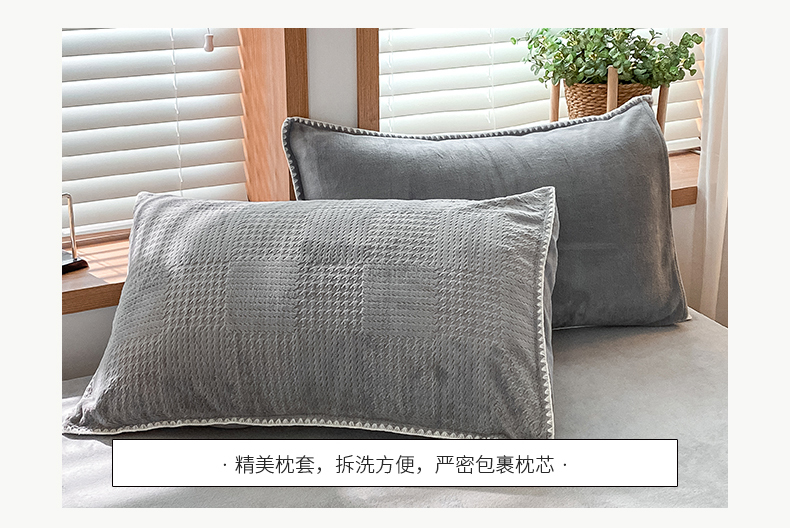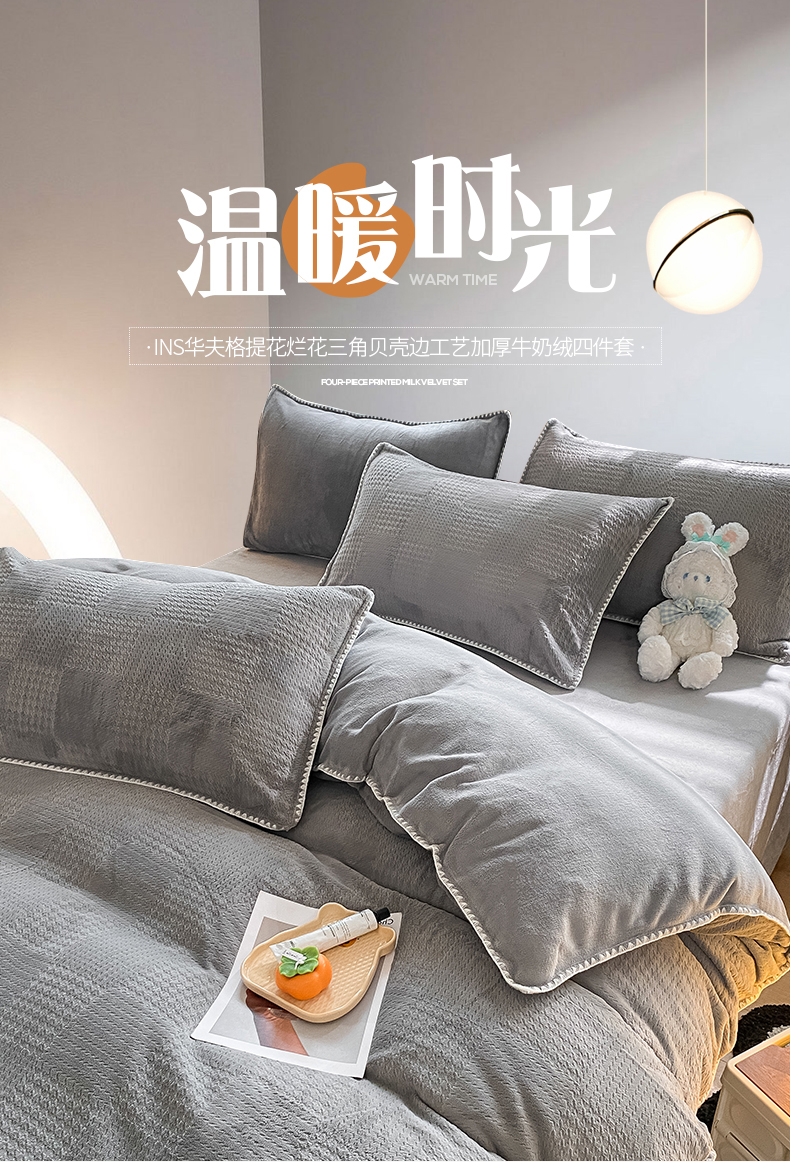 商品名称:桃子家居 2023新款A类无印ins华夫格提花烂花雕花剪花三角贝壳边工艺加厚牛奶绒四件套 绒华夫格-高级灰