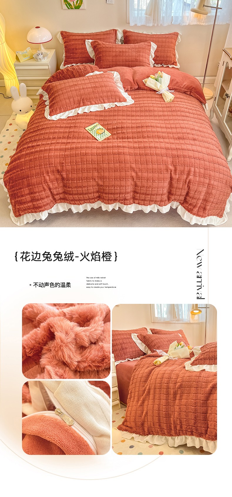 沐辰家居 2023新款兔兔牛奶绒花边款四件套 花边兔兔绒-火焰橙
