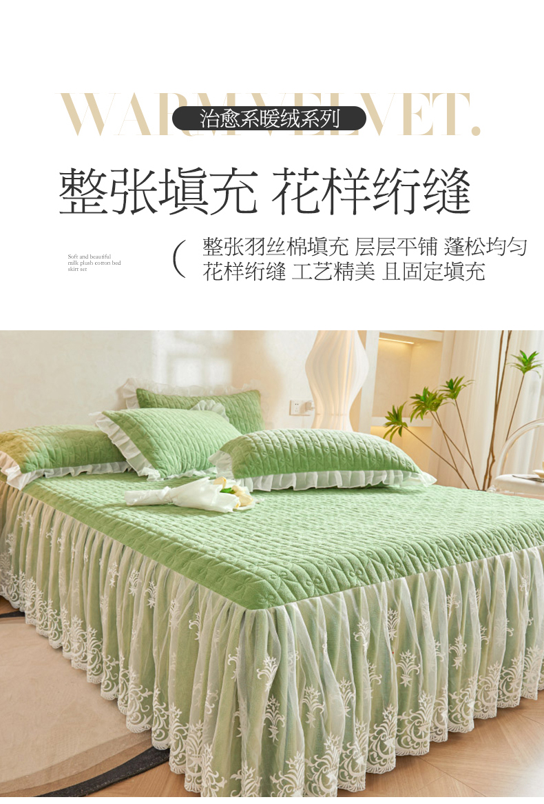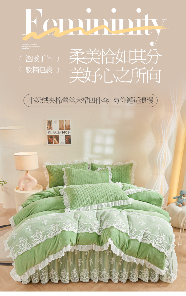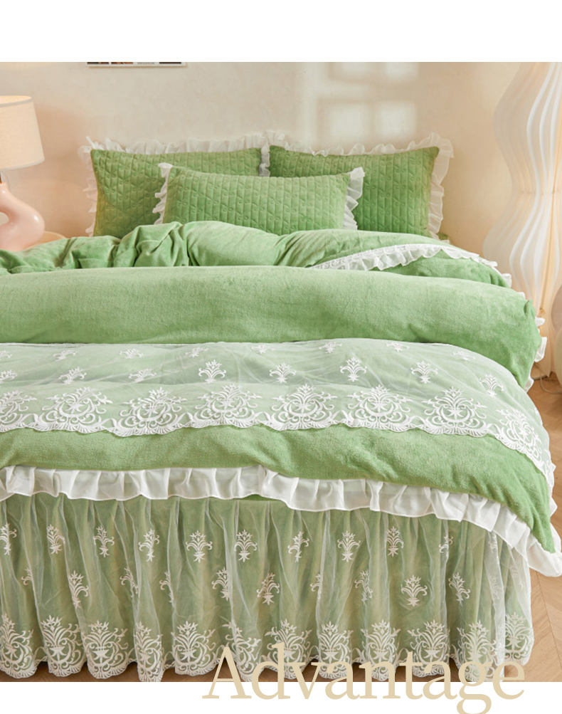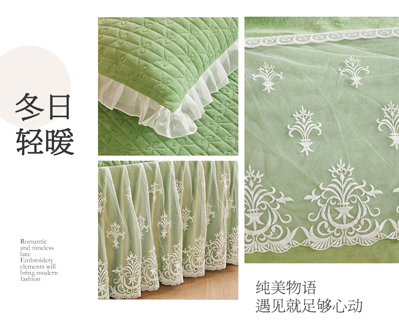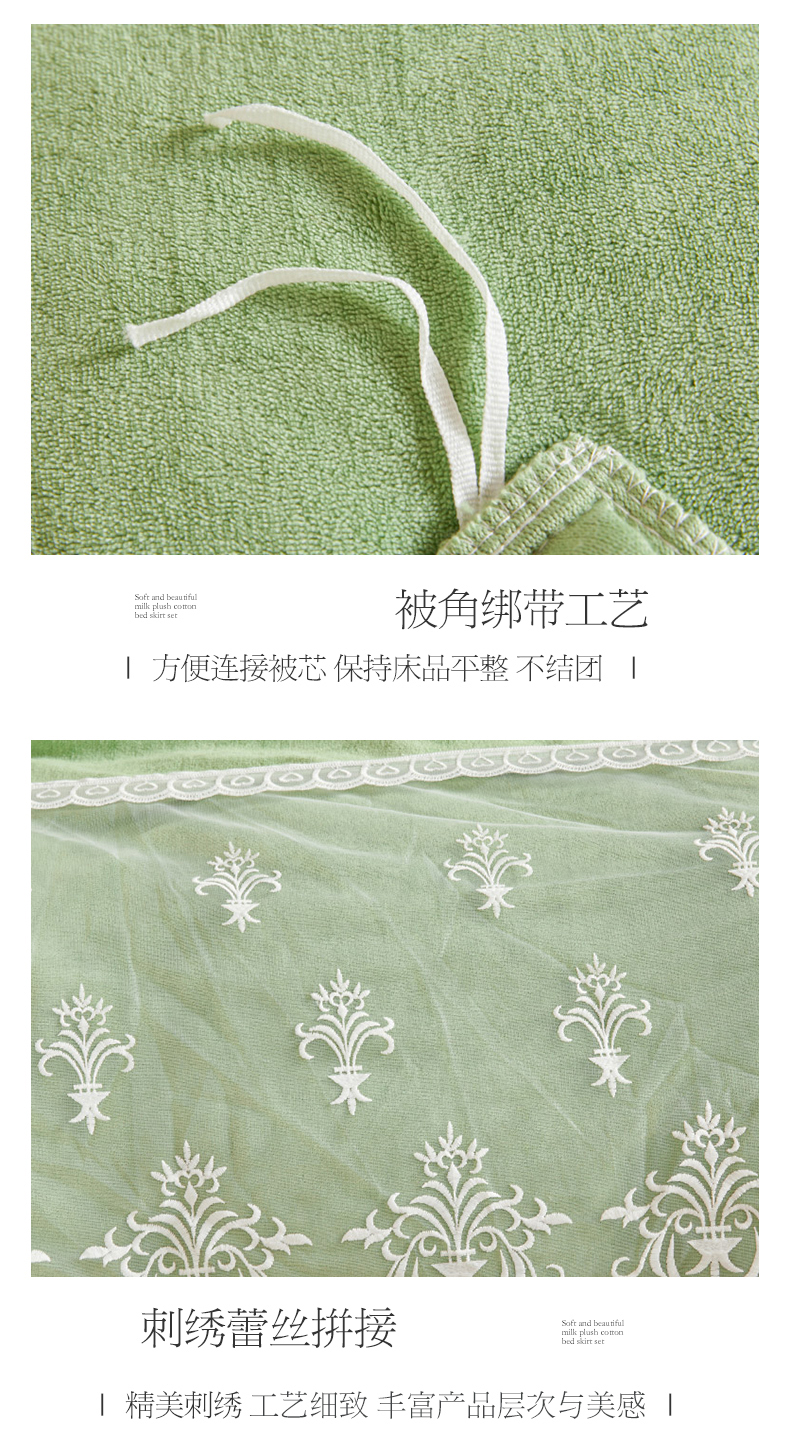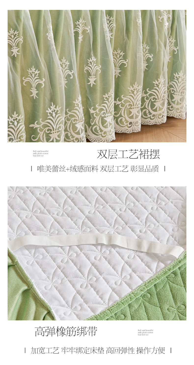 当前位置: 91家纺网 > 商品网购 > 床品套件 > 四件套 > 牛奶绒四件套 > 虹星家纺 2023新款牛奶绒夹棉床裙套件清新系列-床裙款四件套 清新-牛油果绿