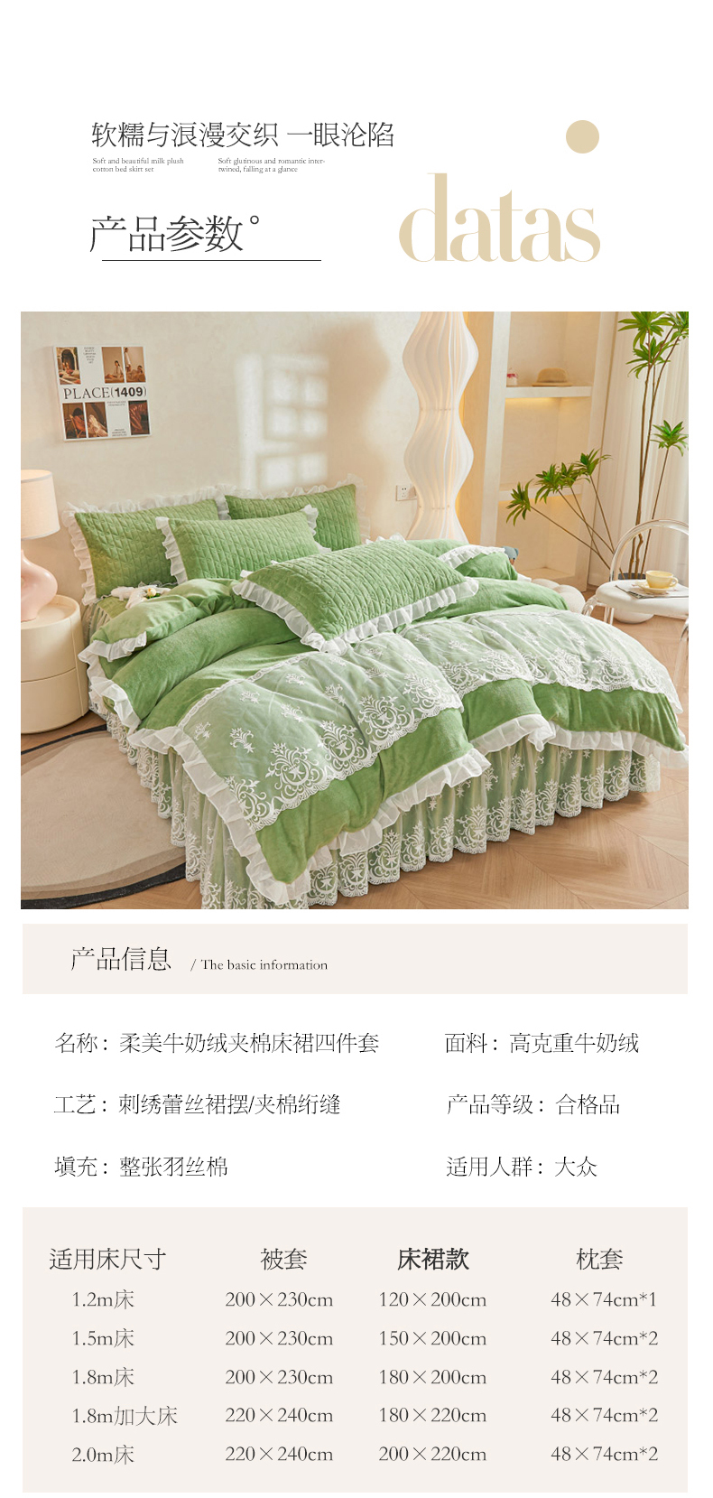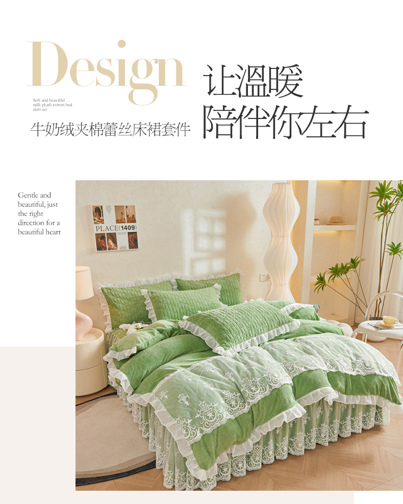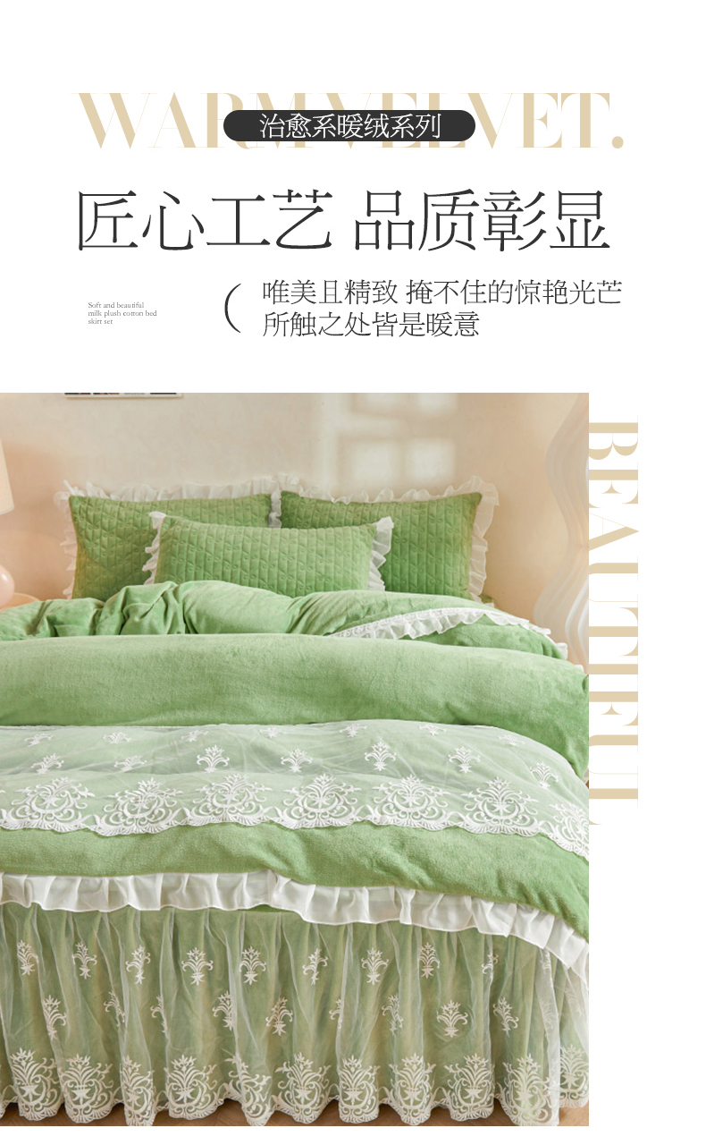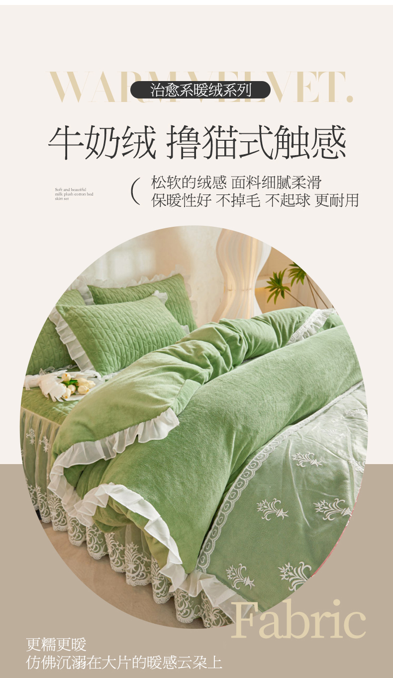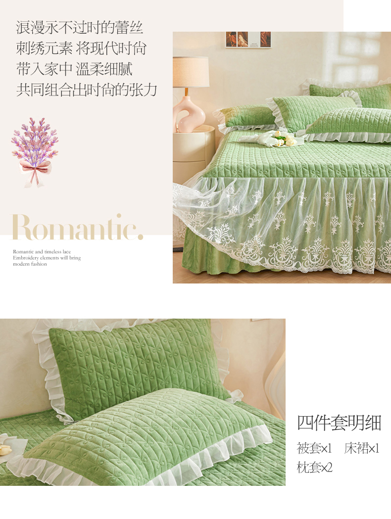当前位置: 91家纺网 > 商品网购 > 床品套件 > 四件套 > 牛奶绒四件套 > 虹星家纺 2023新款牛奶绒夹棉床裙套件清新系列-床裙款四件套 清新-牛油果绿
