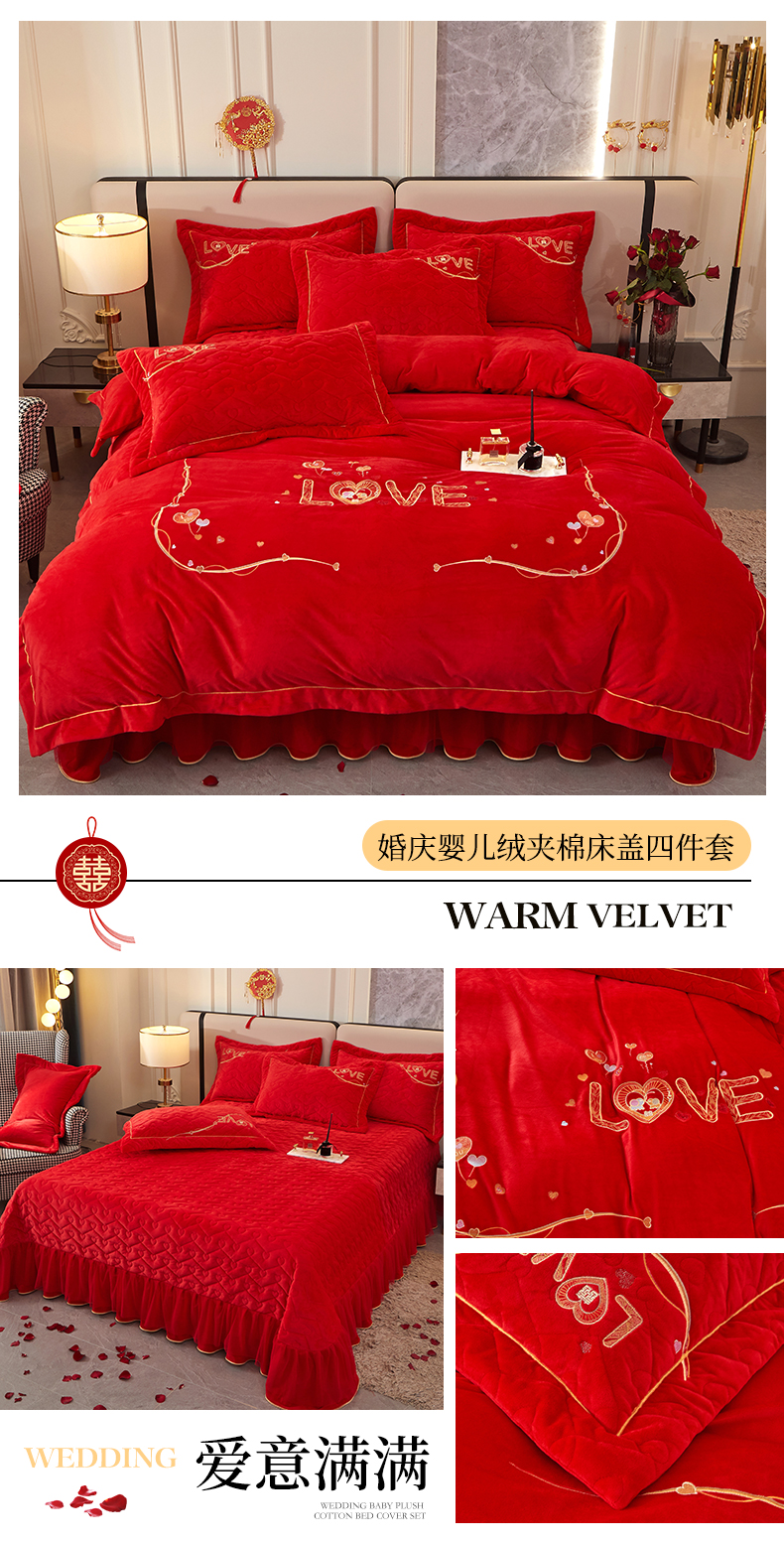 当前位置: 91家纺网 > 商品网购 > 床品套件 > 四件套 > 婚庆四件套 > 宜凡家纺 2023秋冬新品婴儿绒婚庆床盖四件套 爱意满满