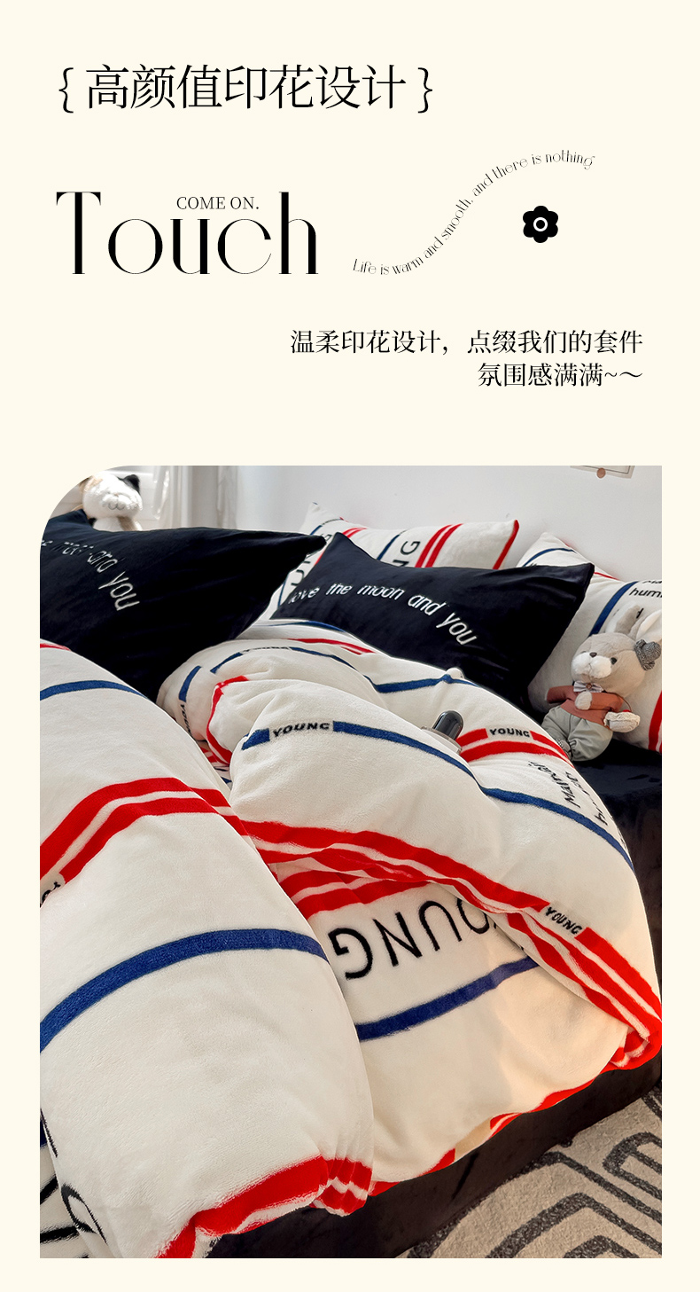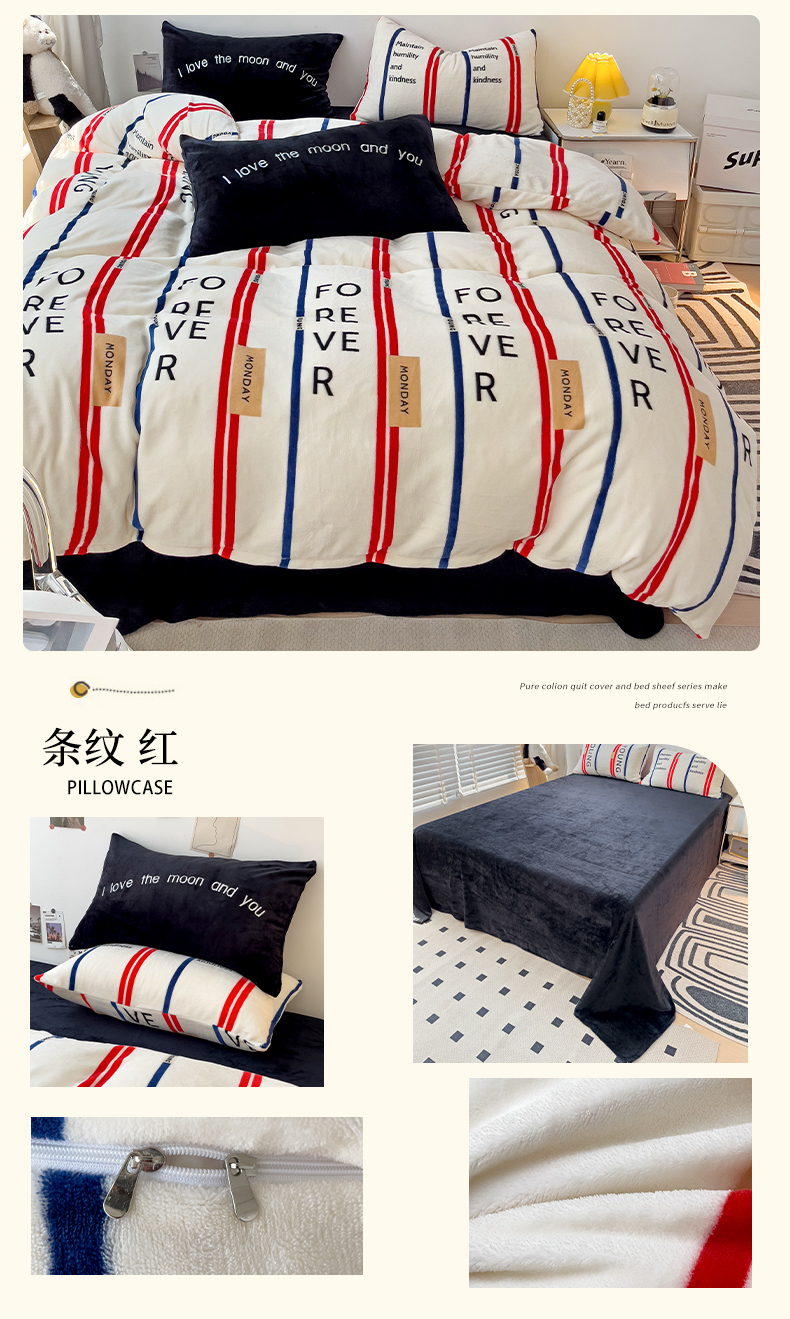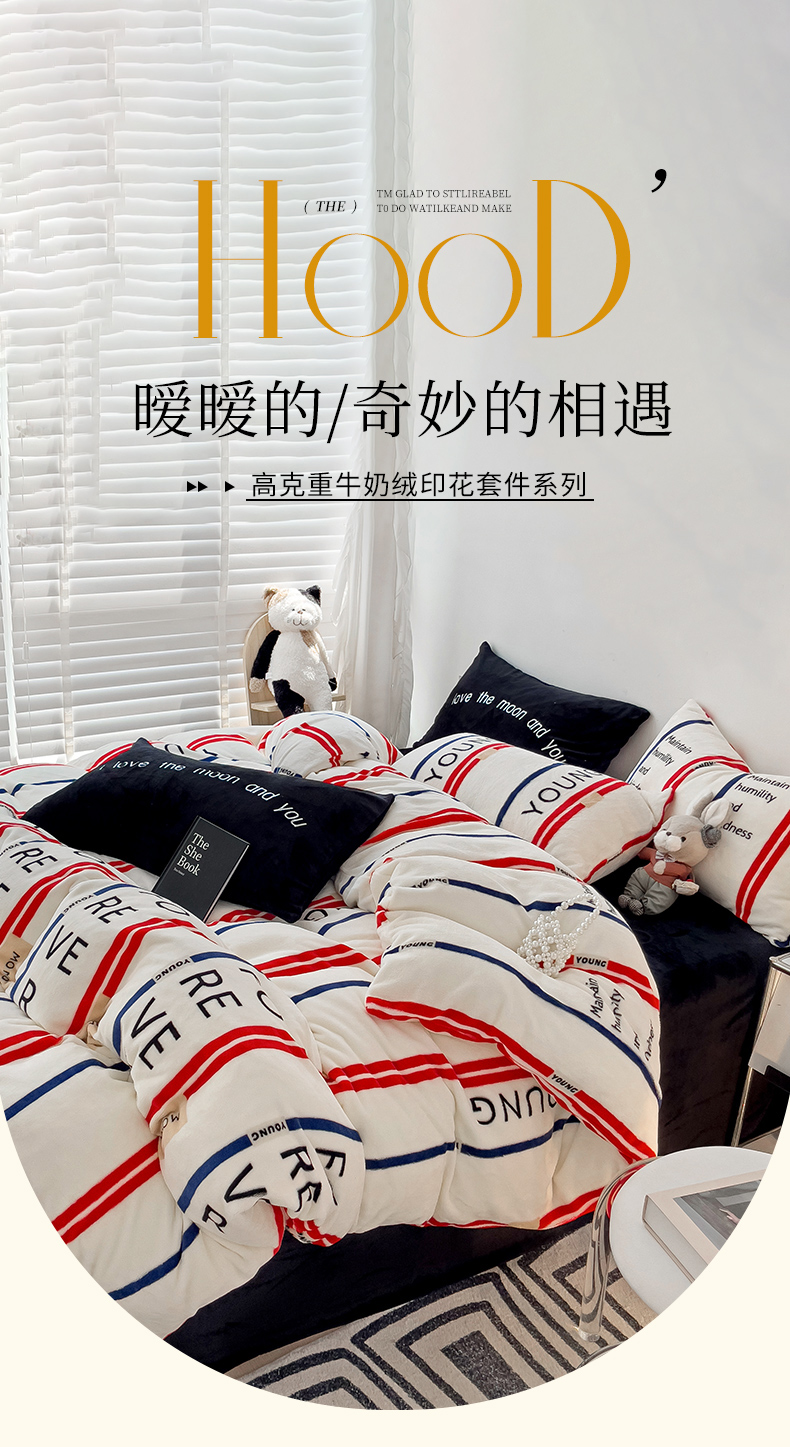 商品名称:山茶家纺 2023新款高克重牛奶绒印花四件套 条纹 红