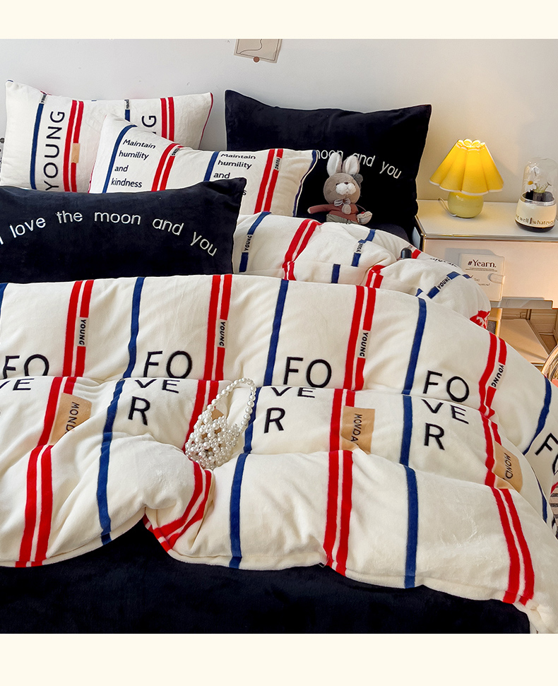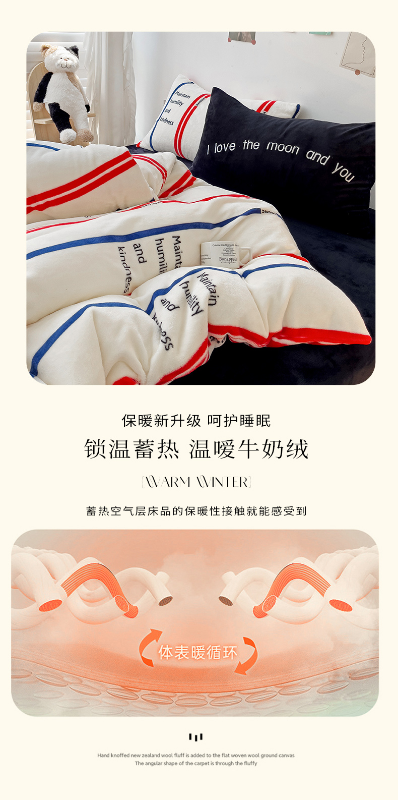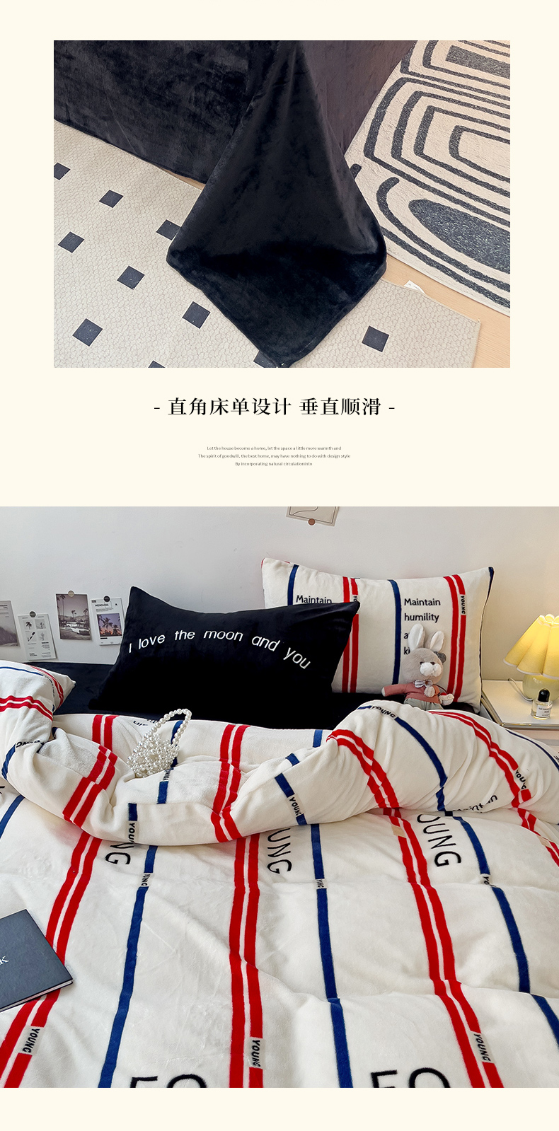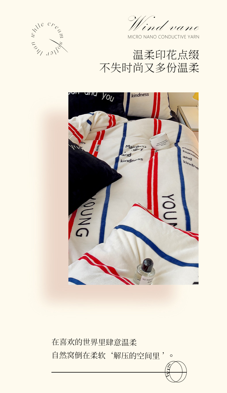 山茶家纺 2023新款高克重牛奶绒印花四件套 条纹 红