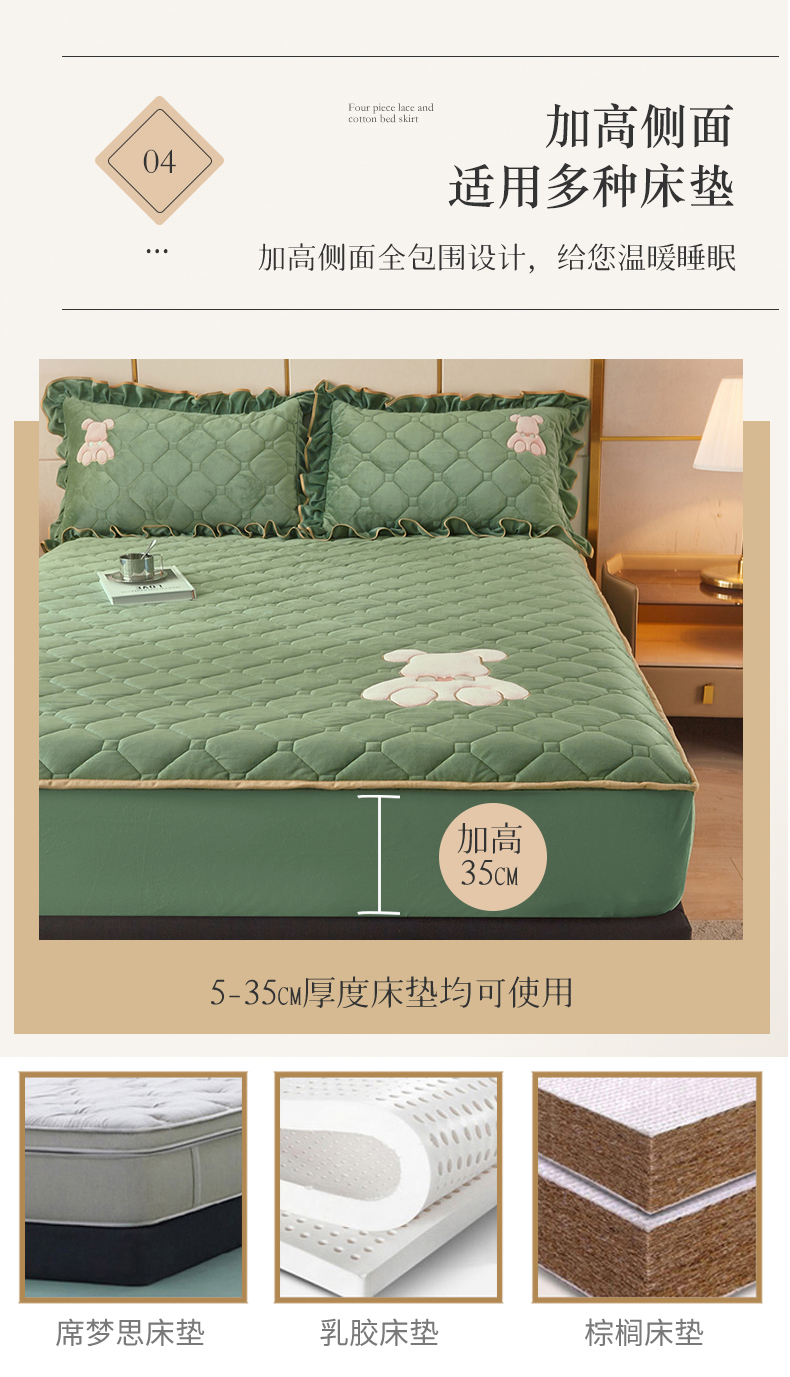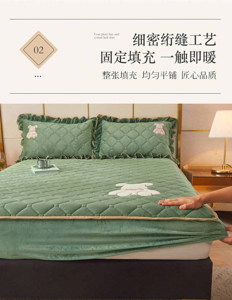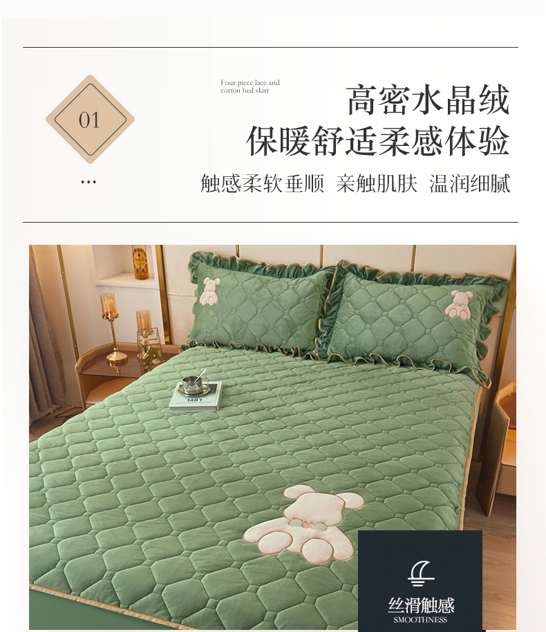 (总)屹成家纺2025新款水晶绒夹棉绗缝蕾丝床裙三件套(塞纳河畔)床裙单件起售价不低于105元,大红,豆沙,翡翠绿,粉玉,橄榄绿,蔚蓝,银灰