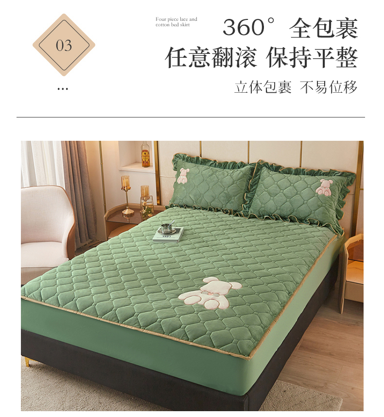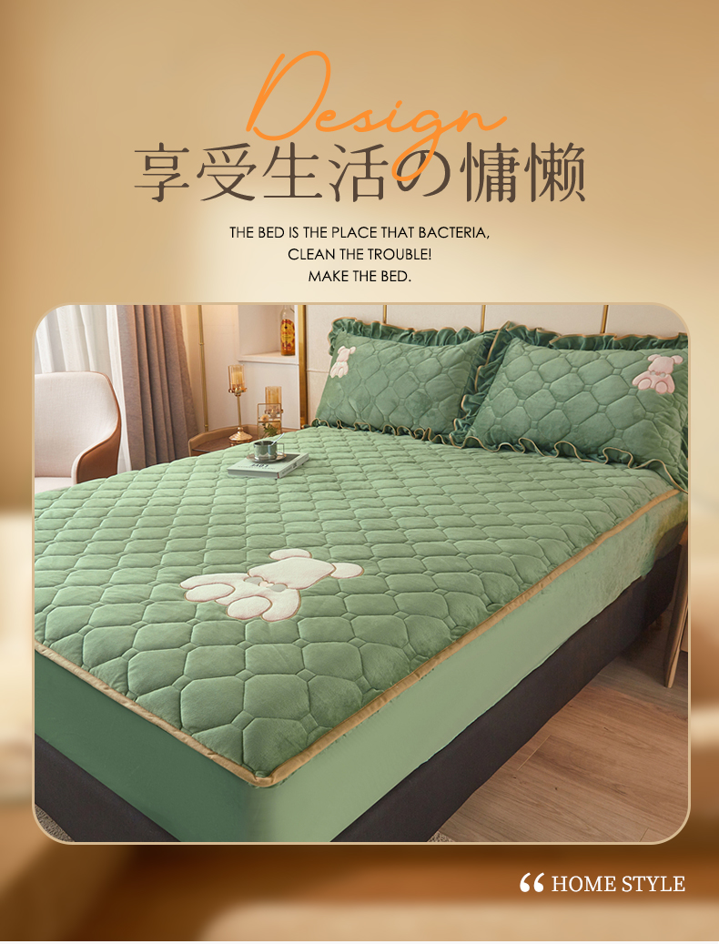 屹成 2024新款亲肤水晶绒夹棉单床笠-小熊款 橄榄緑