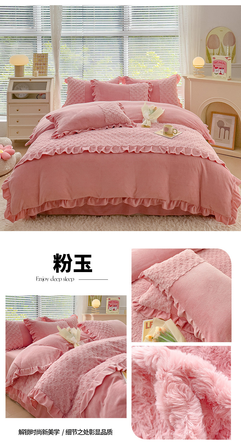 商品名称:金米诺 2024新款加厚保暖韩式双层花边玫瑰兔绒系列四件套 粉玉