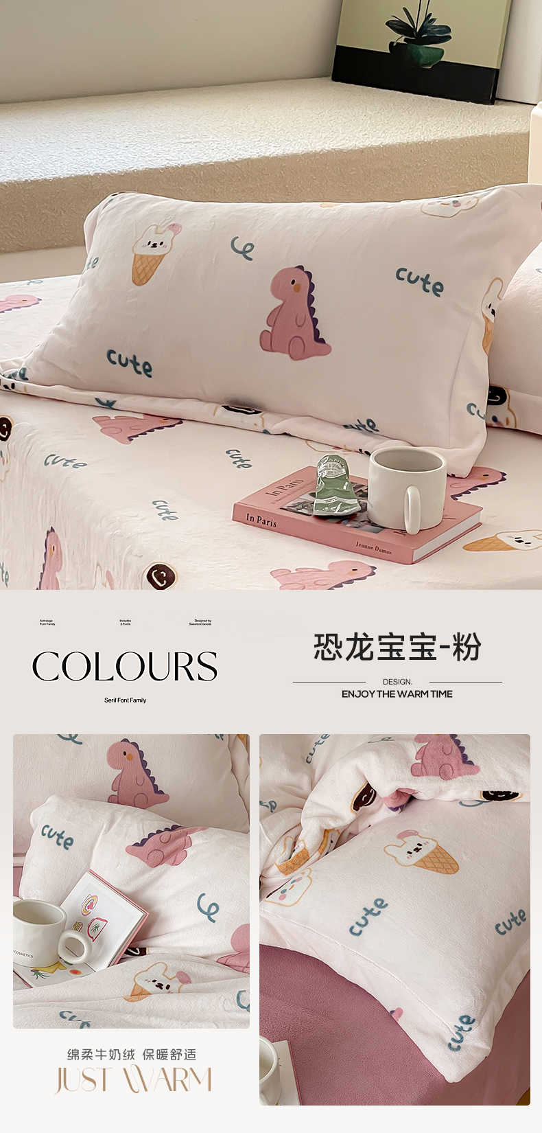商品名称:时光里 2023新款全消光加厚牛奶绒印花单品单枕套 恐龙宝宝-粉