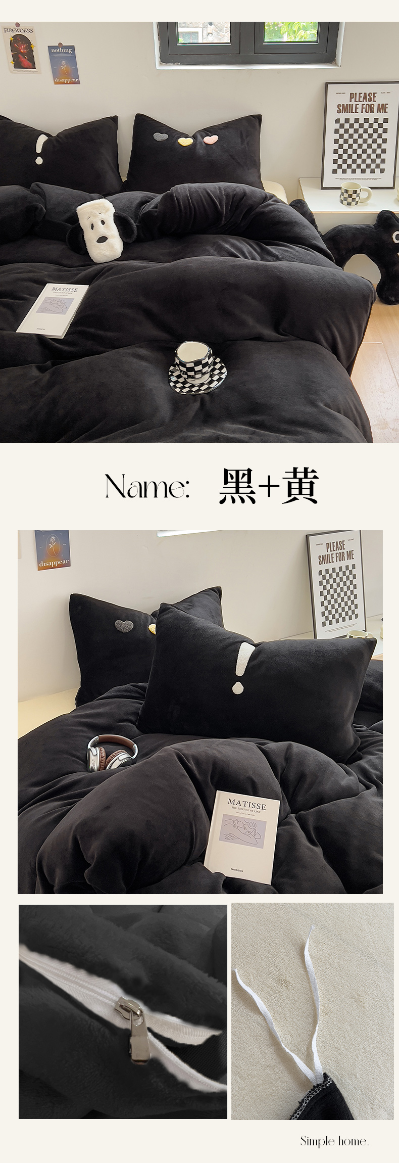 商品名称:山茶家纺 2023新款黑色系毛巾绣纯色牛奶绒四件套 黑色系-黑+黄
