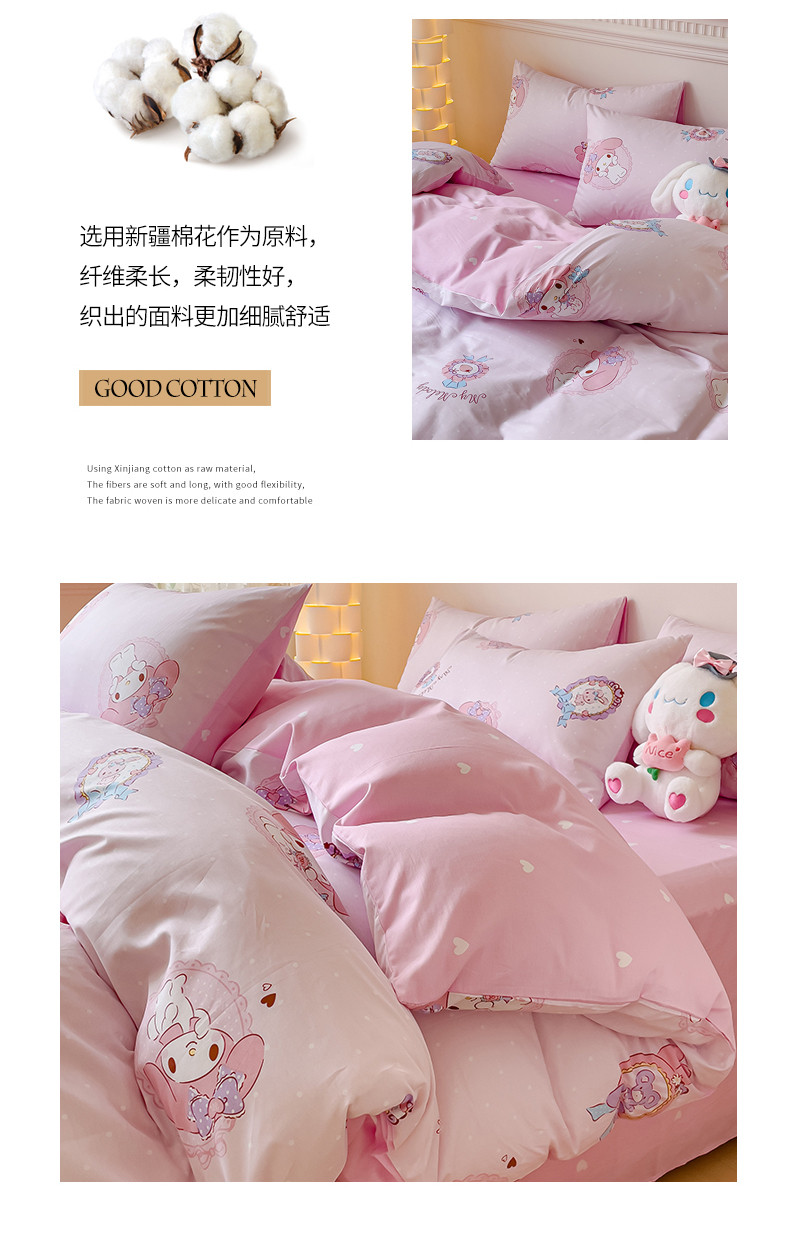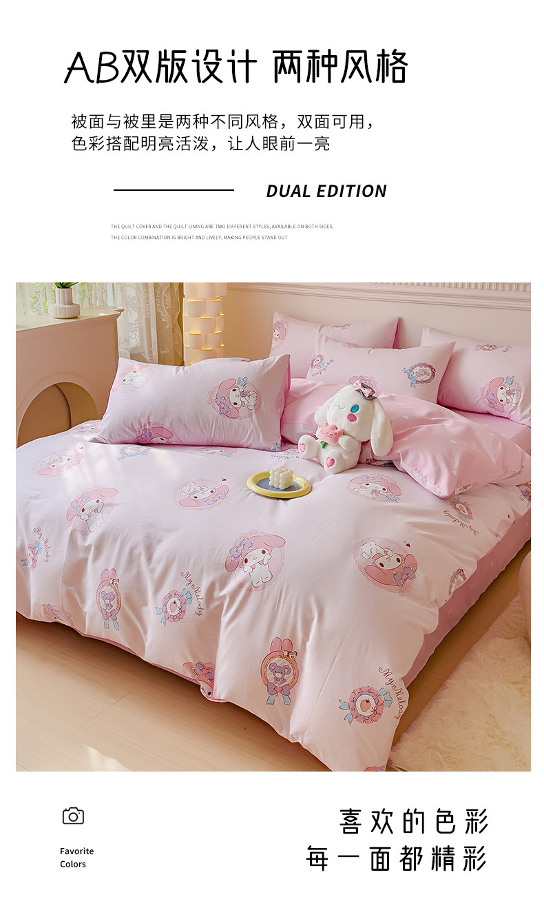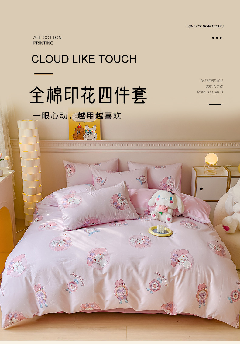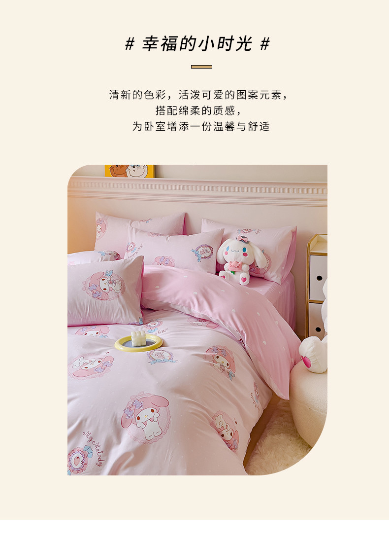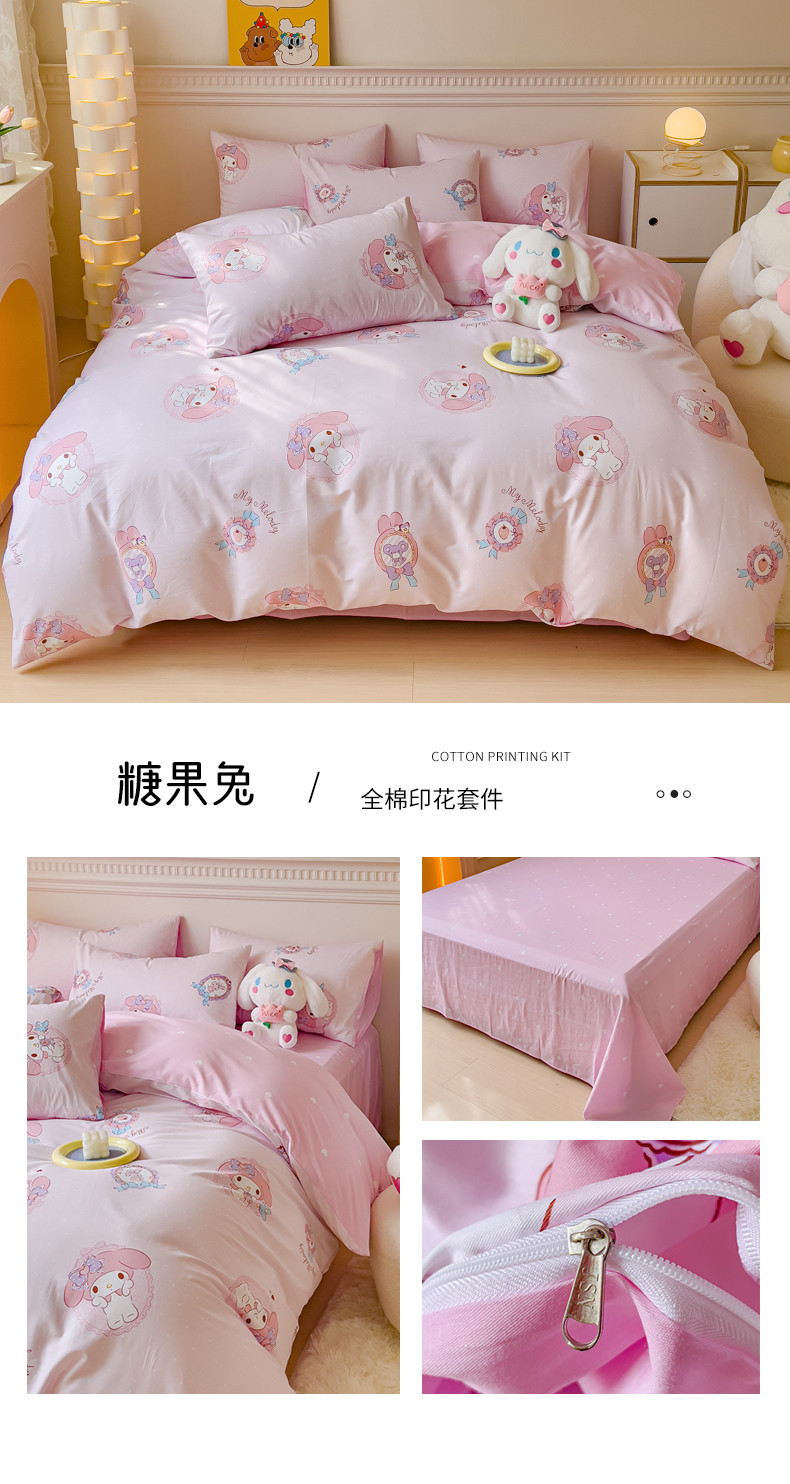 当前位置: 91家纺网 > 商品网购 > 床品套件 > 四件套 > 全棉普通四件套 > 金丝鸟家纺 2023新款全棉印花三利欧库洛米系列四件套 糖果兔