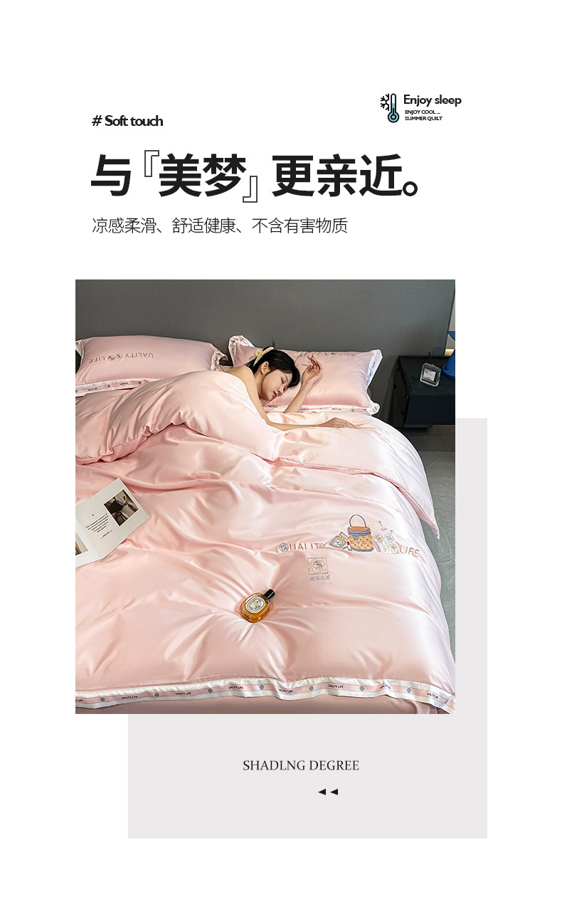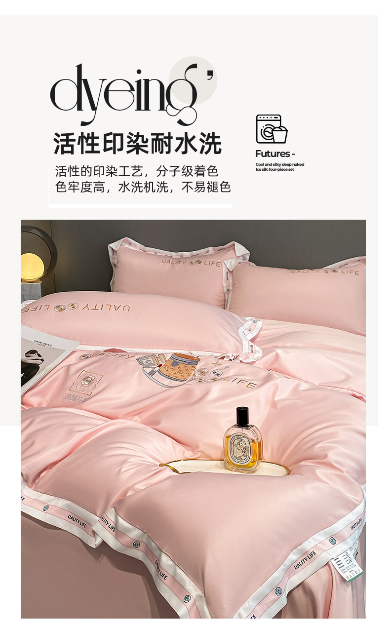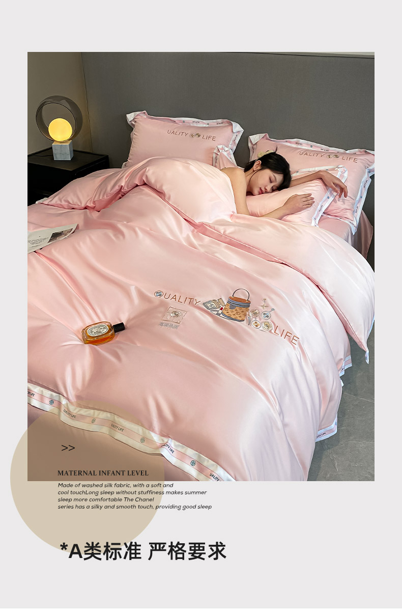 商品名称:丝印良品 2024新款大牌风60S水洗真丝刺绣床笠被套四件套香奈系列 香奈-优雅粉