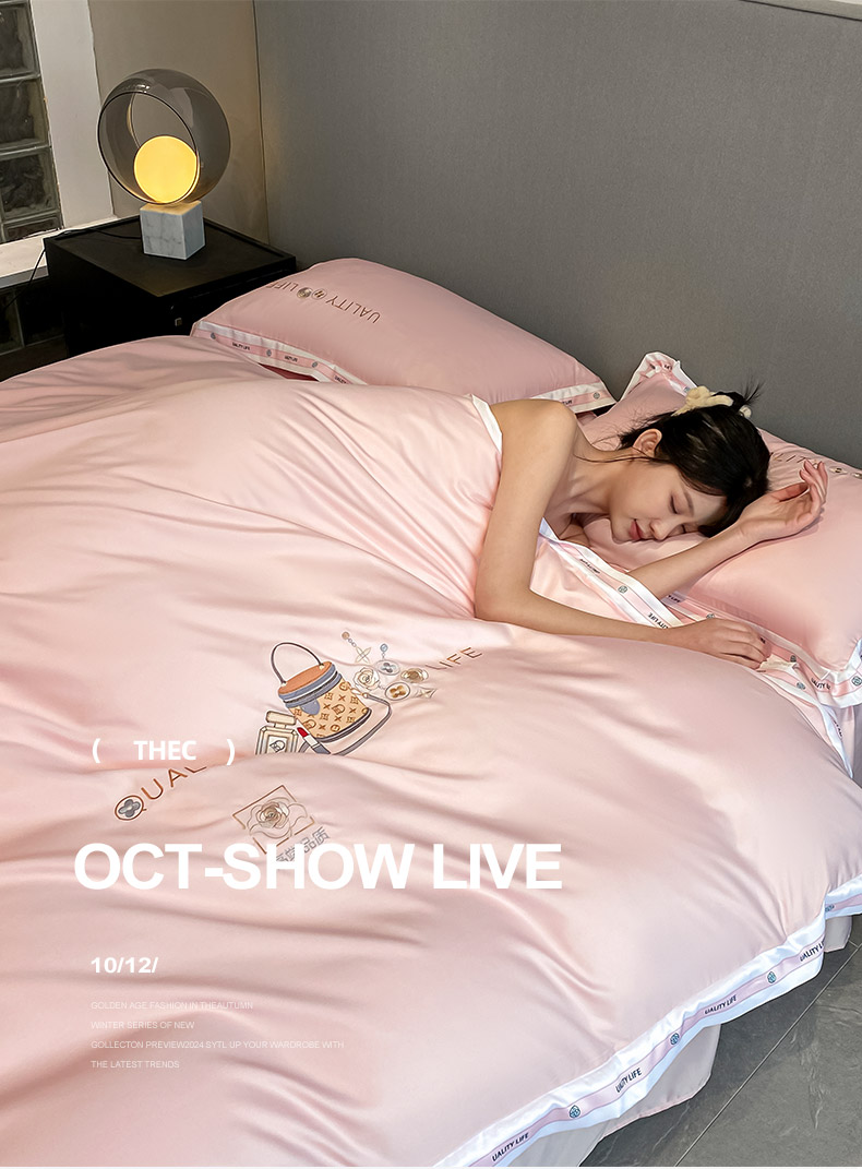 丝印良品 2024新款大牌风60S水洗真丝刺绣床笠被套四件套香奈系列 香奈-优雅粉