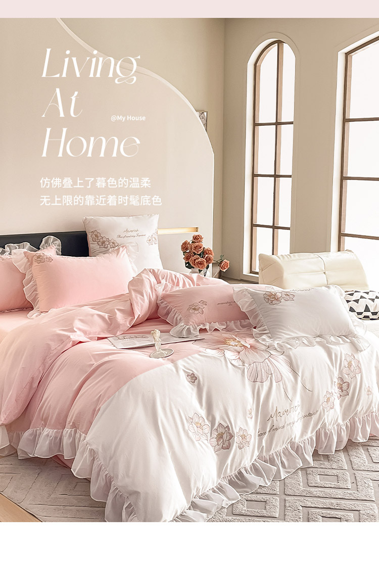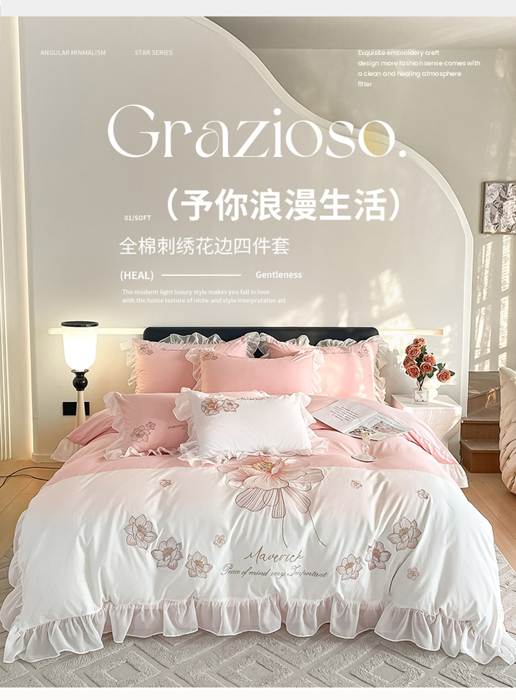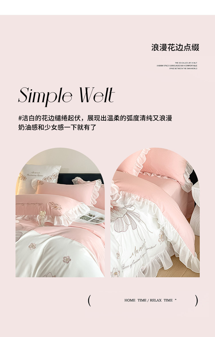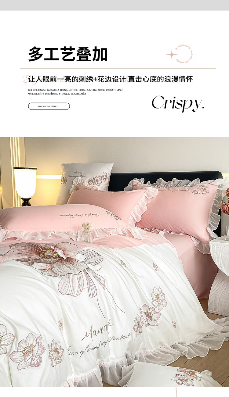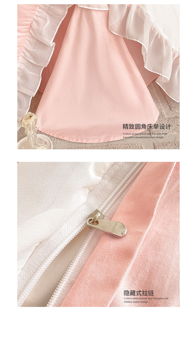 绒世界 2024新款艾芙妮全棉蕾丝花边刺绣床单床笠四件套礼盒包装 优雅粉