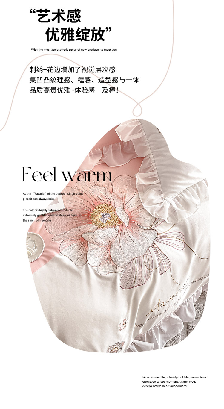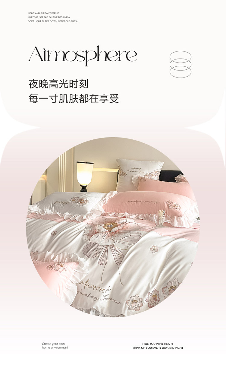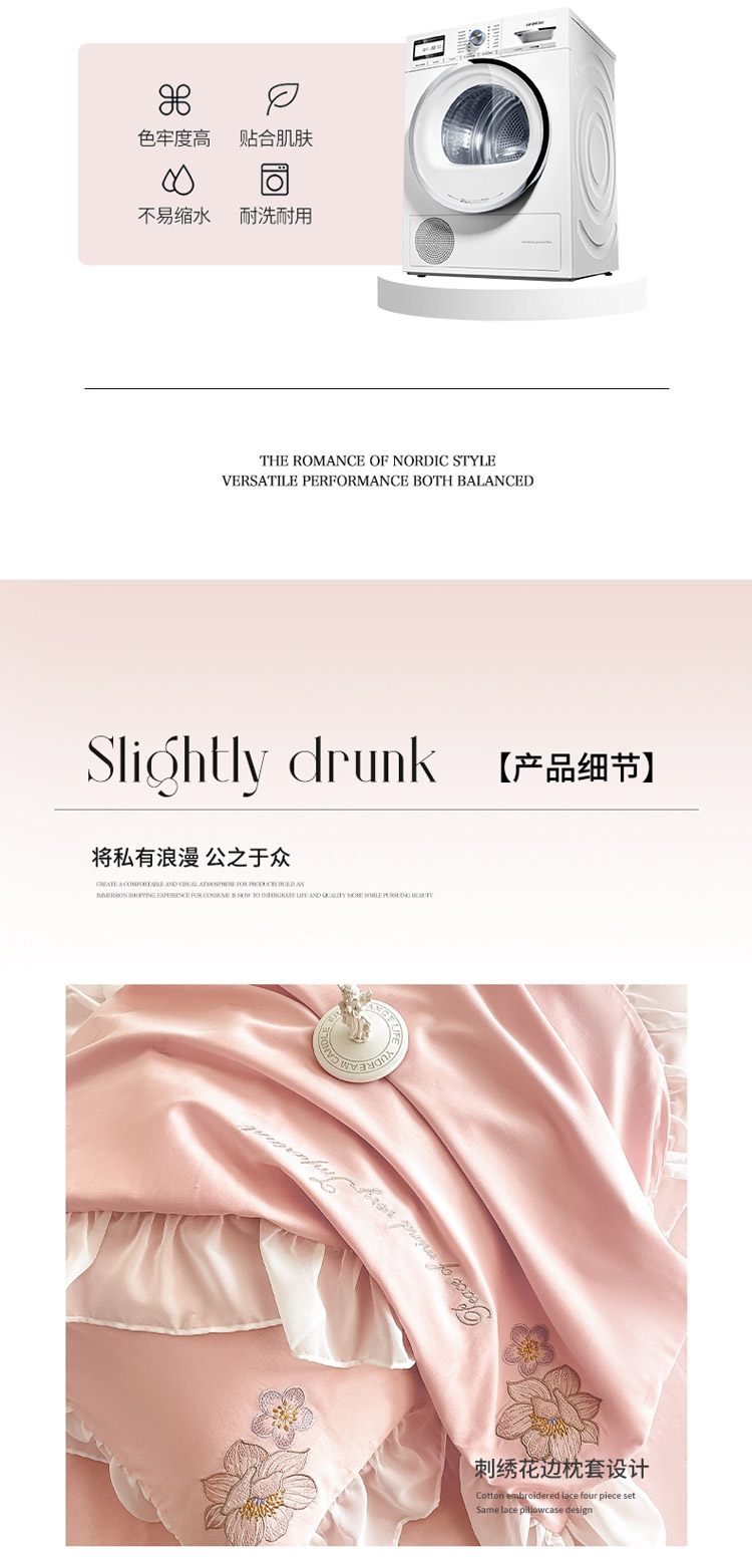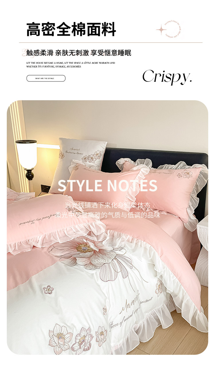 绒世界 2024新款艾芙妮全棉蕾丝花边刺绣床单床笠四件套礼盒包装 优雅粉