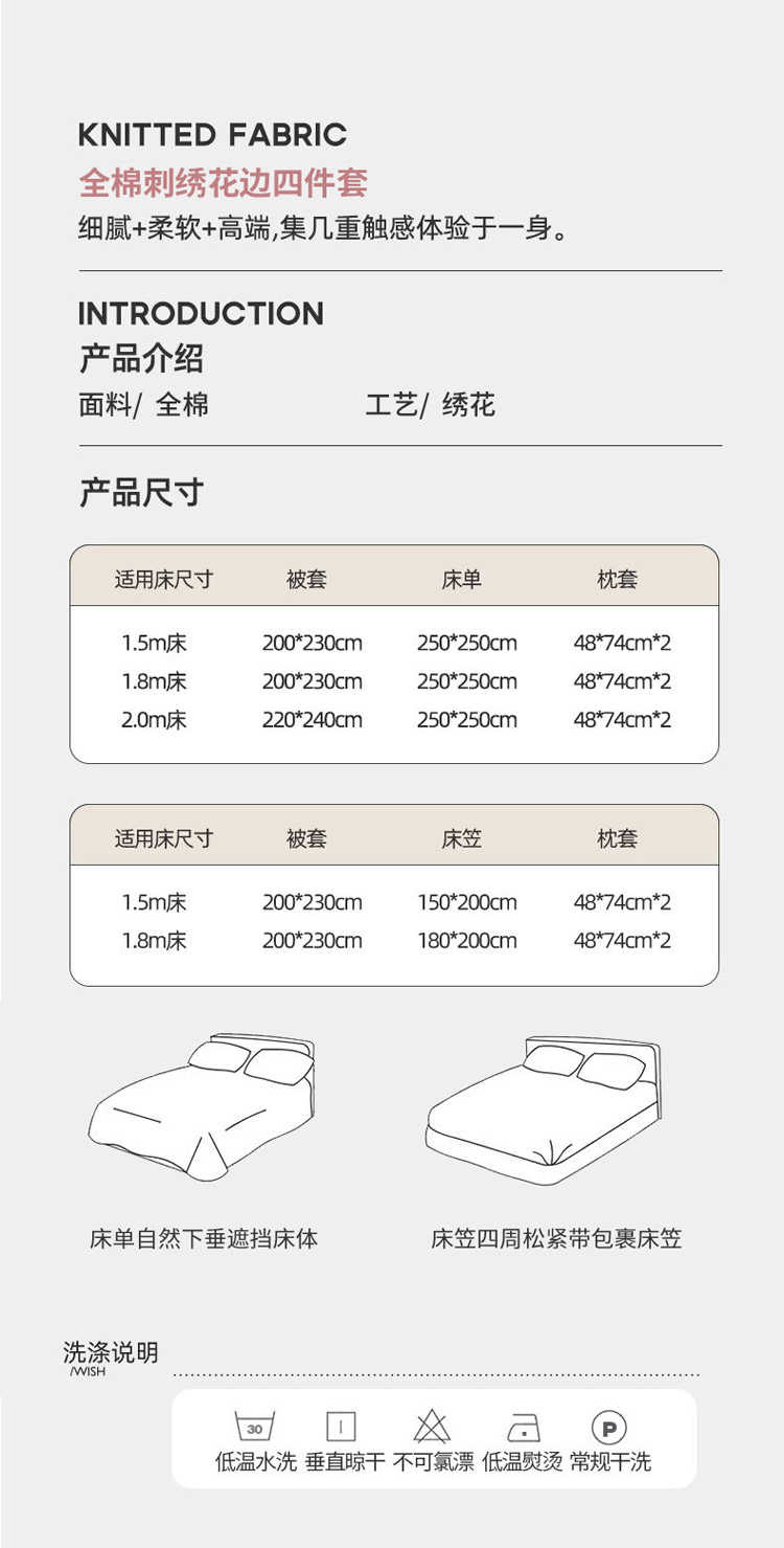 商品名称:绒世界 2024新款艾芙妮全棉蕾丝花边刺绣床单床笠四件套礼盒包装 优雅粉