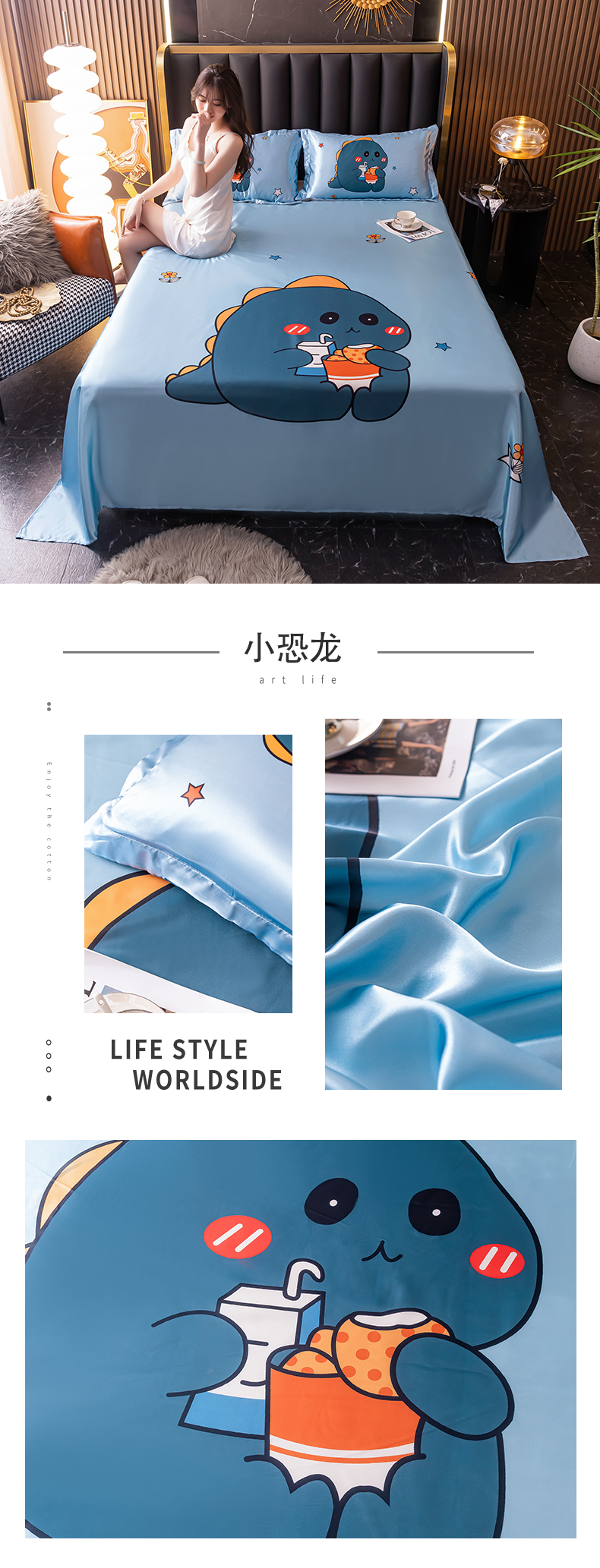 商品名称:梦舒羽 2025新款大版可水洗冰丝床单宿舍床垫保护罩三件套 小恐龙