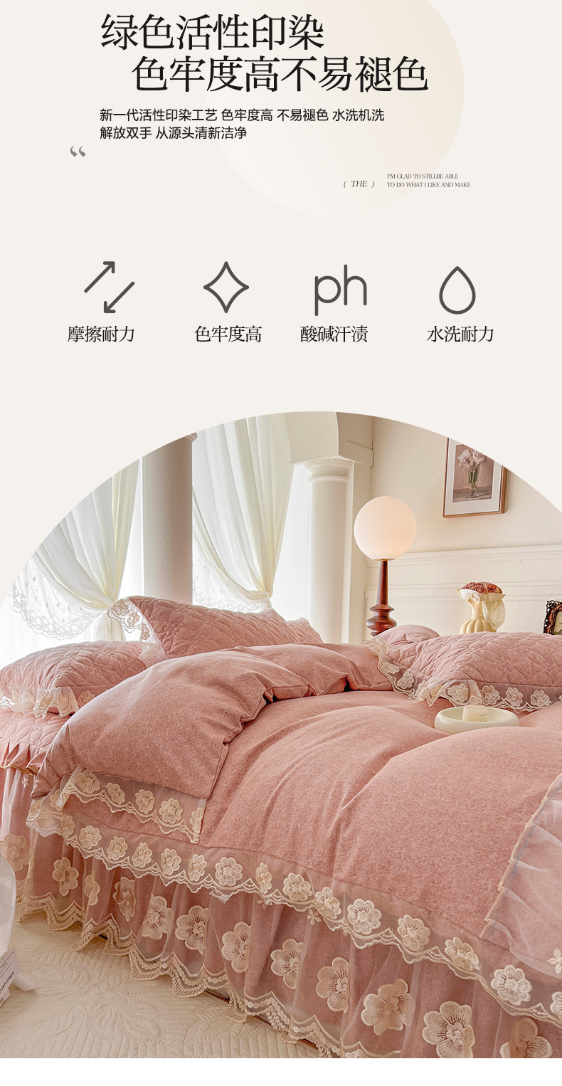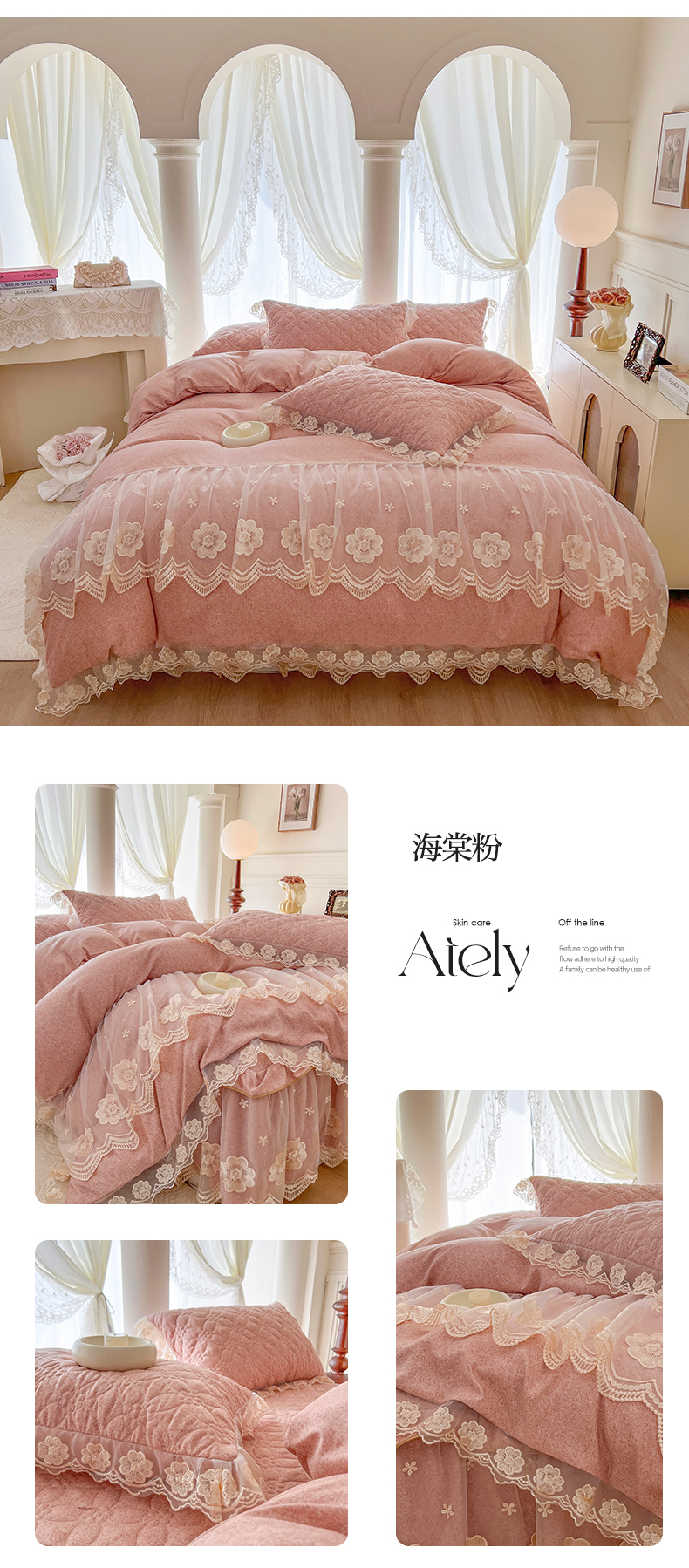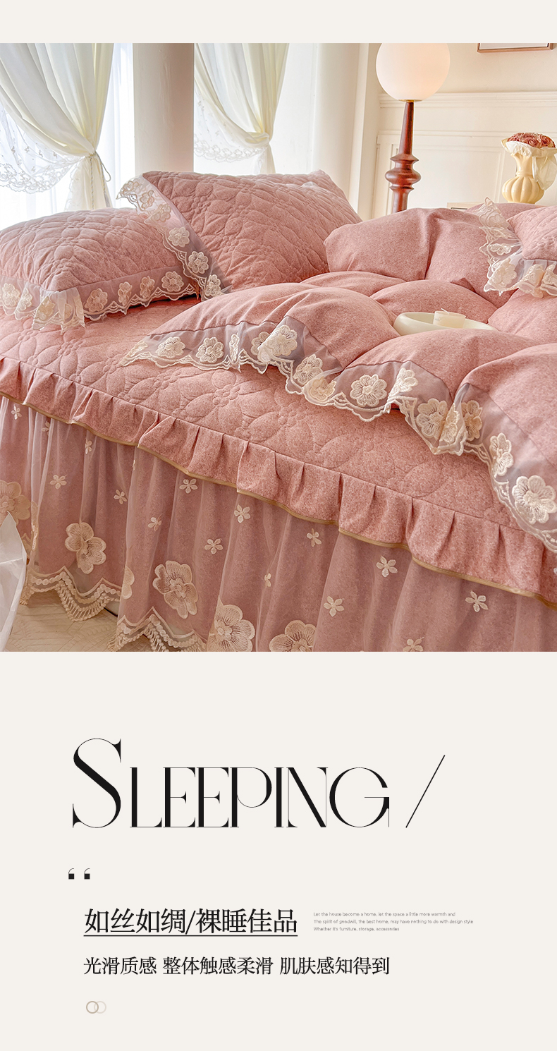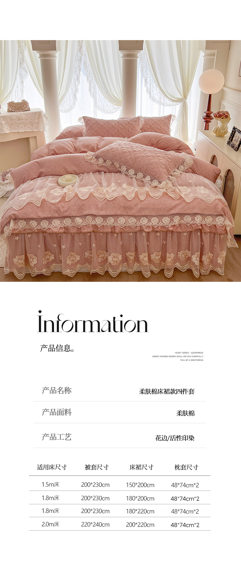 当前位置: 91家纺网 > 商品网购 > 床品套件 > 四件套 > 化纤普通四件套 > 网红馆 2025新款柔肤棉四件套床裙花边款艾丽莎系列 海棠粉