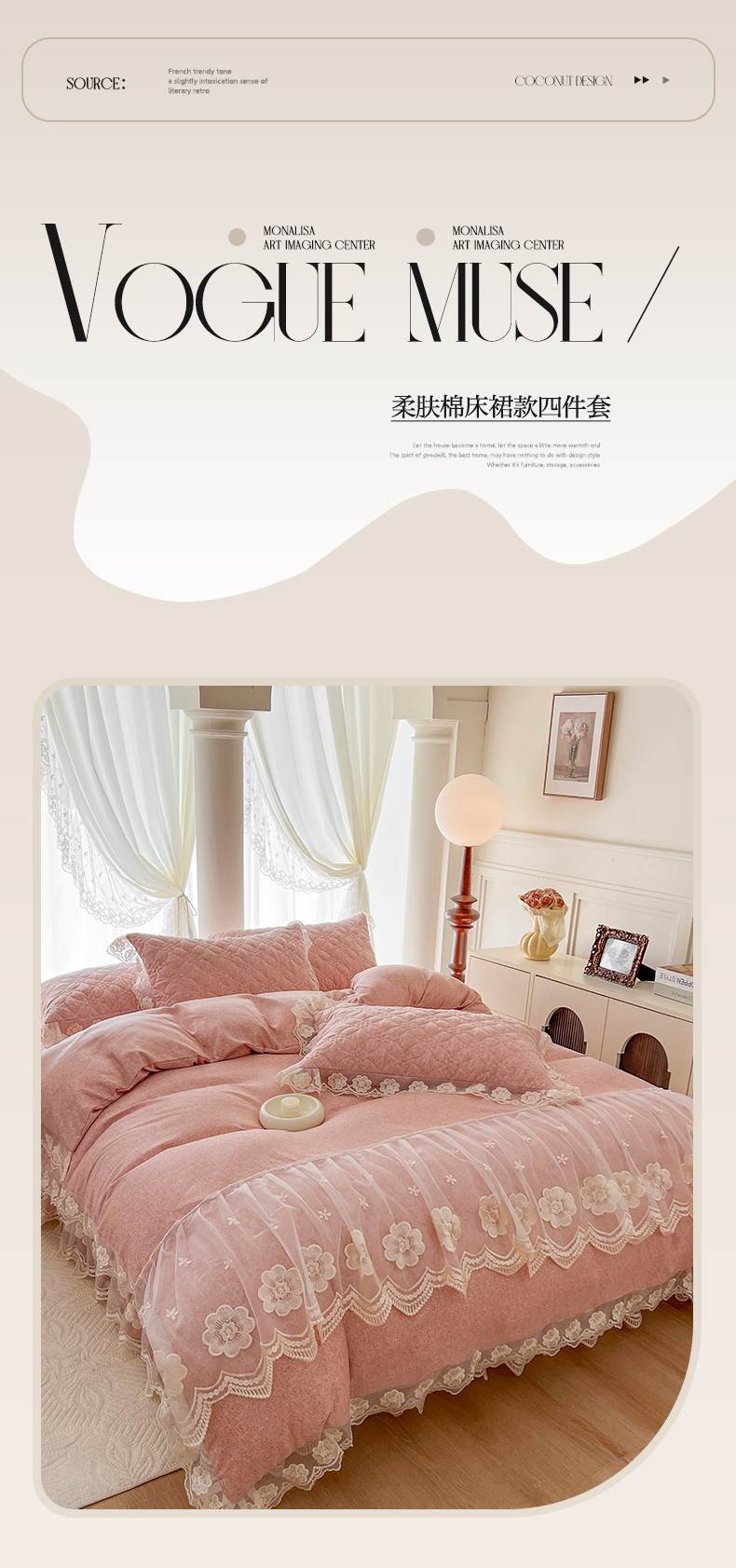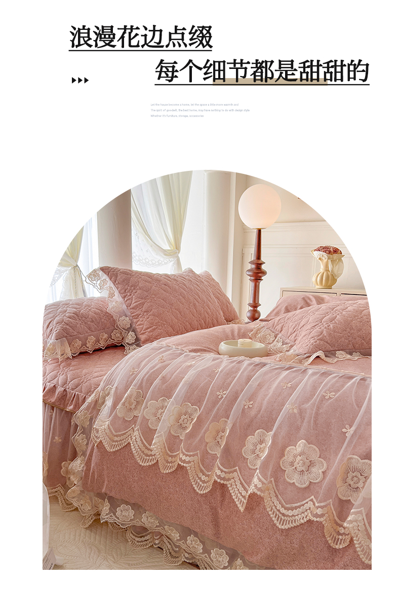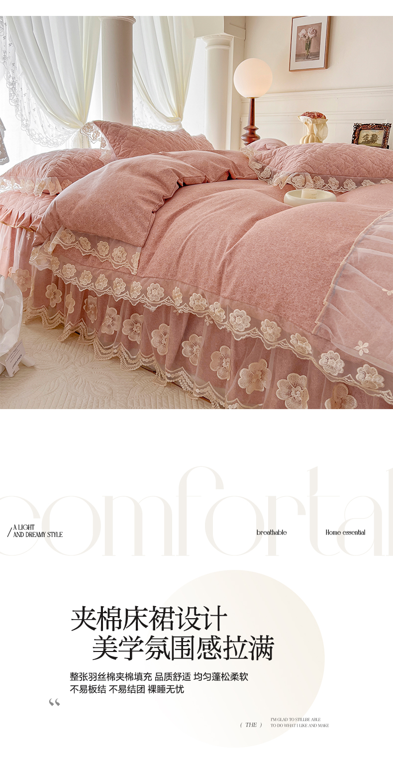 当前位置: 91家纺网 > 商品网购 > 床品套件 > 四件套 > 化纤普通四件套 > 网红馆 2025新款柔肤棉四件套床裙花边款艾丽莎系列 海棠粉