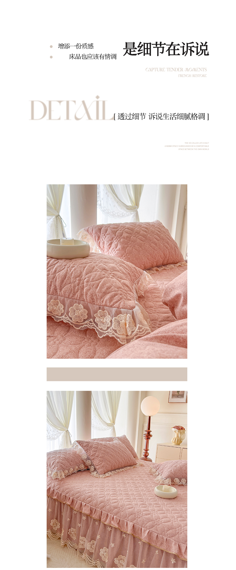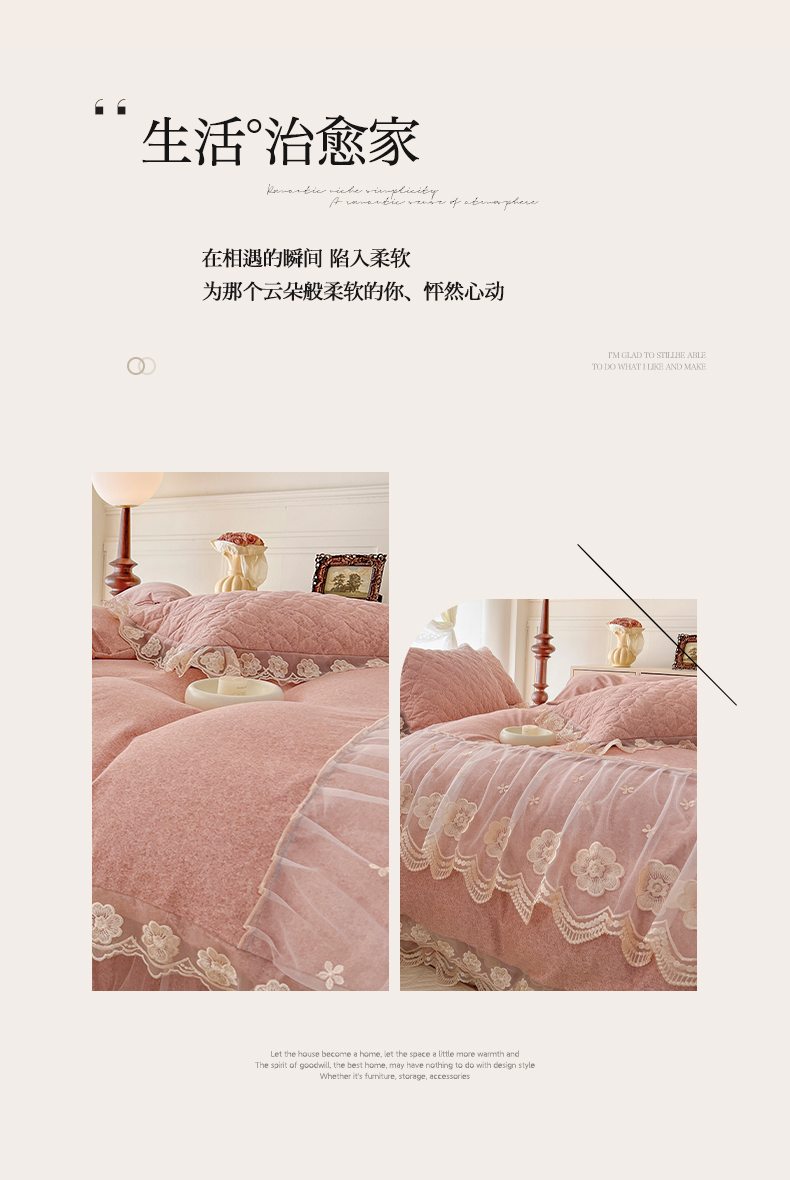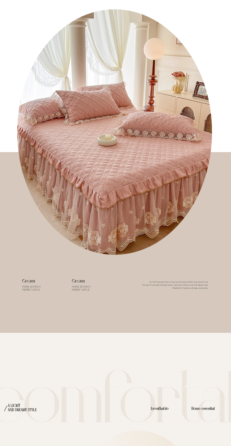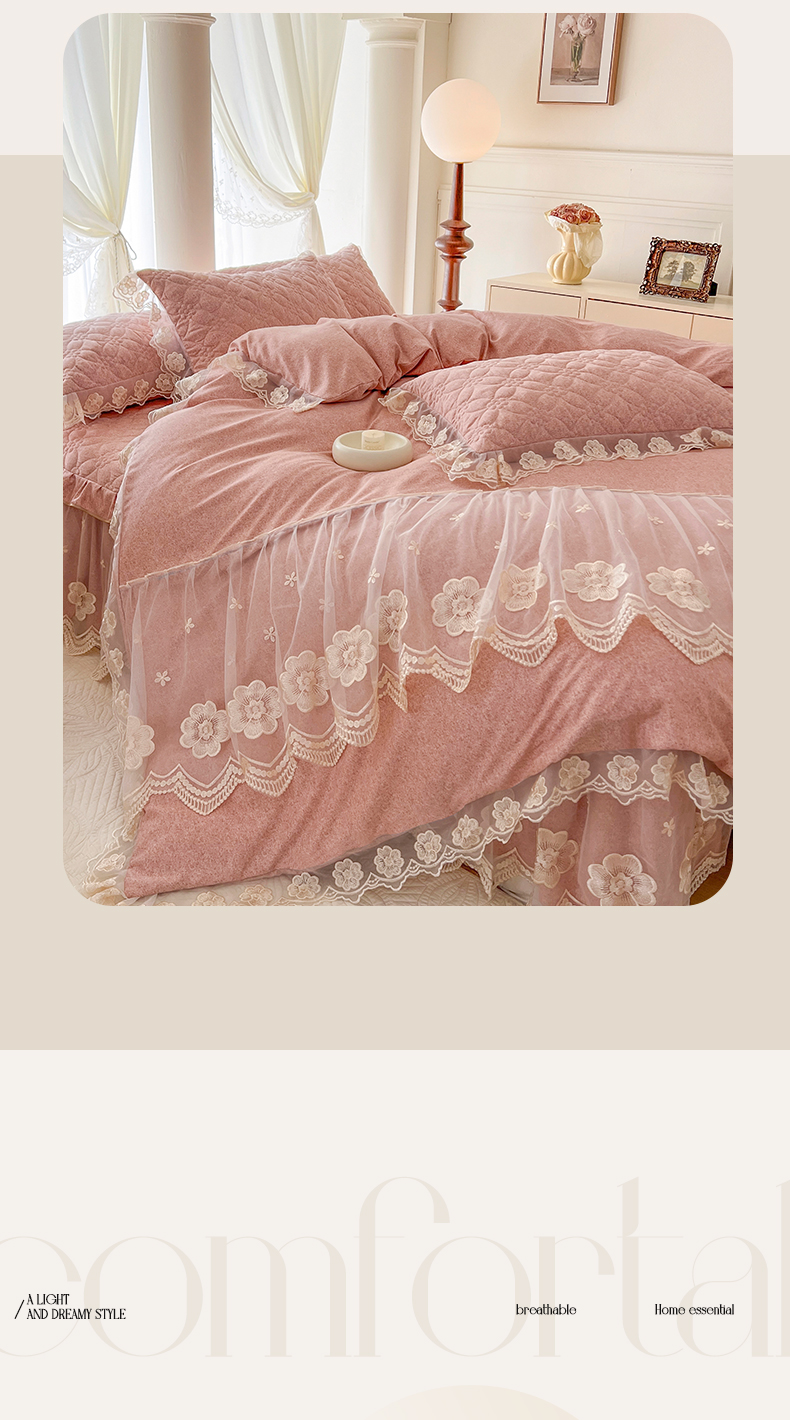 当前位置: 91家纺网 > 商品网购 > 床品套件 > 四件套 > 化纤普通四件套 > 网红馆 2025新款柔肤棉四件套床裙花边款艾丽莎系列 海棠粉