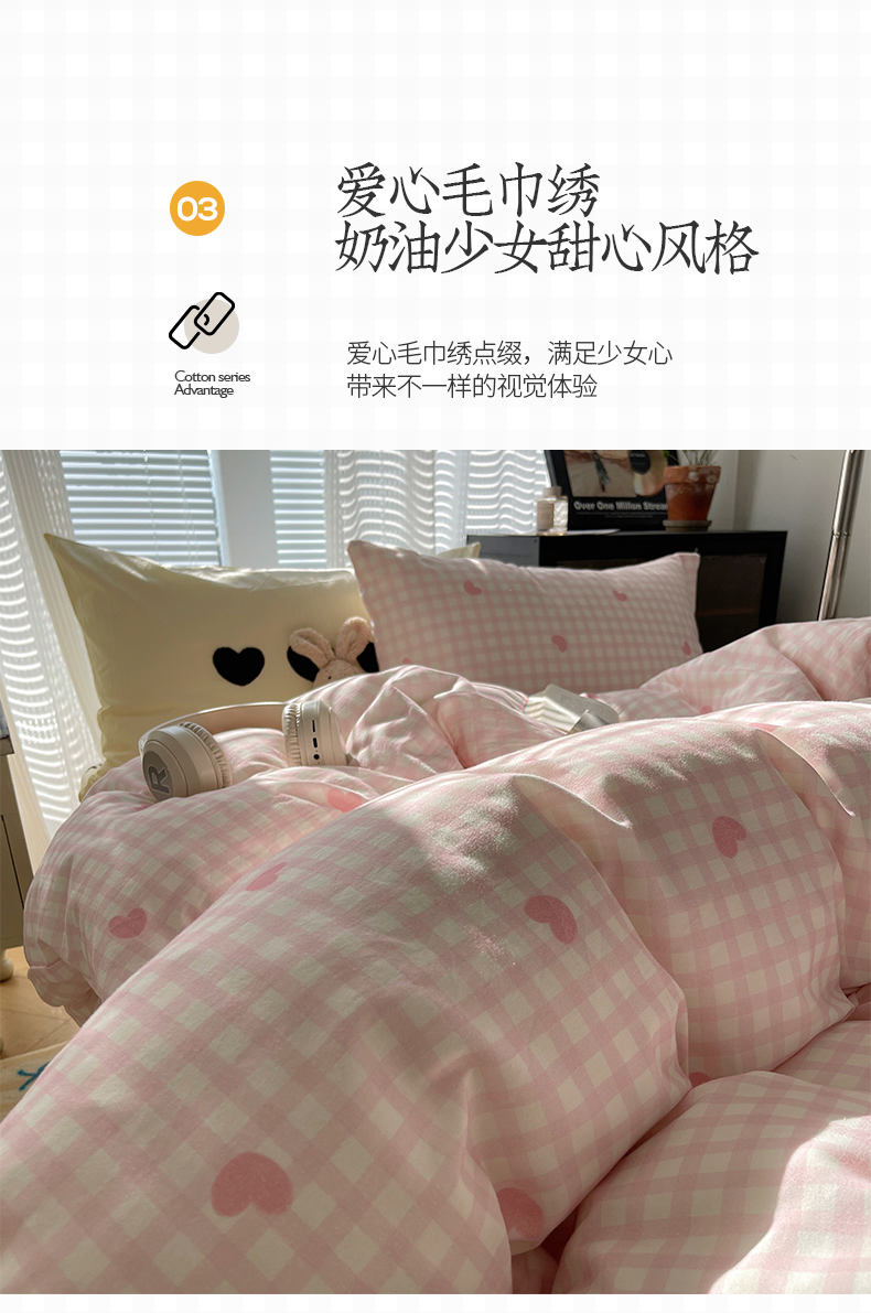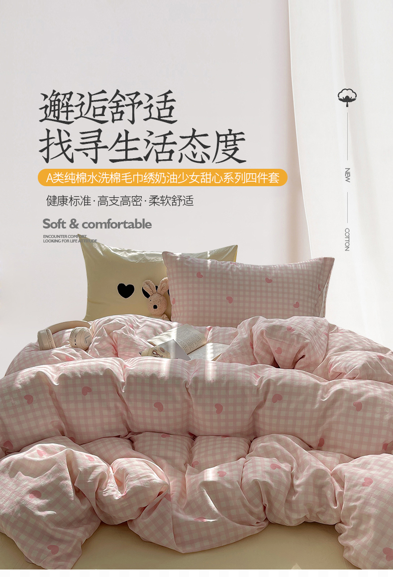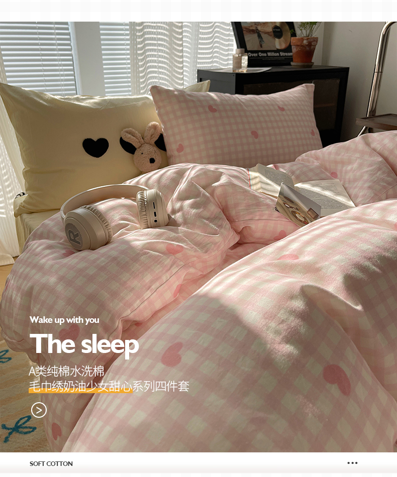 当前位置: 91家纺网 > 商品网购 > 床品套件 > 四件套 > 水洗棉四件套 > 桃子家居 2024新款A类纯棉水洗棉毛巾绣奶油少女甜心系列学生四件套 水洗棉-少女甜心粉粉+黄黄