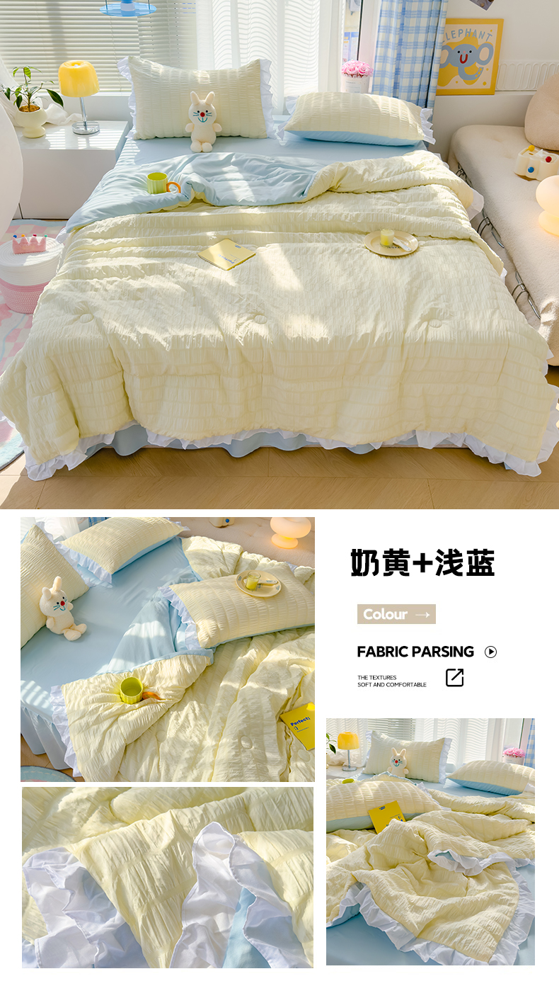 当前位置: 91家纺网 > 商品网购 > 床品套件 > 四件套 > 夏被四件套 > 颜选 2024新款泡泡纱花边夏被单品夏被四件套 奶黄+浅蓝