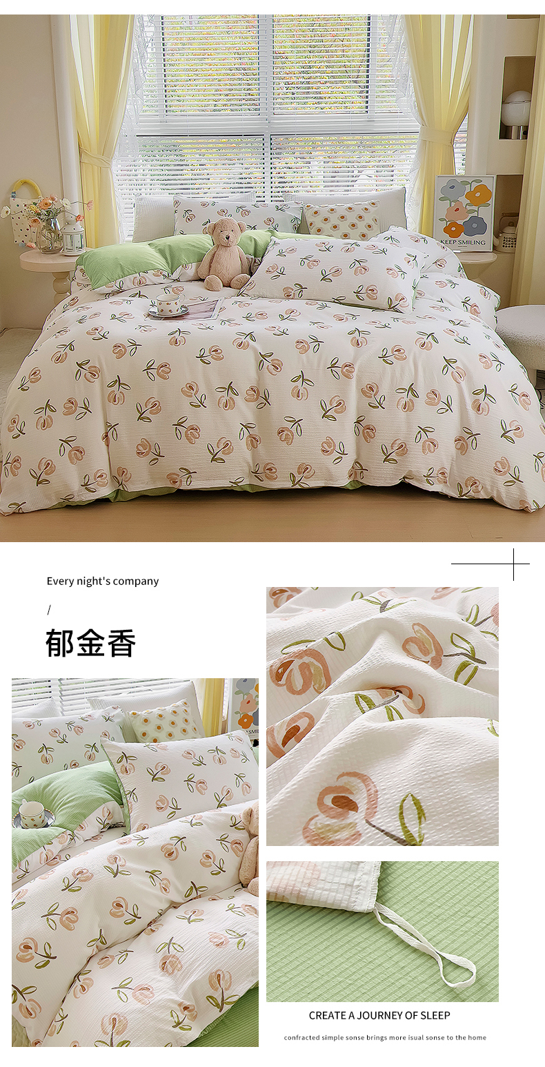 商品名称:氧家 2024新款水洗棉华夫格泡泡纱四件套 郁金香